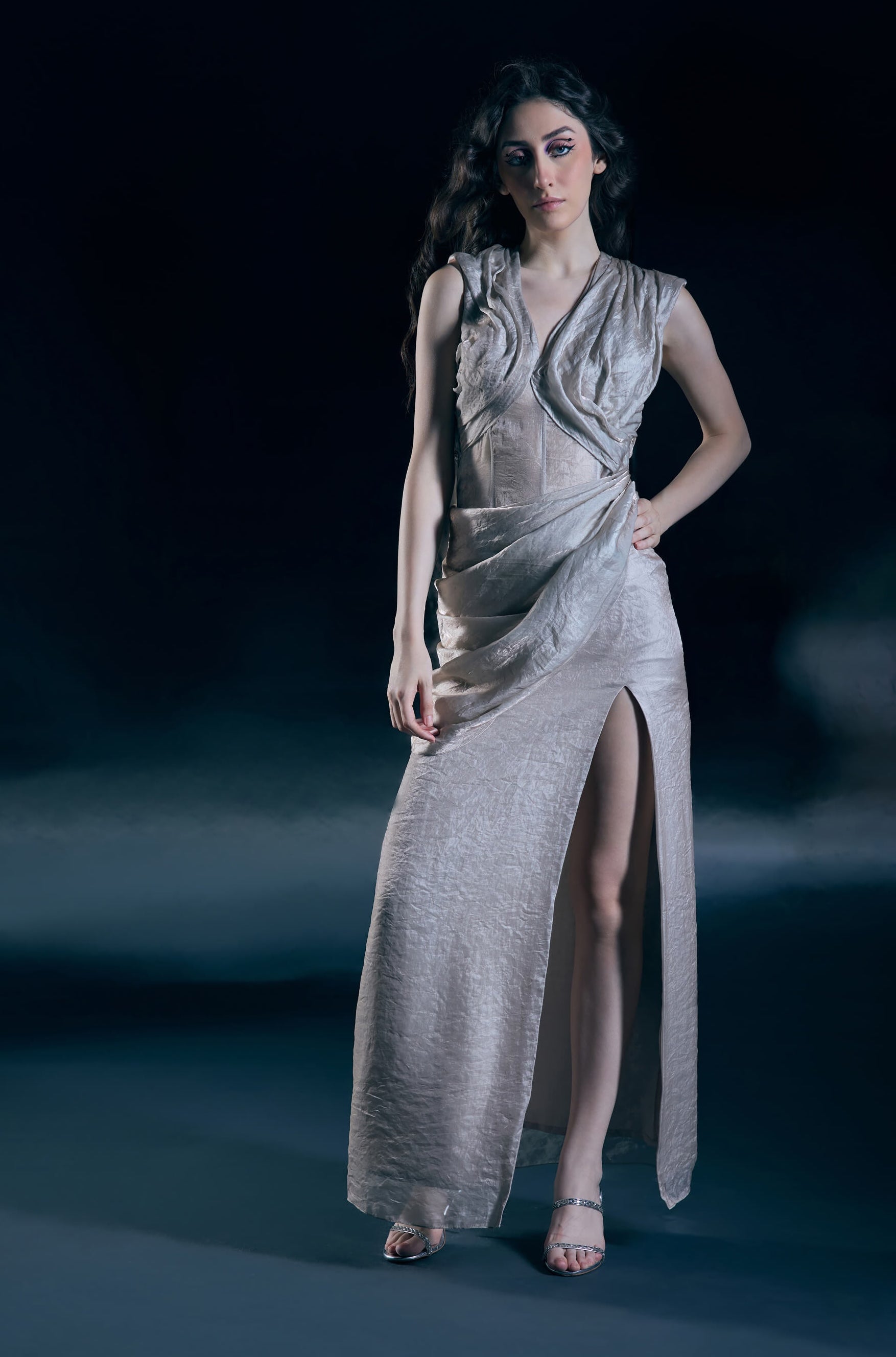 Designed as a one-of-a-kind piece, this pre-draped sari showcases a corseted waist, cascading side cowls, and a daring high slit in luminous duotone fabric.
