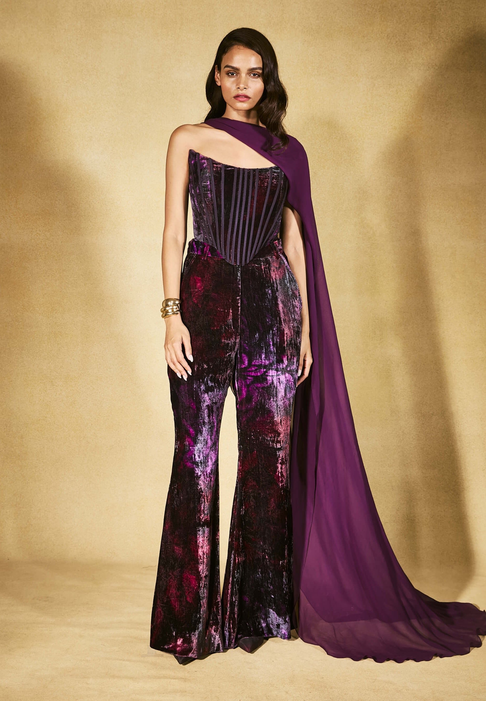 Sculpted with precision, this deep plum velvet corset is paired with textured flare trousers and finished with a versatile scarf, creating depth, confidence, and modern sophistication.