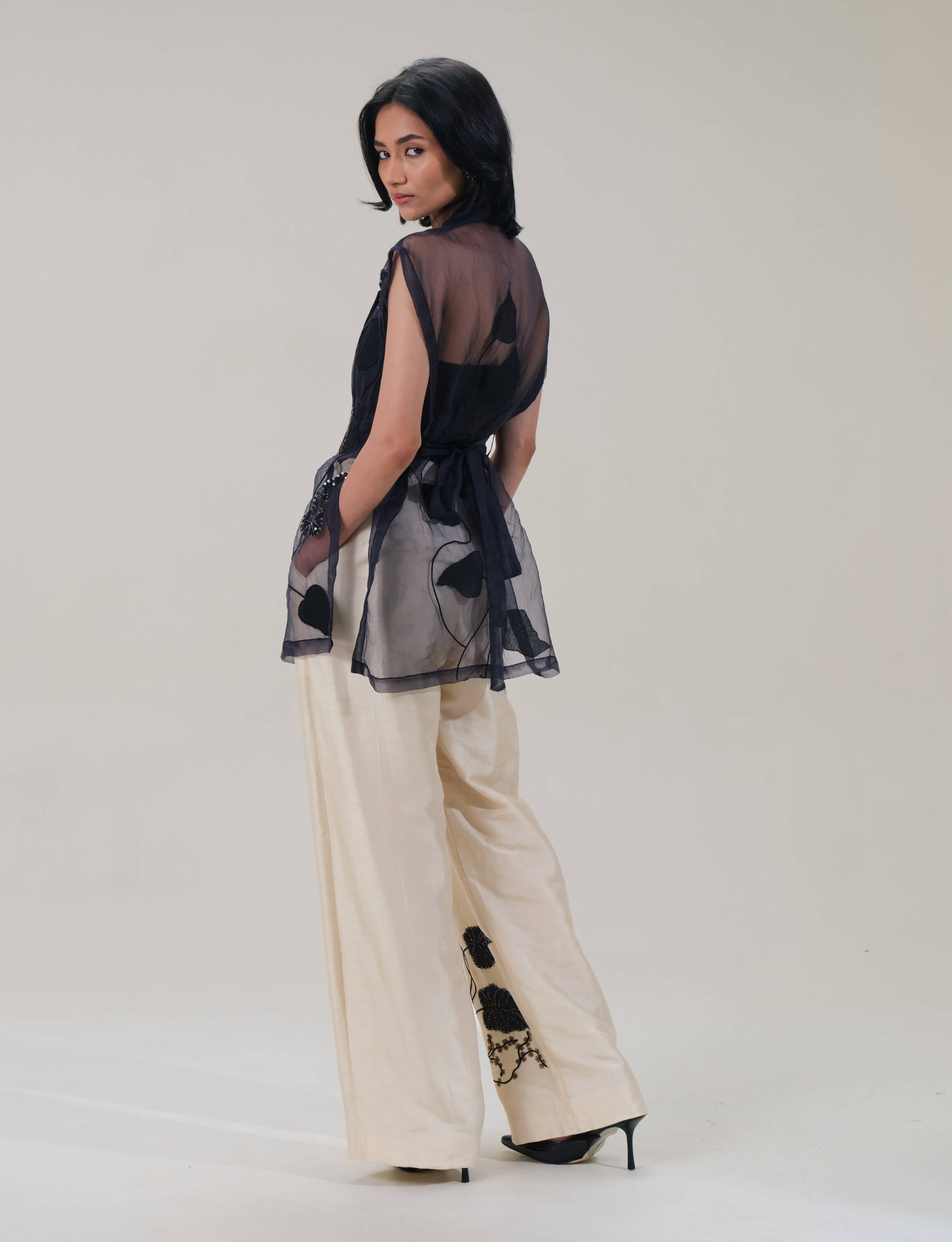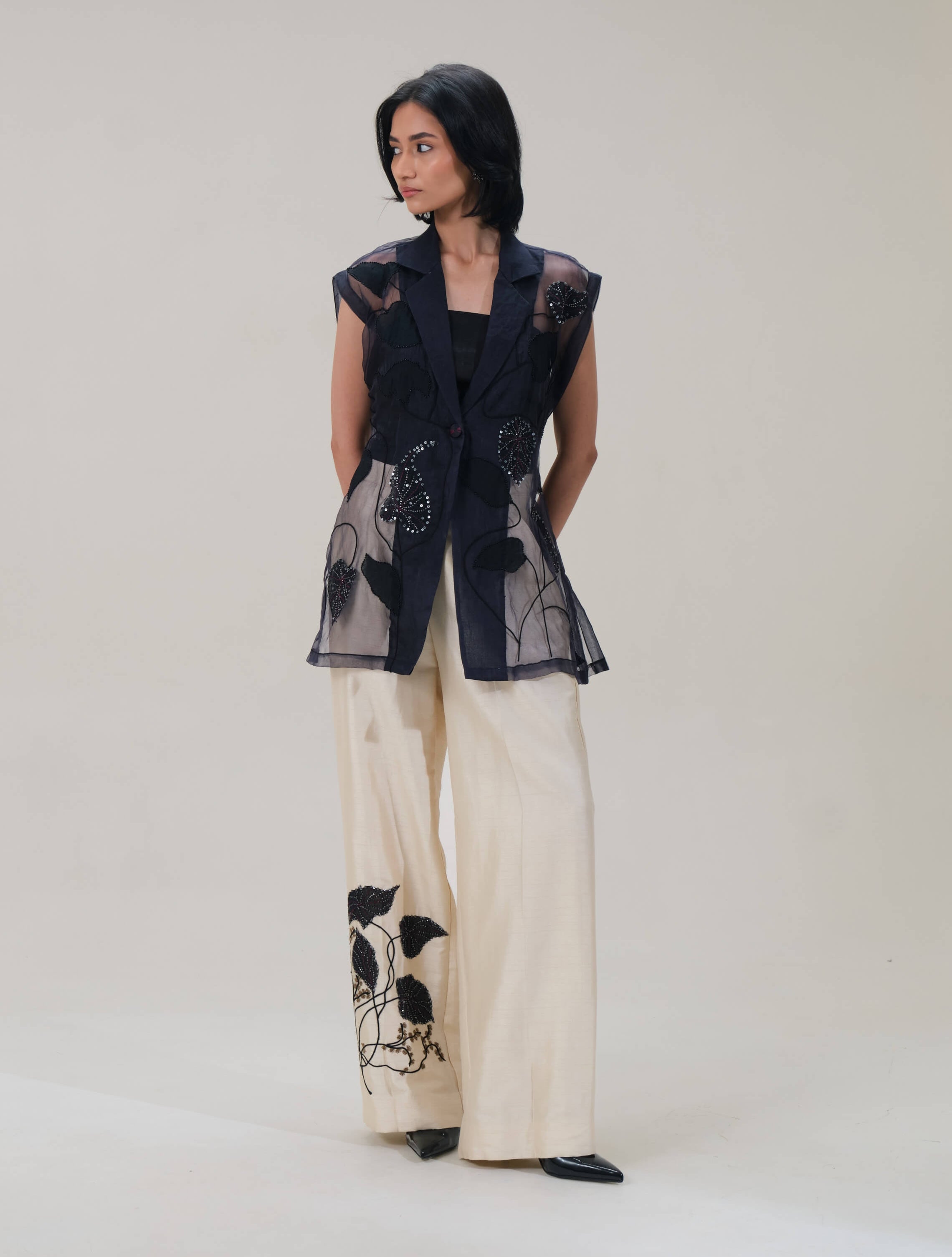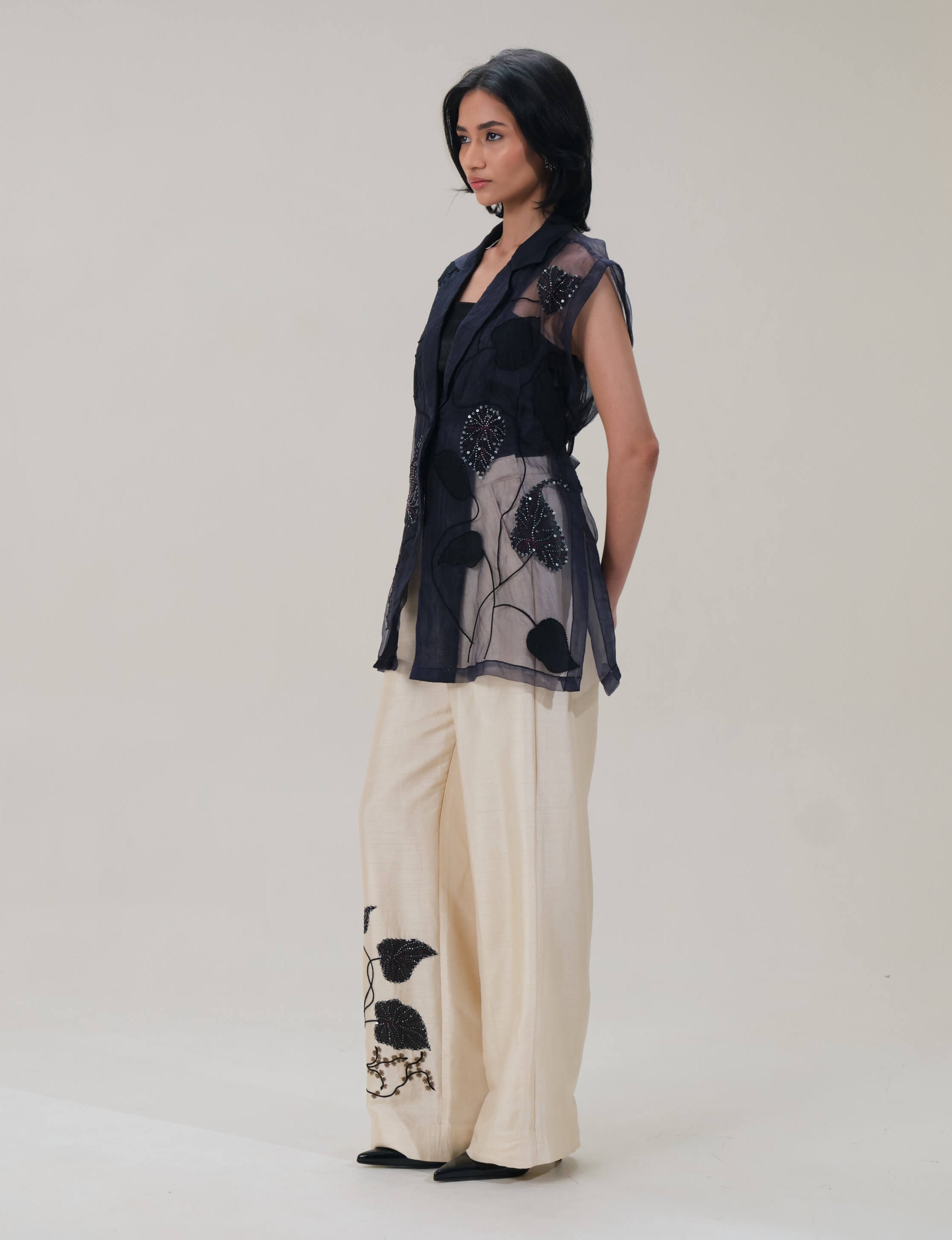 These wide-leg pants are crafted from smooth flat silk, offering a fluid drape and effortless comfort. Botanical embroidery with subtle sequin detailing along the hem adds depth and quiet shimmer, while the soft ivory tone ensures versatility for both festive and modern styling.