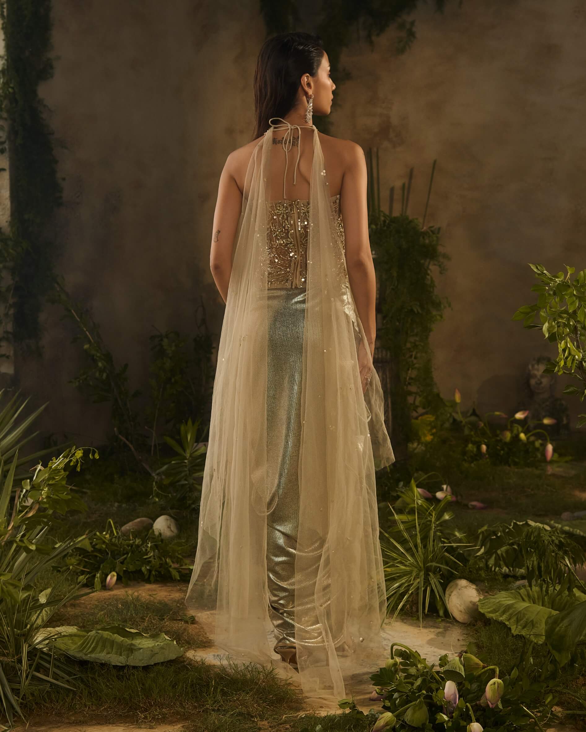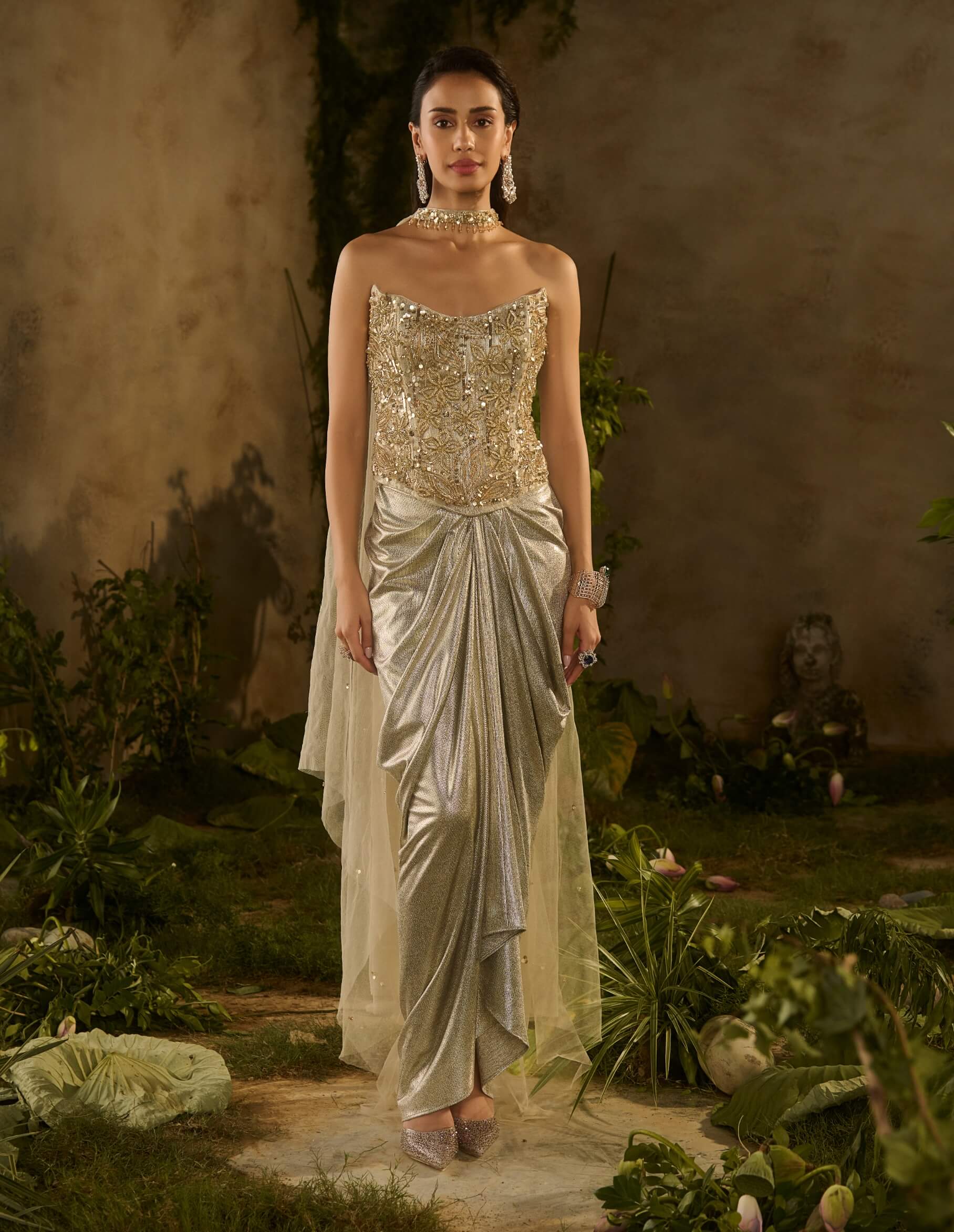 Draped in ethereal shine, the lunaria drape skirt set captivates with its corset-style strapless blouse. Rich embellishments of sequins, beads, and intricate embroidery add brilliance, while the flowing drape skirt completes the look. Perfect for receptions, modern weddings, or glamorous evening events, this champagne set exudes contemporary elegance.