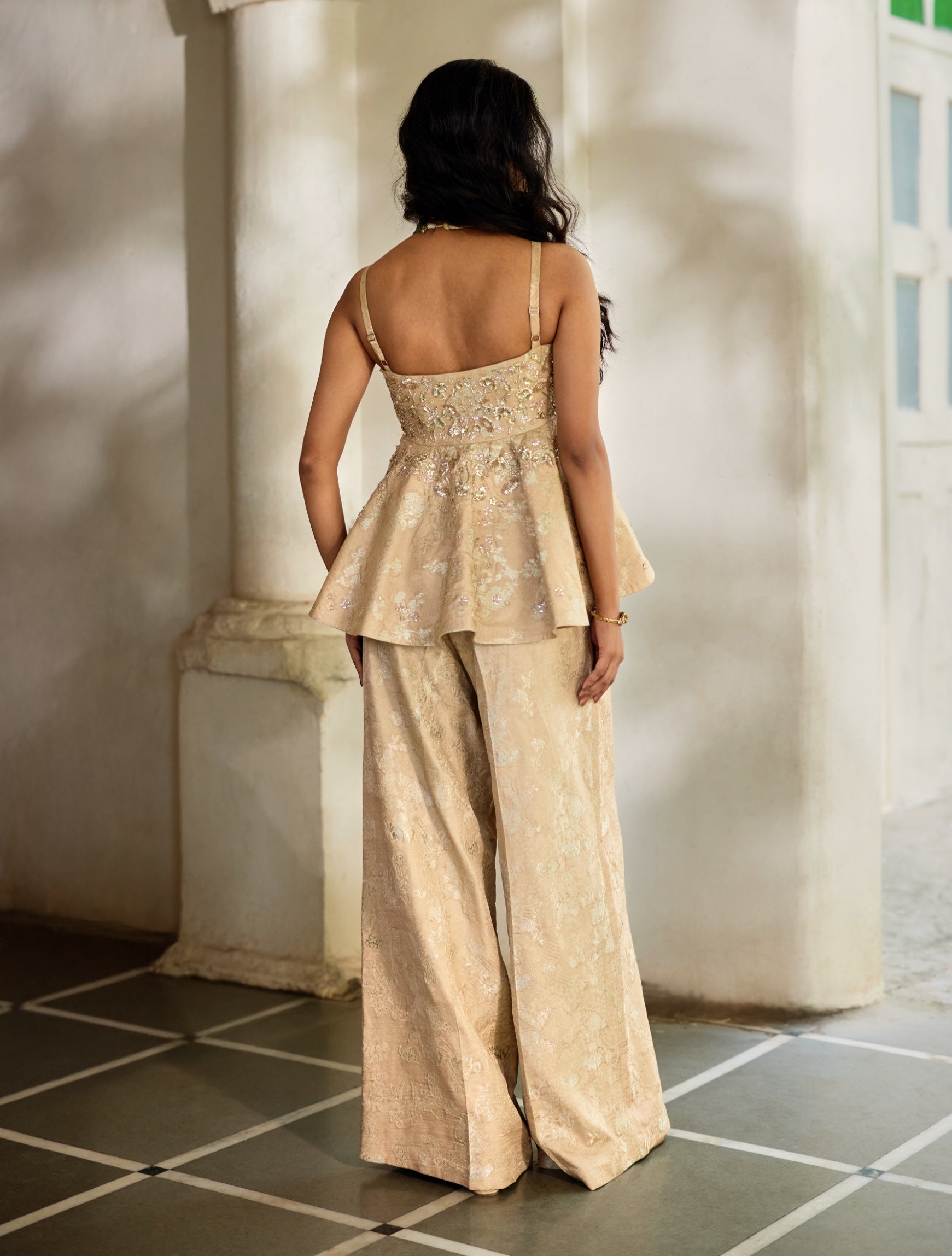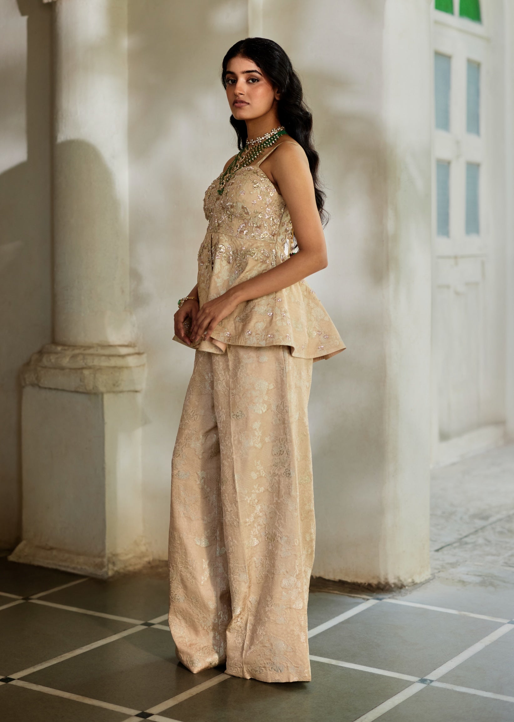 Crafted in luxurious jacquard, this statement peplum is adorned with intricate hand embroidery and paired with tailored pants for elevated festive dressing.
