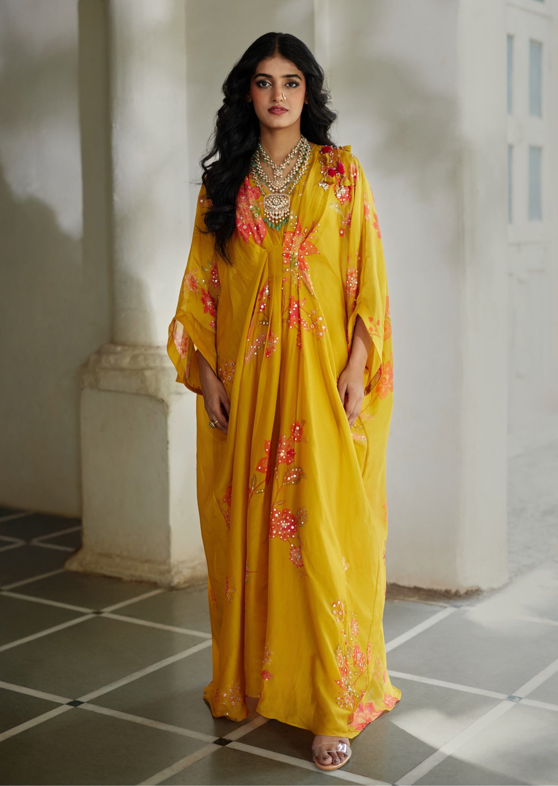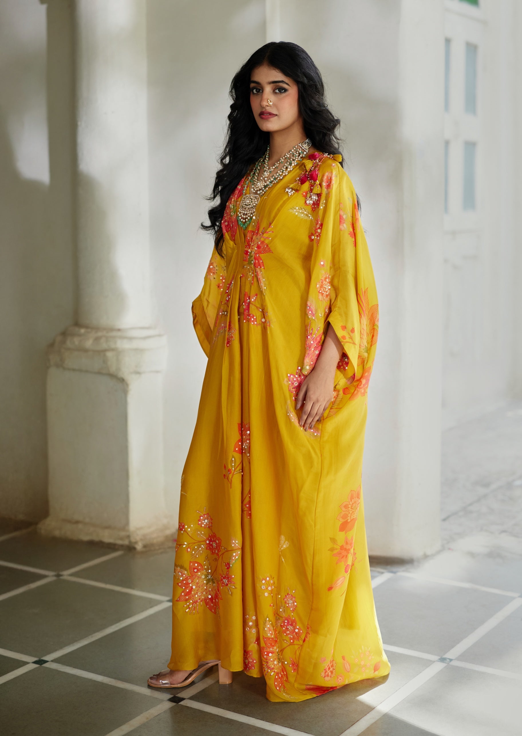 Infused with playful charm, this bright yellow kaftan features vibrant floral prints, subtle sequin highlights, and hand-tucked tassels for relaxed elegance.