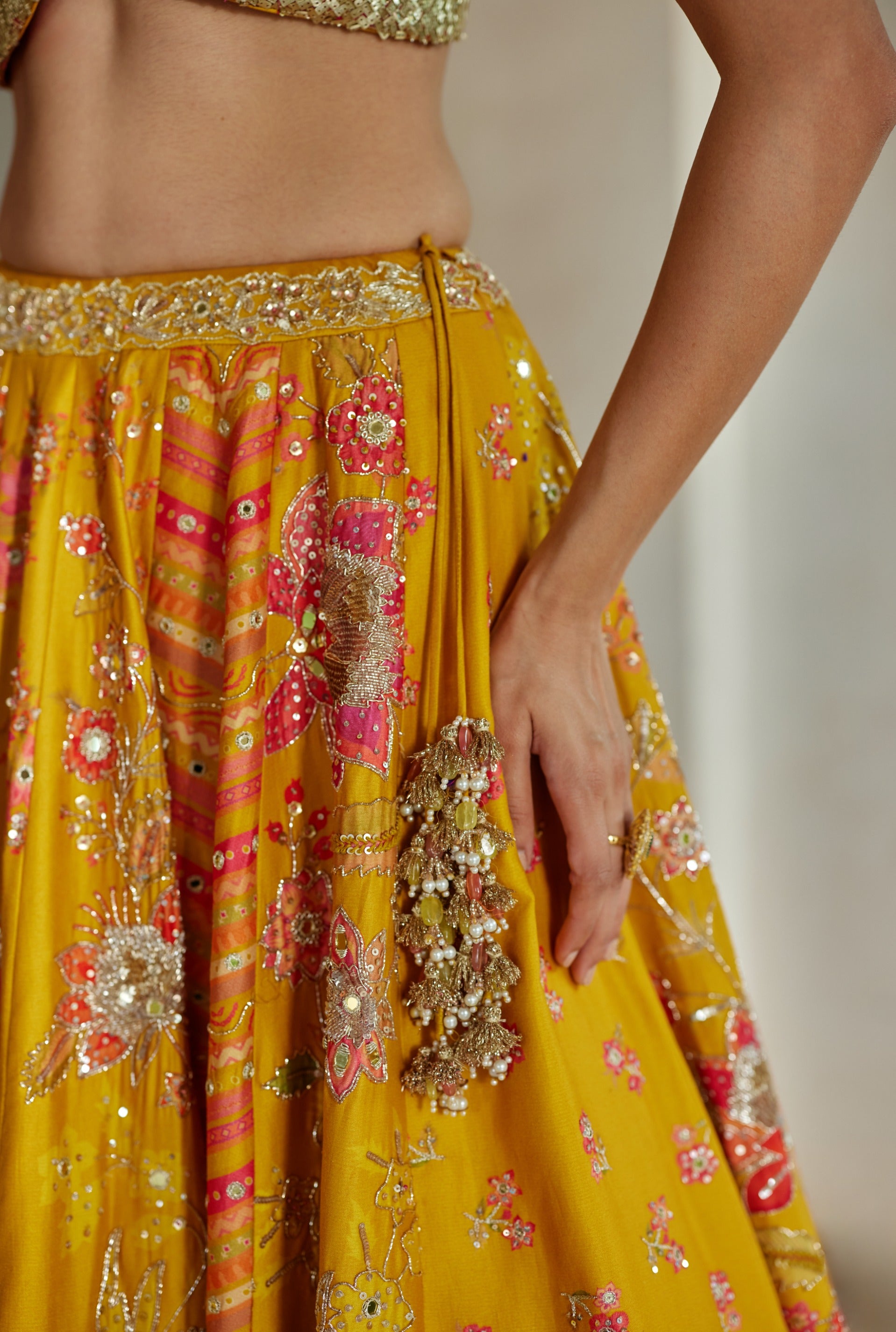 Showcasing signature florals, this yellow multi-tone lehenga features intricate hand embroidery and is paired with an embroidered blouse and scallop-edged dupatta.