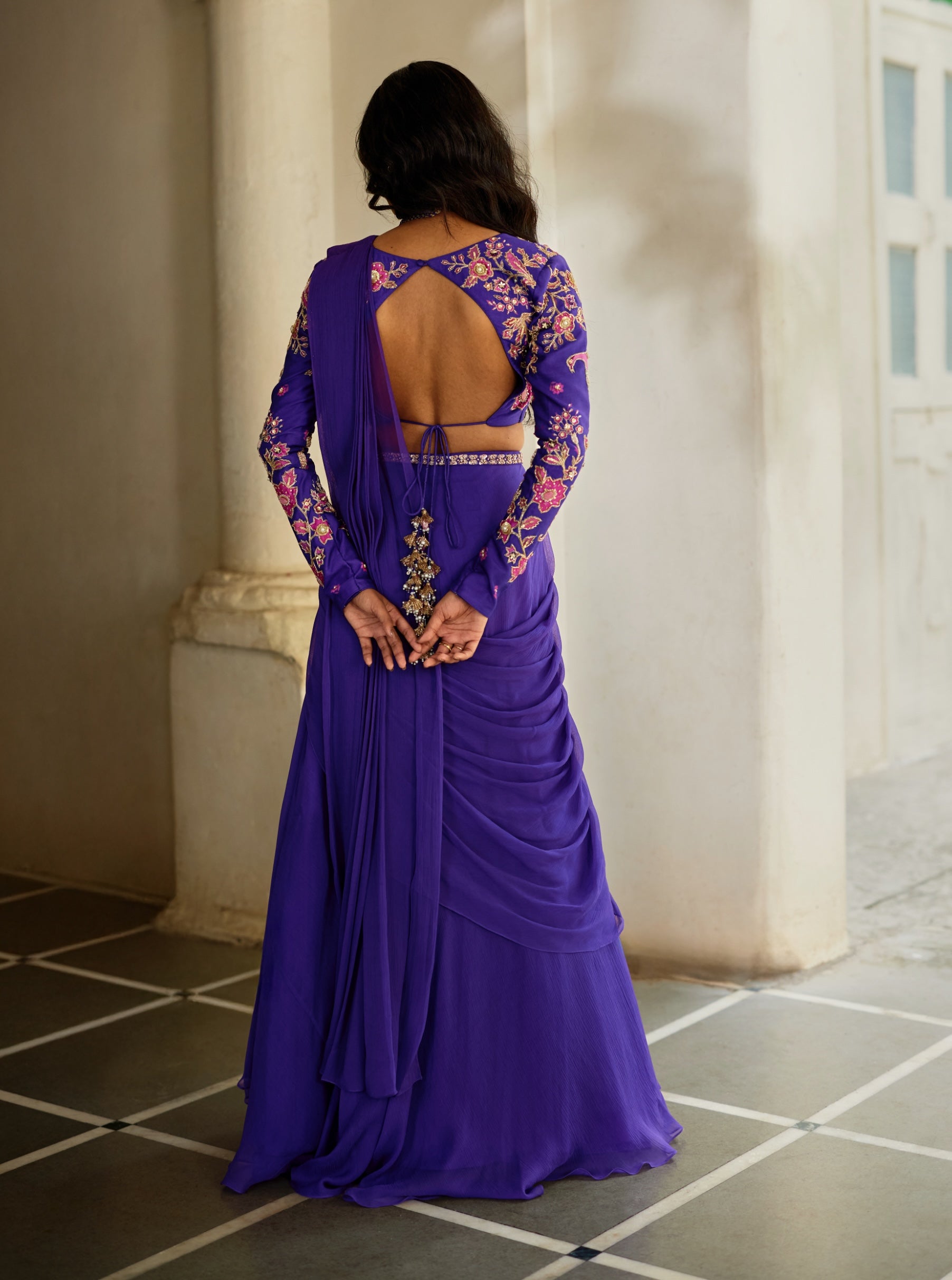 Grape jelly chiffon pre-draped sari set