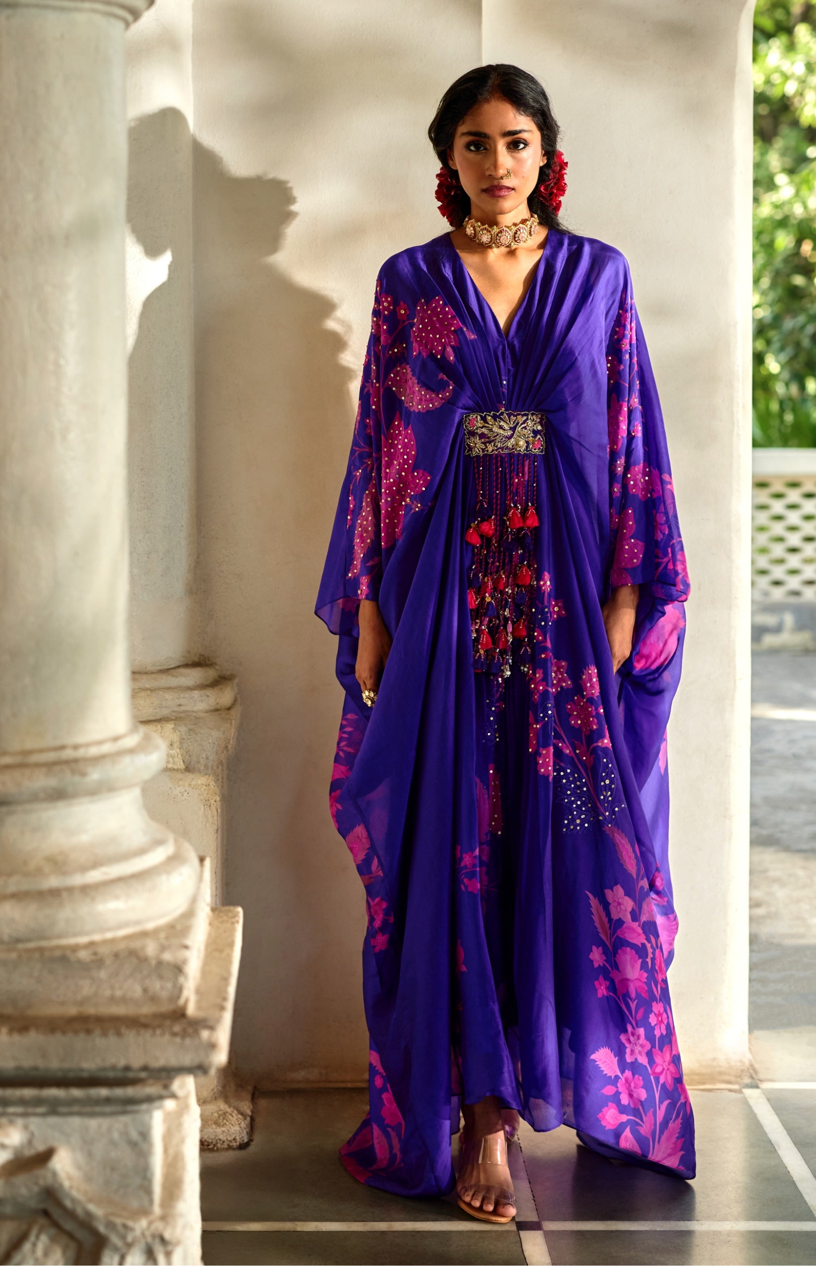 Lightweight and effortless, this purple printed kaftan features delicate sequin hand embroidery at the center for understated elegance.