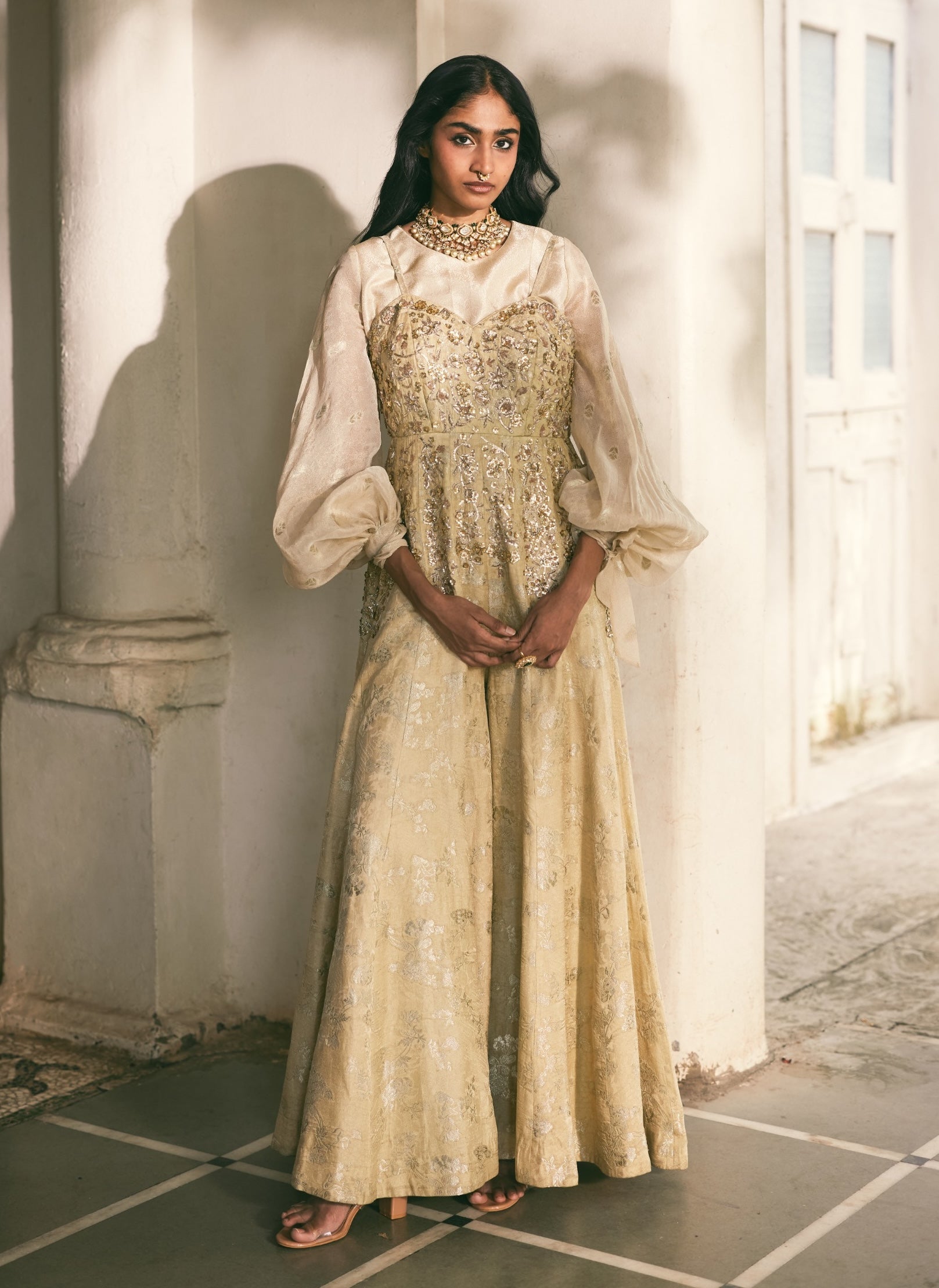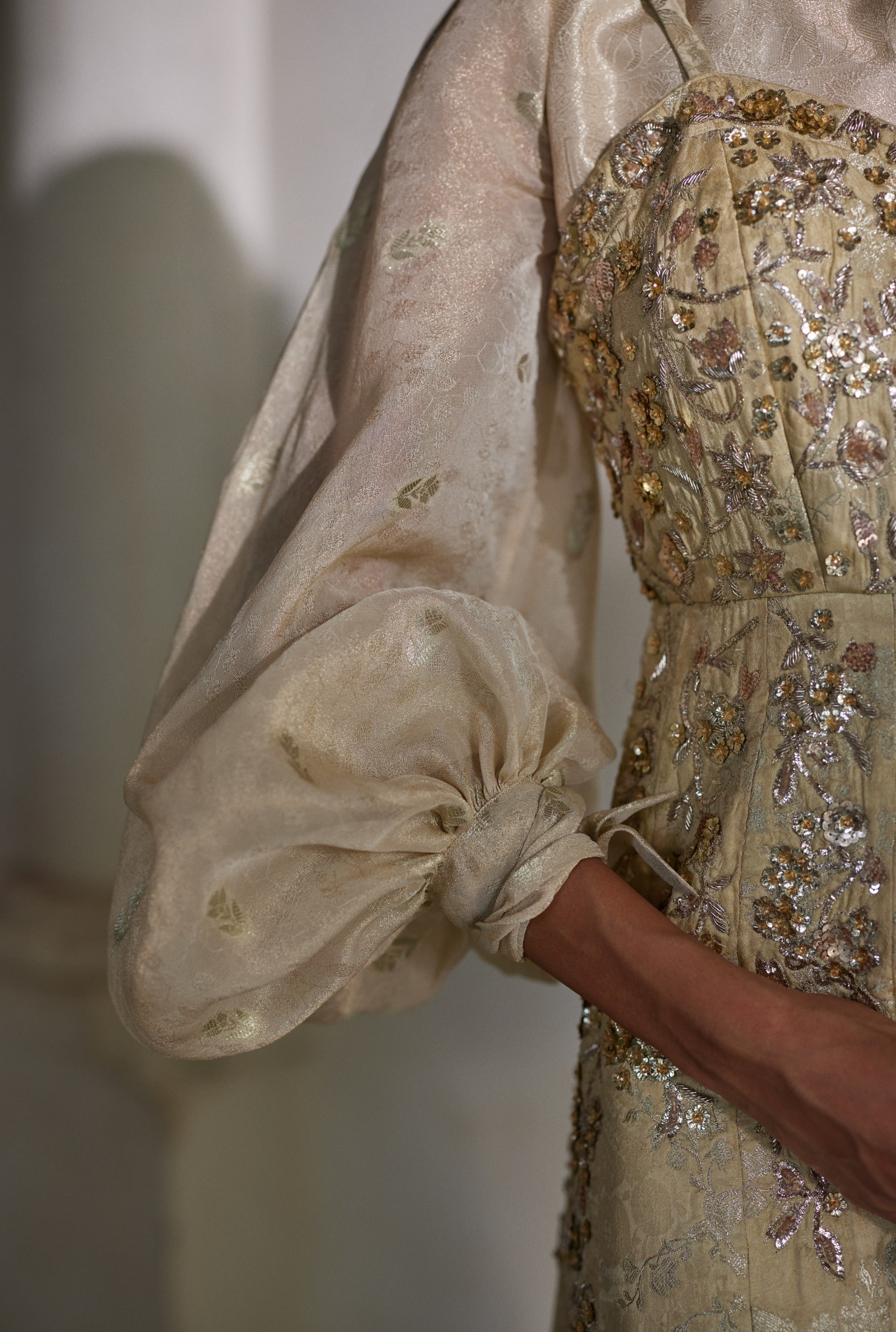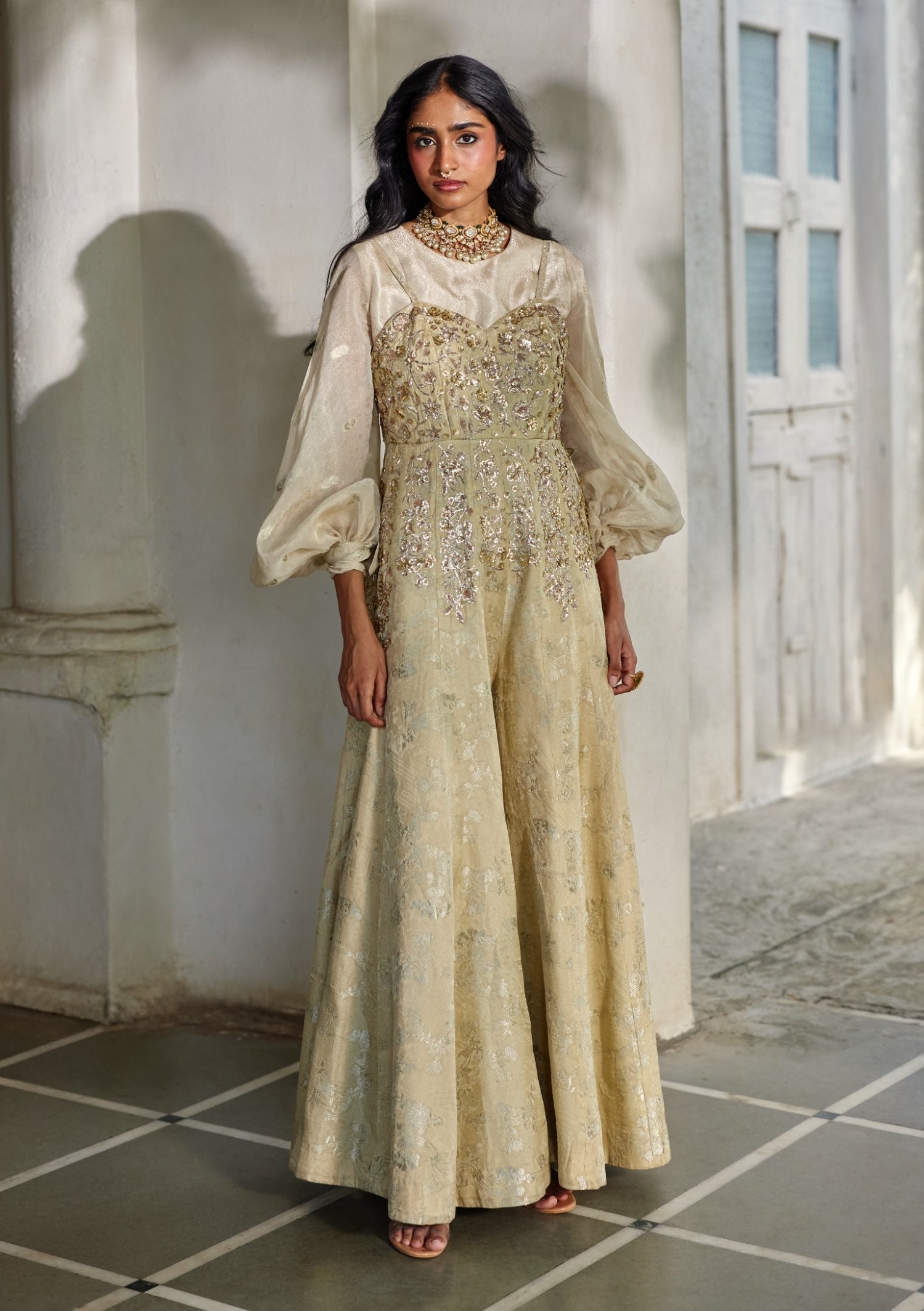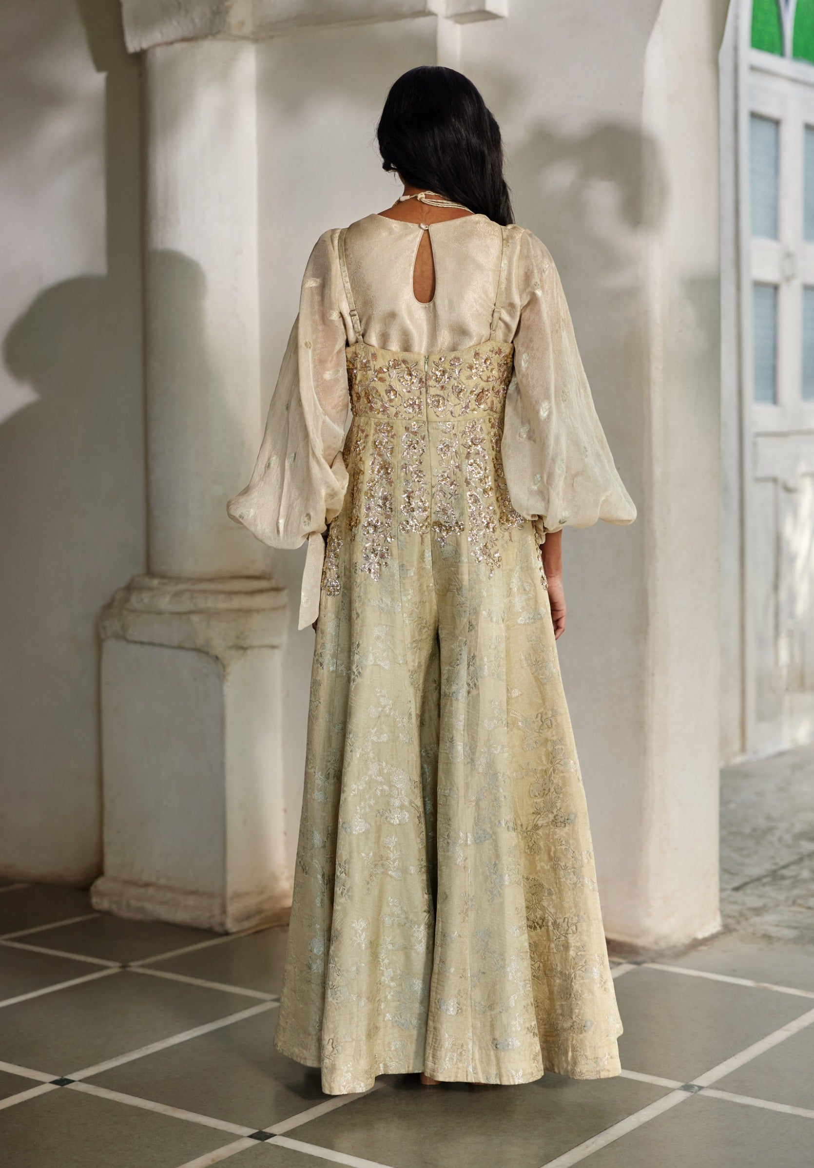 Minimal yet striking, this silver jacquard jumpsuit features a contemporary sleeveless silhouette highlighted by a cascading hand-embroidered zardozi yoke.