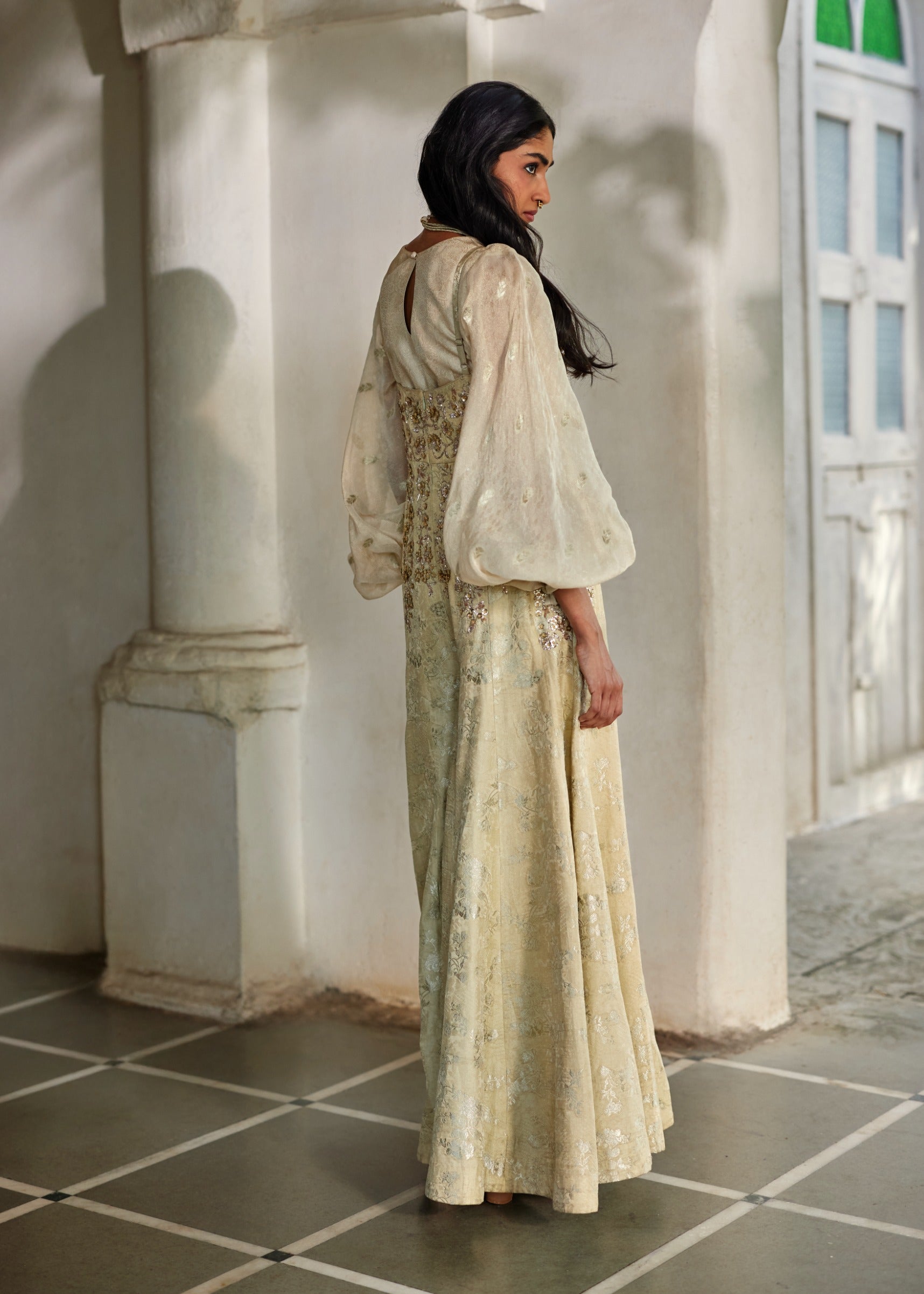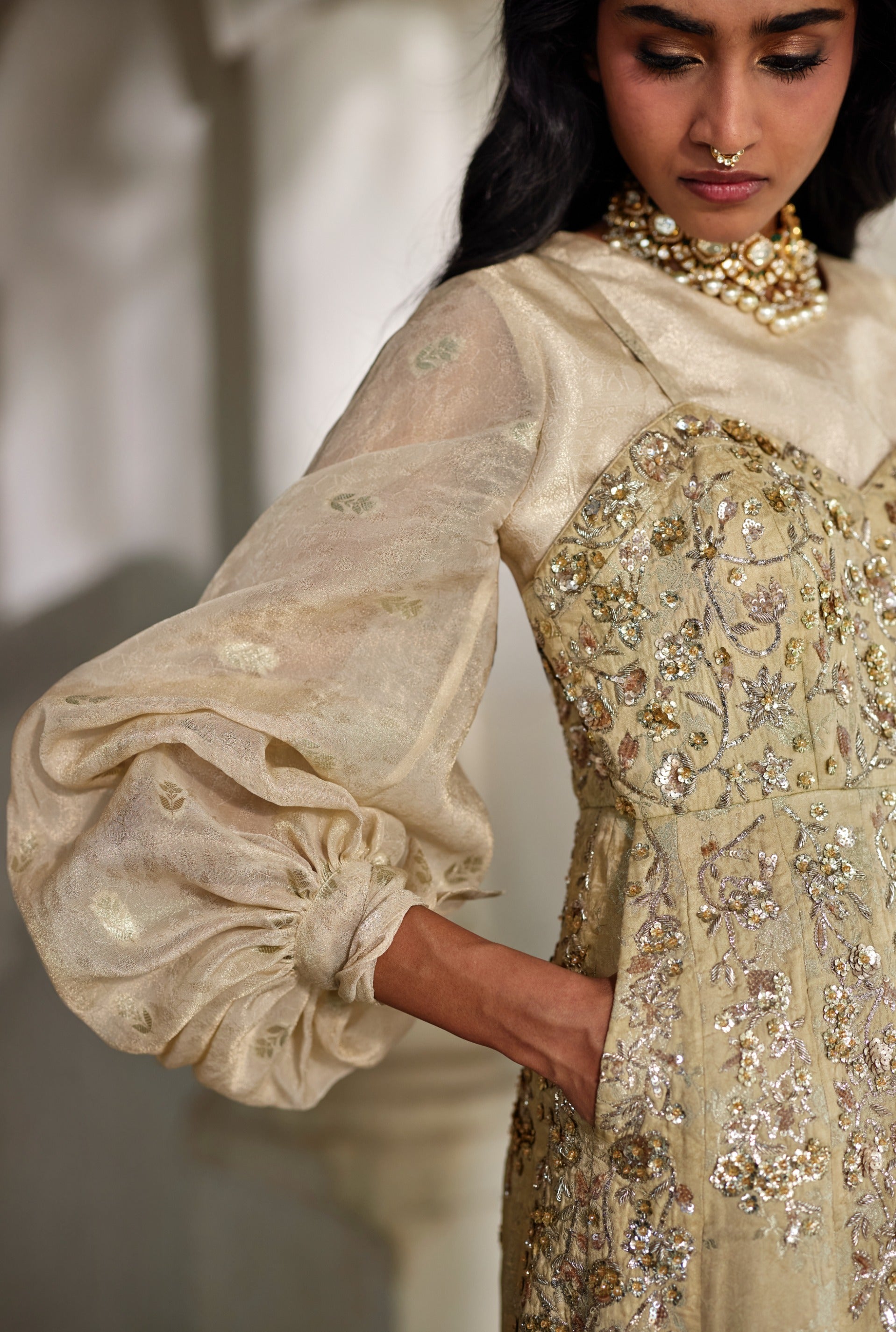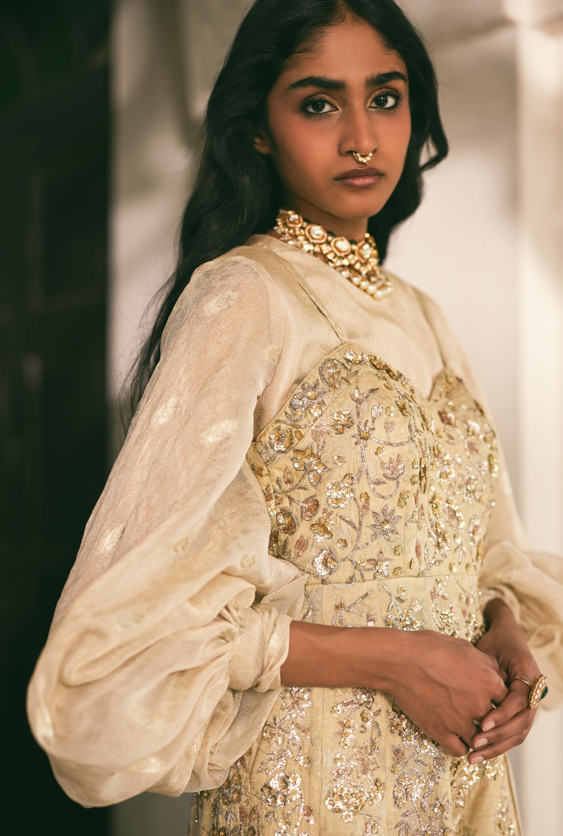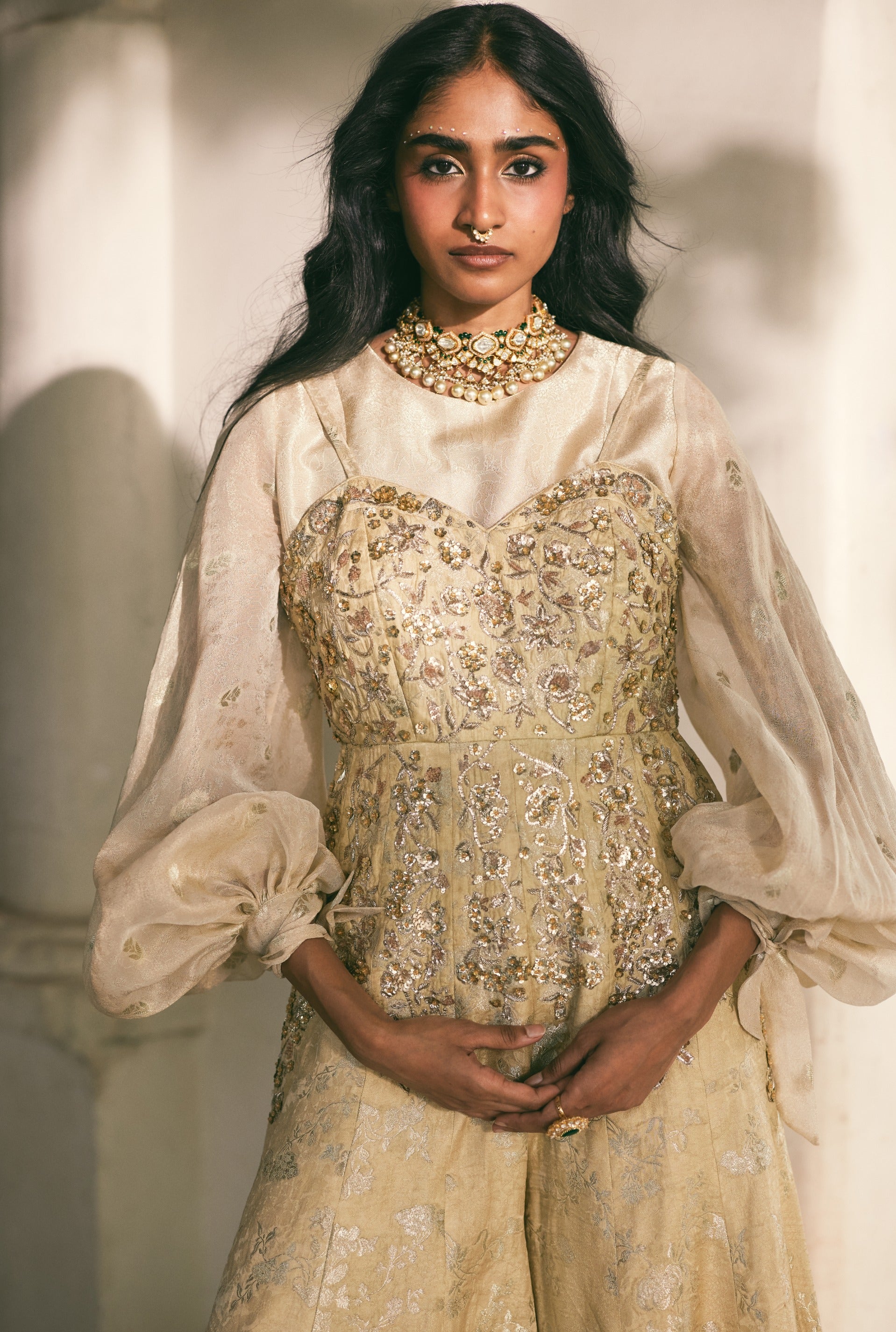 Minimal yet striking, this silver jacquard jumpsuit features a contemporary sleeveless silhouette highlighted by a cascading hand-embroidered zardozi yoke.