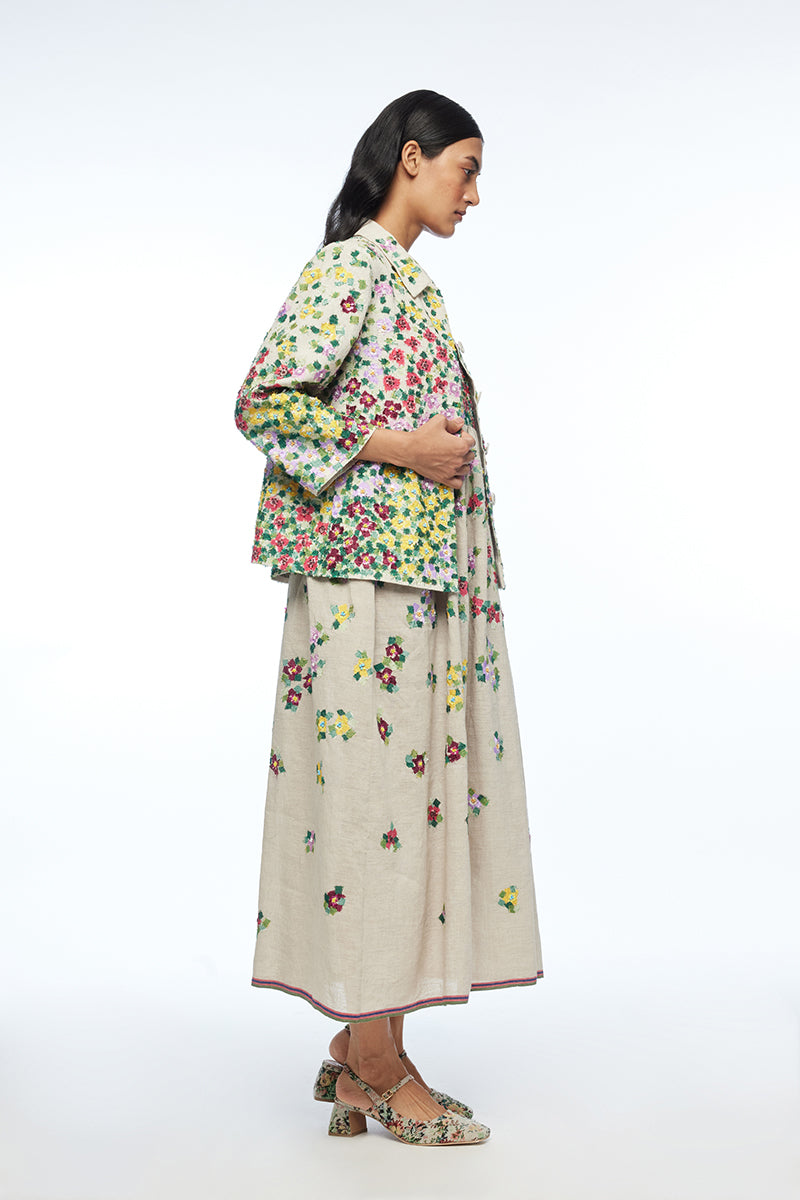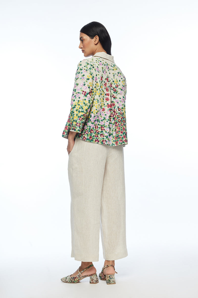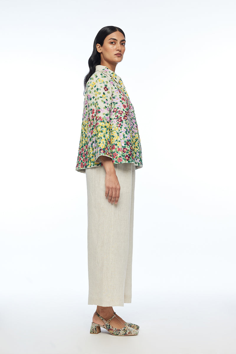 Discover architectural elegance in the iberica jacket, crafted in a structured a-line silhouette. The shirt collar, open sleeves, and concealed placket frame its multi-abstract appliqué embroidery beautifully. Versatile and polished, it’s perfect for contemporary workwear, day events, or urban evenings.