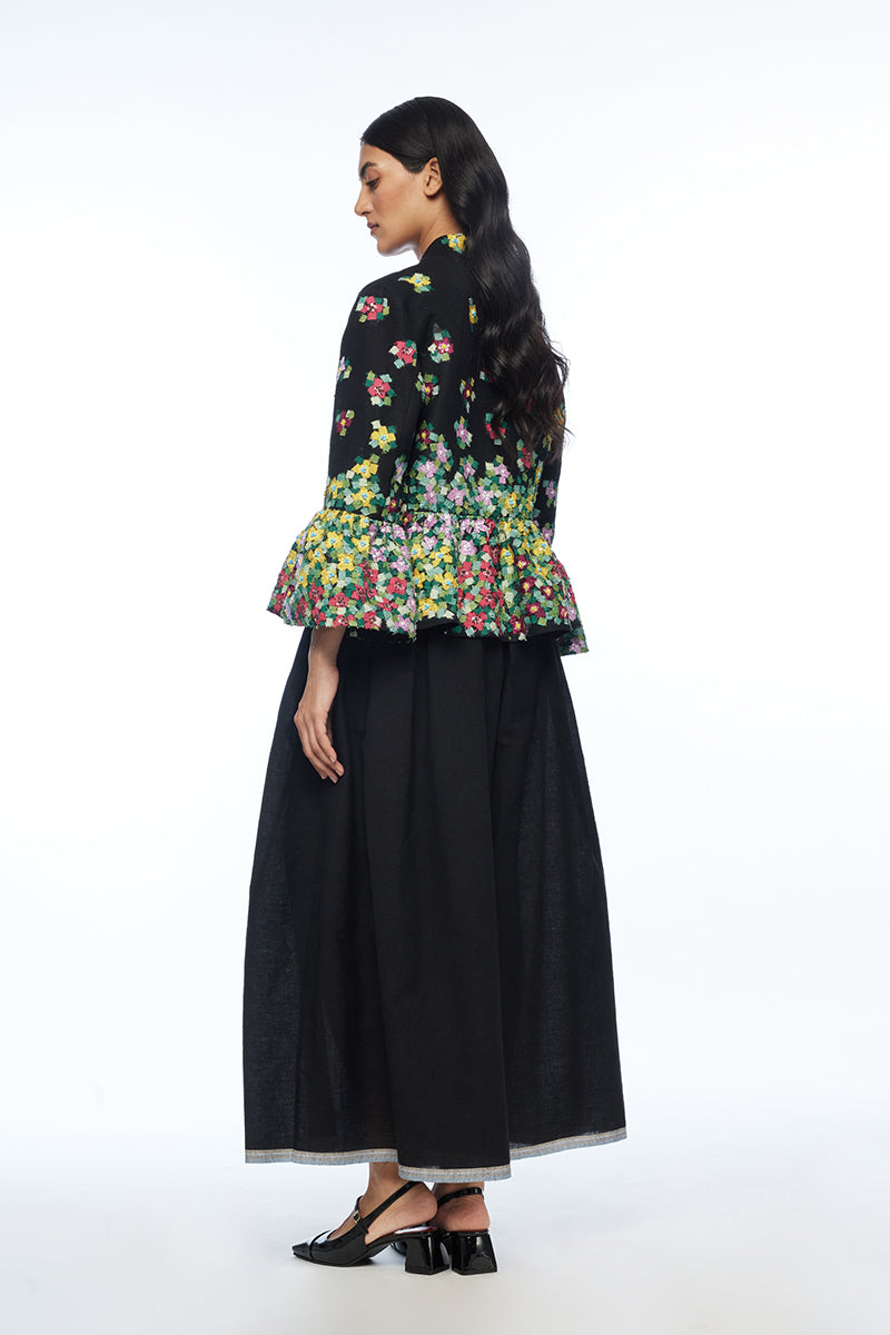 Redefine contemporary femininity with the isaevii jacket, a masterpiece of texture and silhouette. The peplum-inspired design with gathered waist and sleeves is accentuated with expressive multi-abstract appliqué embroidery. Designed for cocktail nights, art previews, or elevated work gatherings, this open jacket moves gracefully from day to dusk.