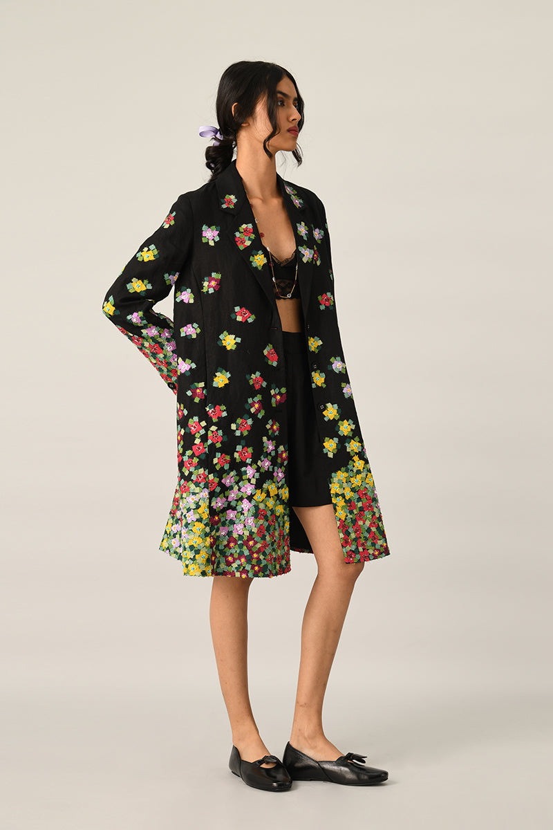 Command attention in the polliniana jacket — a striking knee-length piece defined by sculptural craftsmanship. Its multi-abstract appliqué embroidery and classic three-button front evoke a sense of artistic rebellion and poise. Ideal for curated events, creative showcases, or statement evening layering, it balances form and fluidity with ease.