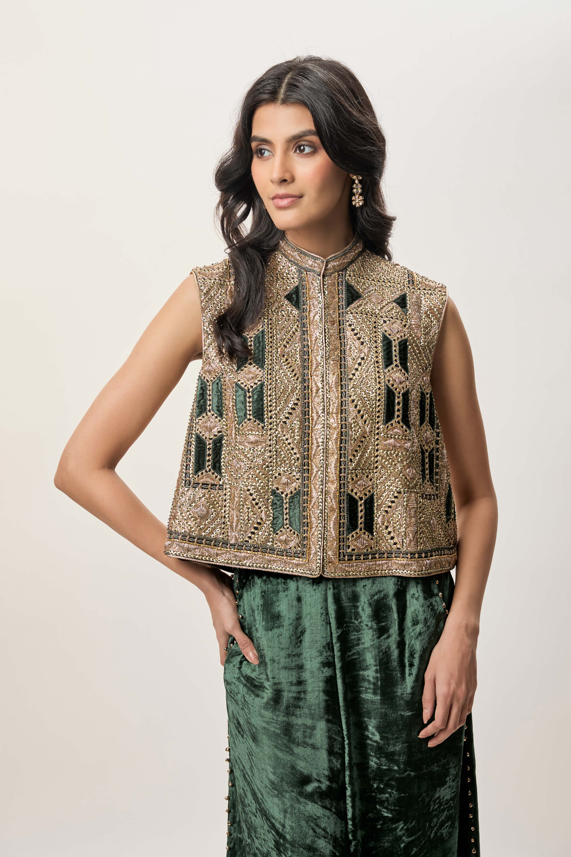 An emerald green embroidered georgette jacket featuring a sleek sleeveless cut. Designed with a high neckline and open-front silhouette. Paired with velvet balloon pants for dramatic volume. Bead edging along the seams adds refined detailing.