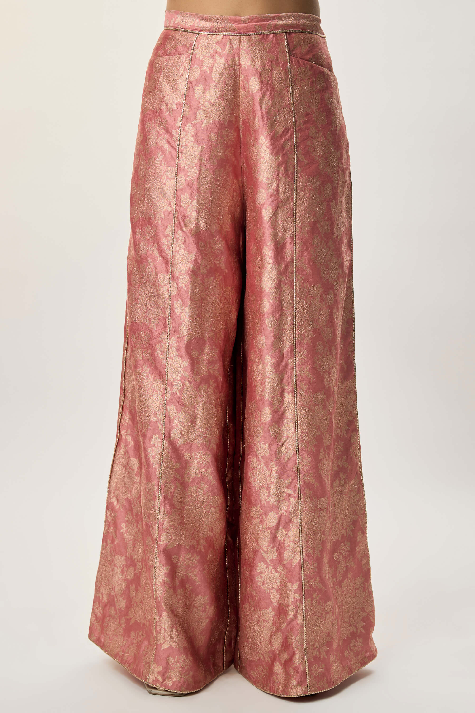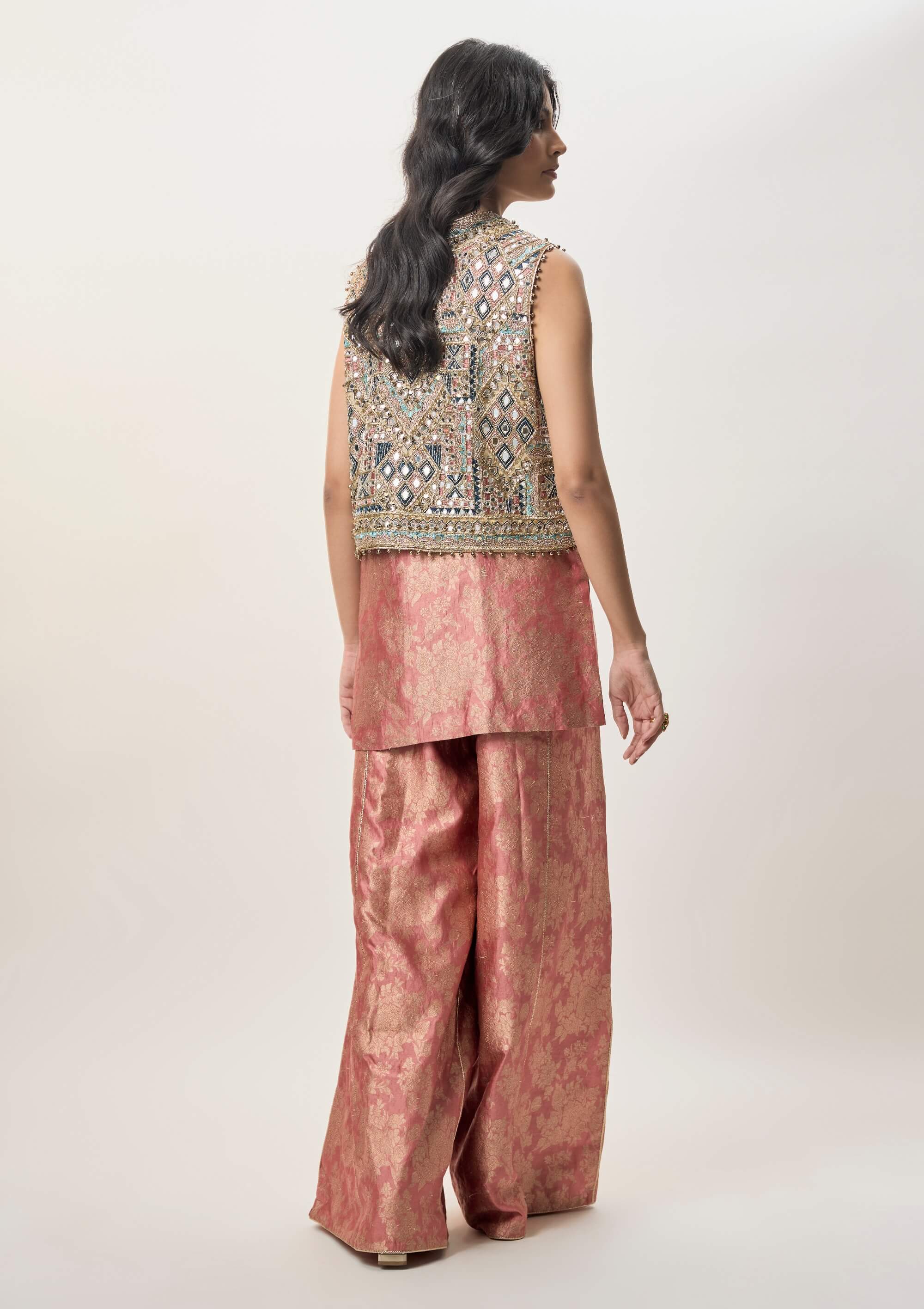 A stone georgette embroidered waistcoat layered over a Banarasi brocade kurta. The contrast of textures adds depth and richness. Paired with matching brocade pants for a cohesive look. A modern take on classic festive layering.