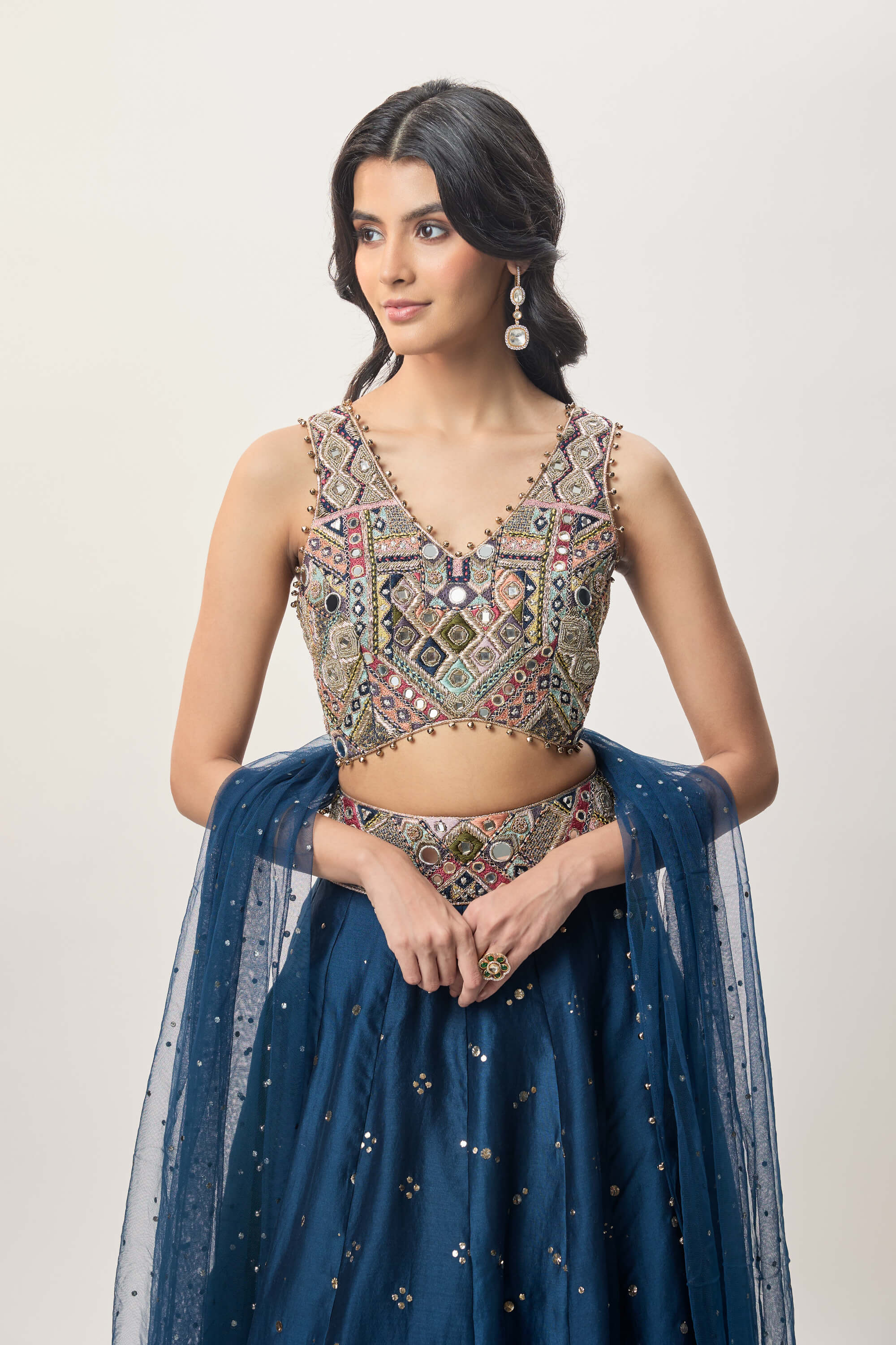 A navy blue georgette choli highlighted with multicolour embroidery and mirrors. Paired with a silkmul lehenga featuring an embroidered waistband. Mukaish dot detailing adds subtle shimmer throughout. Finished with a sheer mukaish net dupatta.