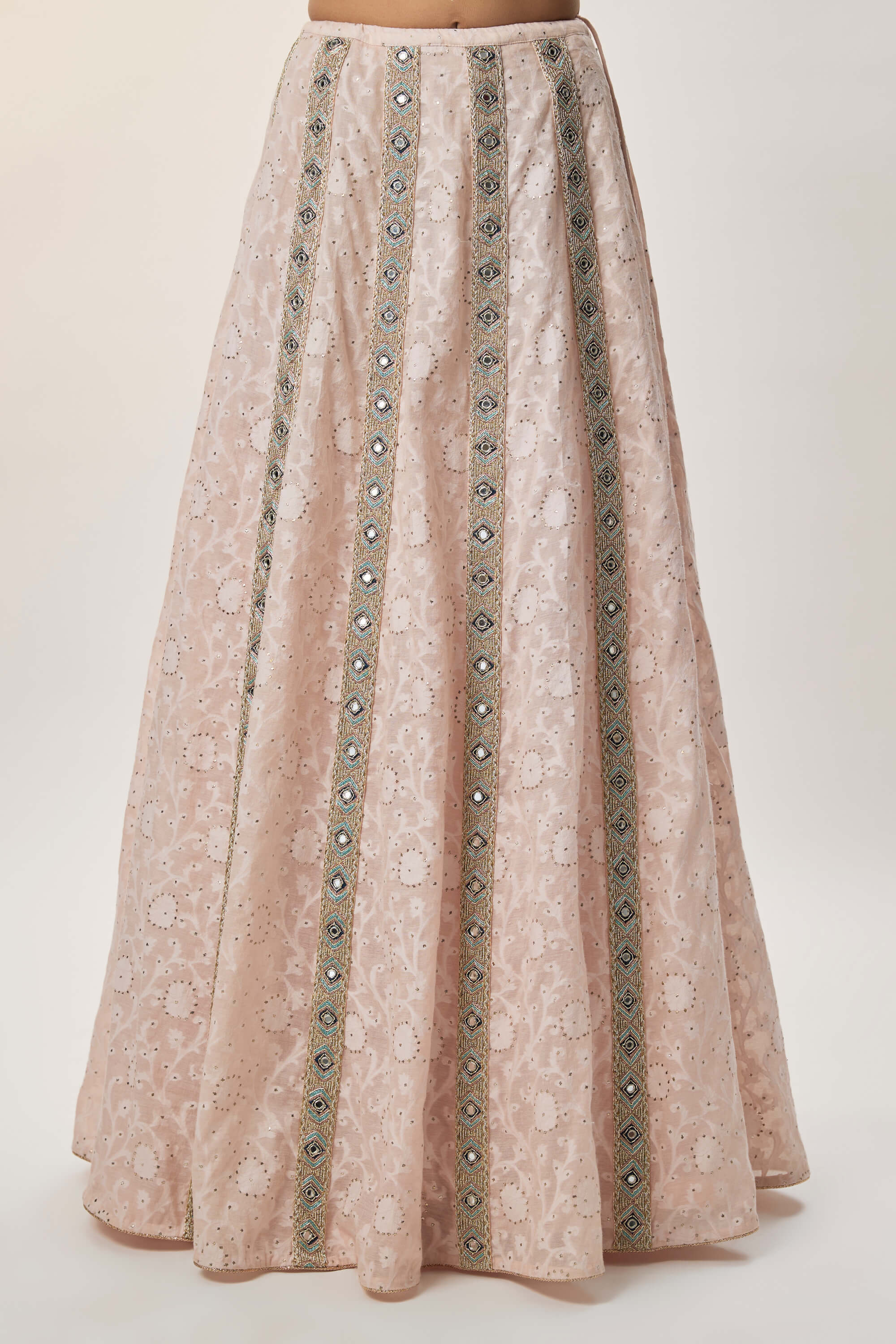 A blush pink embroidered georgette choli with intricate multicolour threadwork. Designed with a half-covered back and braided tassel tie-ups. Paired with a katarwa lehenga featuring embroidered panels. A romantic silhouette with handcrafted detail.