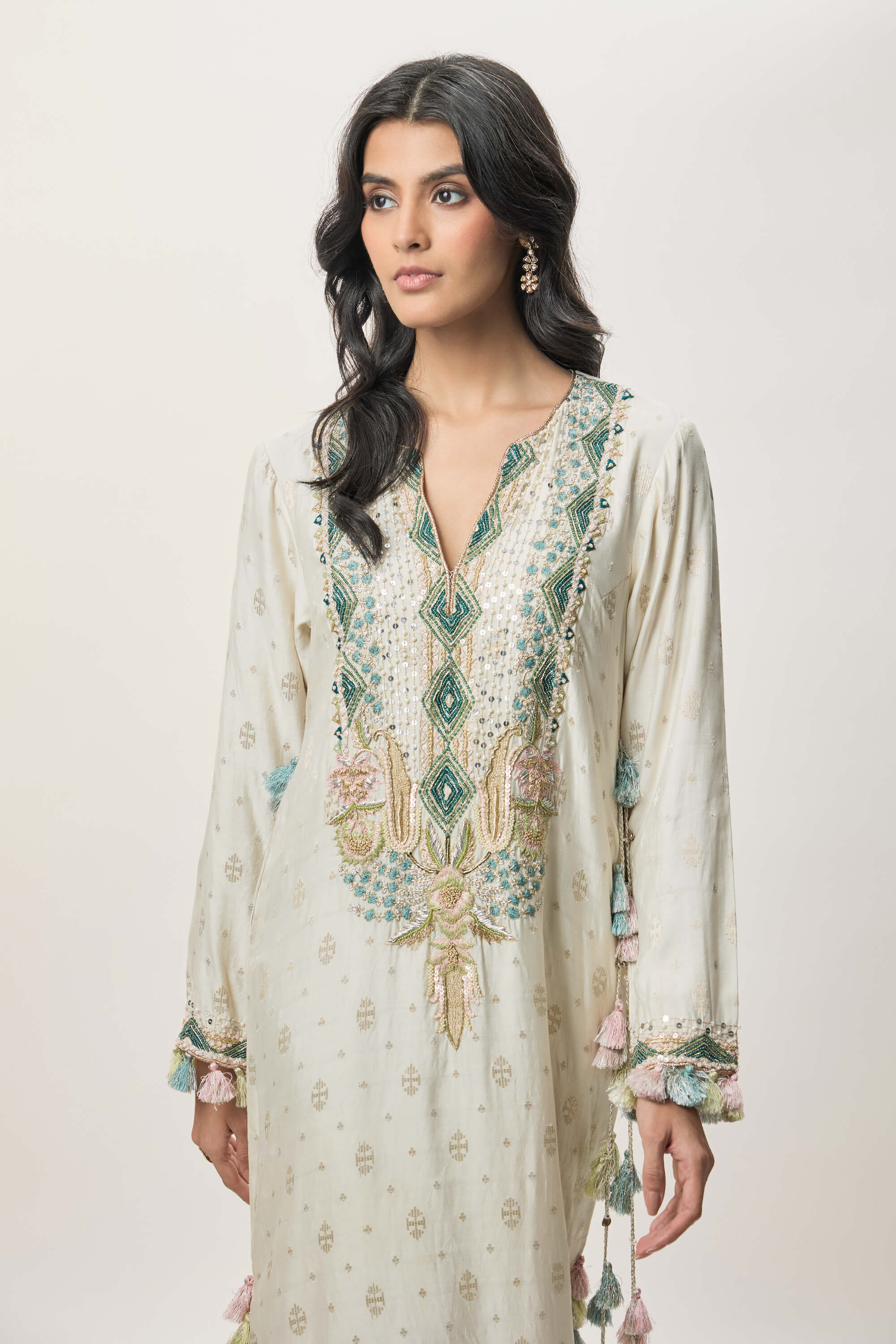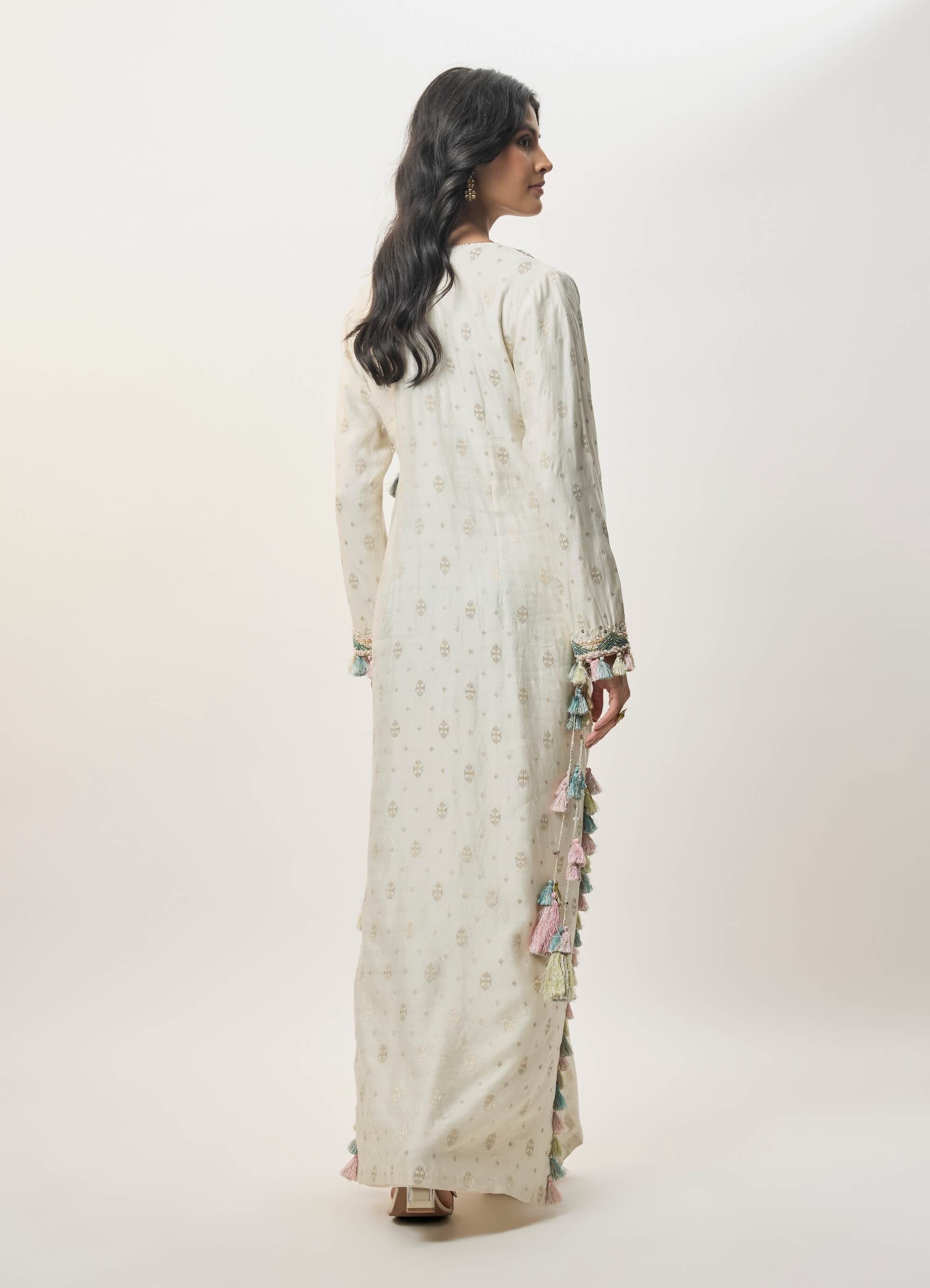 An off-white chiniya silk beyza kaftan featuring delicate embroidered butti detailing. Designed with a relaxed yet refined silhouette. Multicolour tassels accent the side slit and cuffs. A graceful blend of comfort and craftsmanship.
