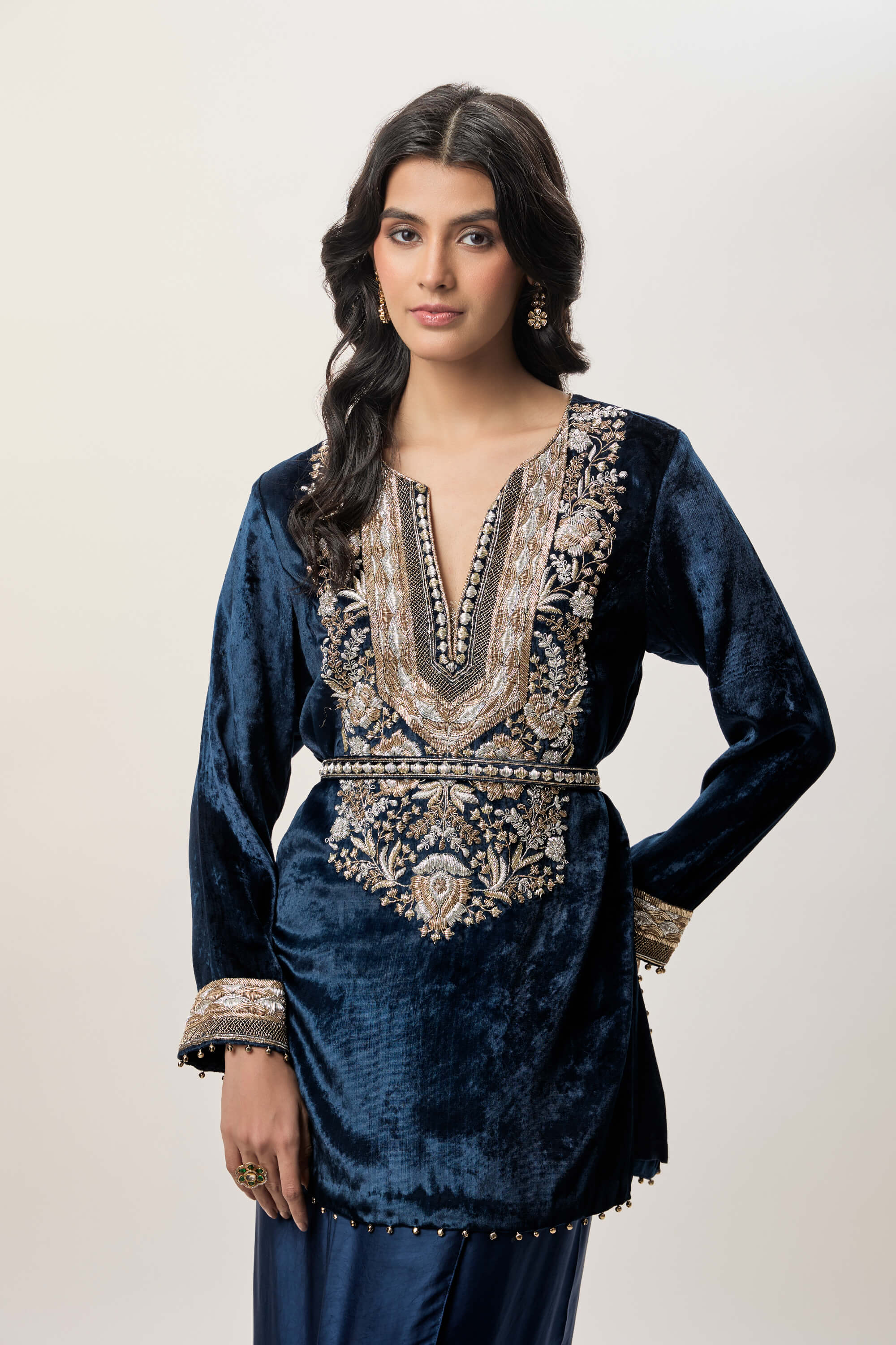A navy blue velvet kurta featuring an embroidered yoke in gold and silver tones. Detailed cuffs and a beaded hem enhance the design. Paired with a fluid modal satin dhoti skirt. Finished with a matching velvet embroidered belt.