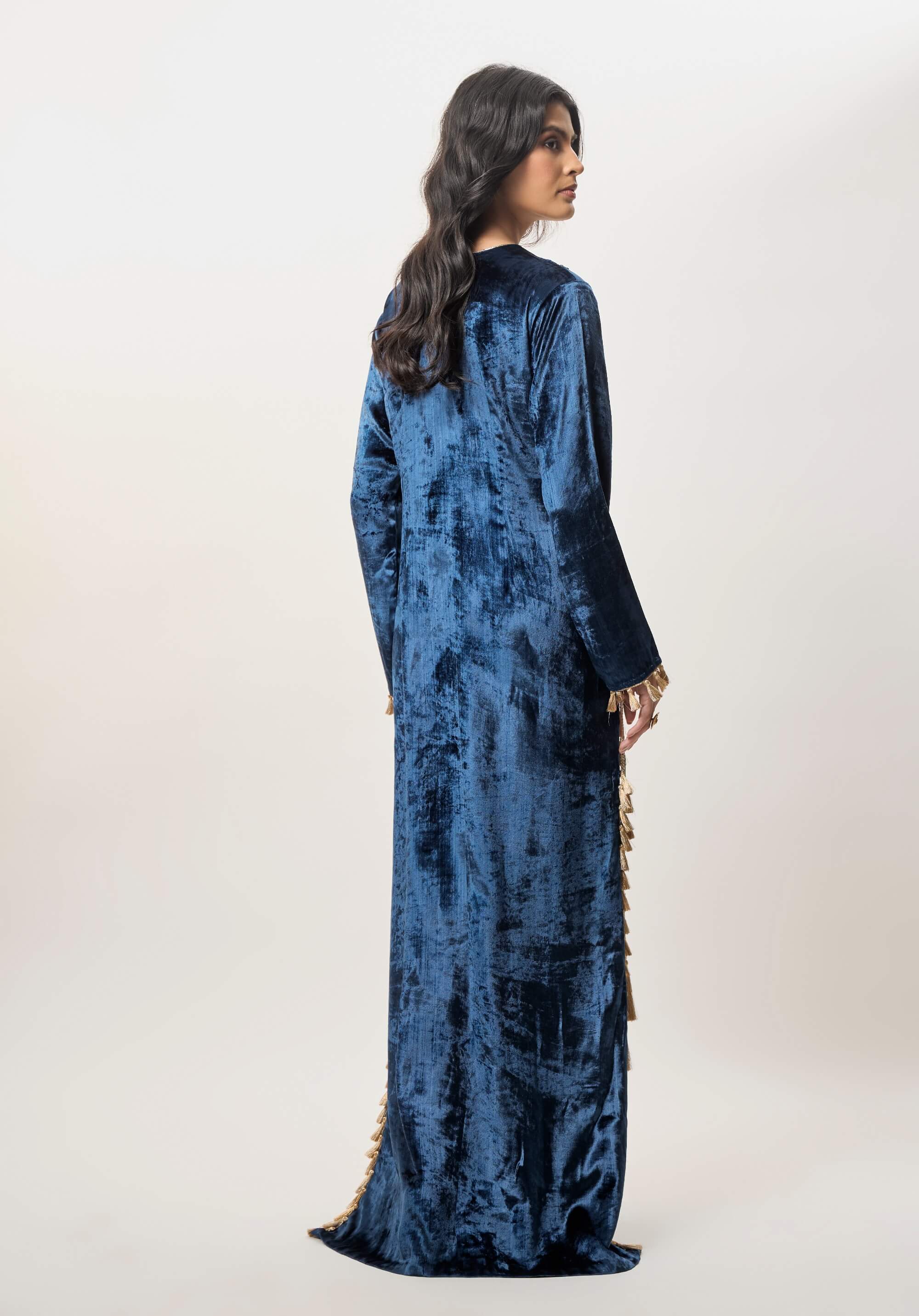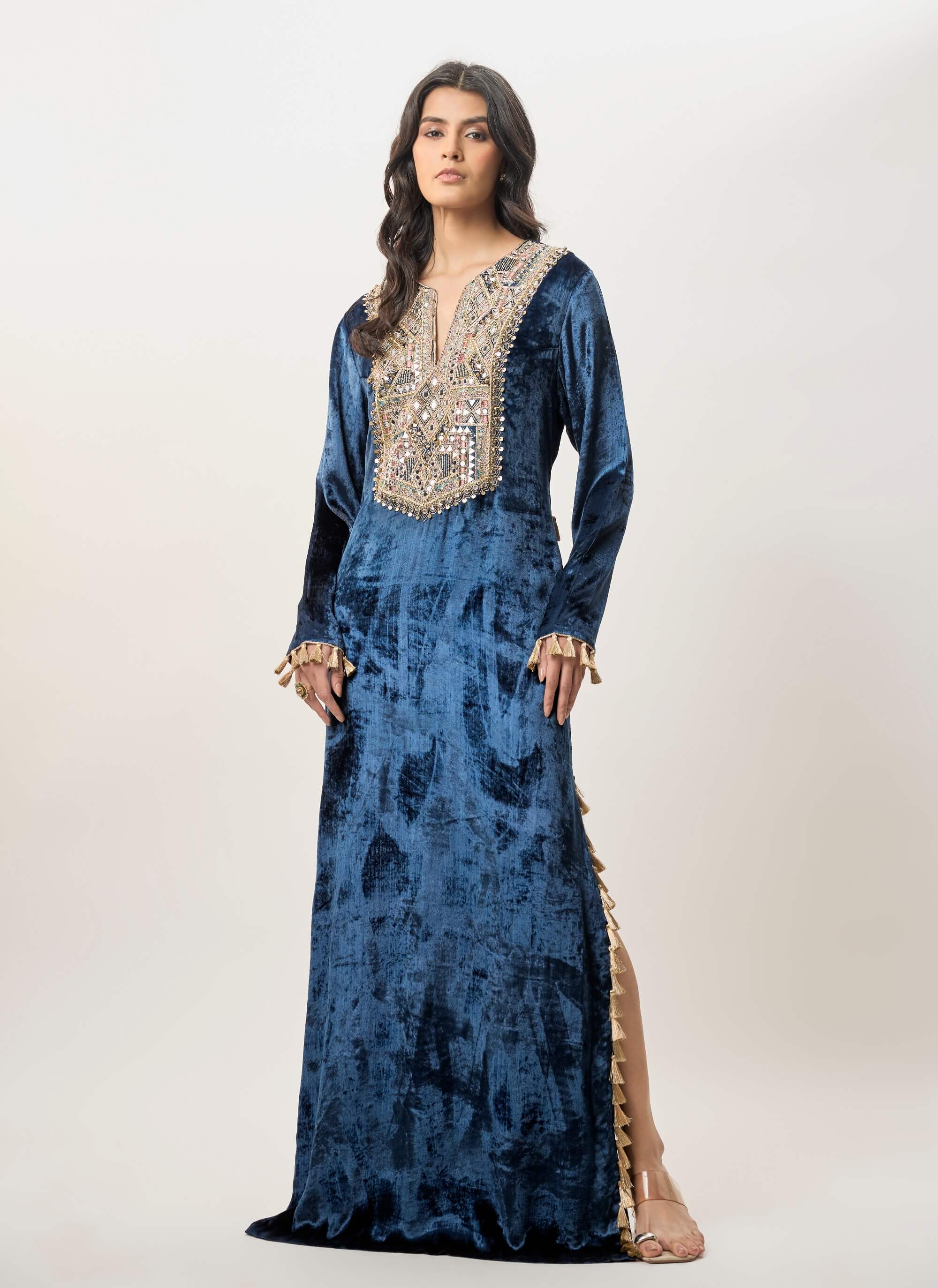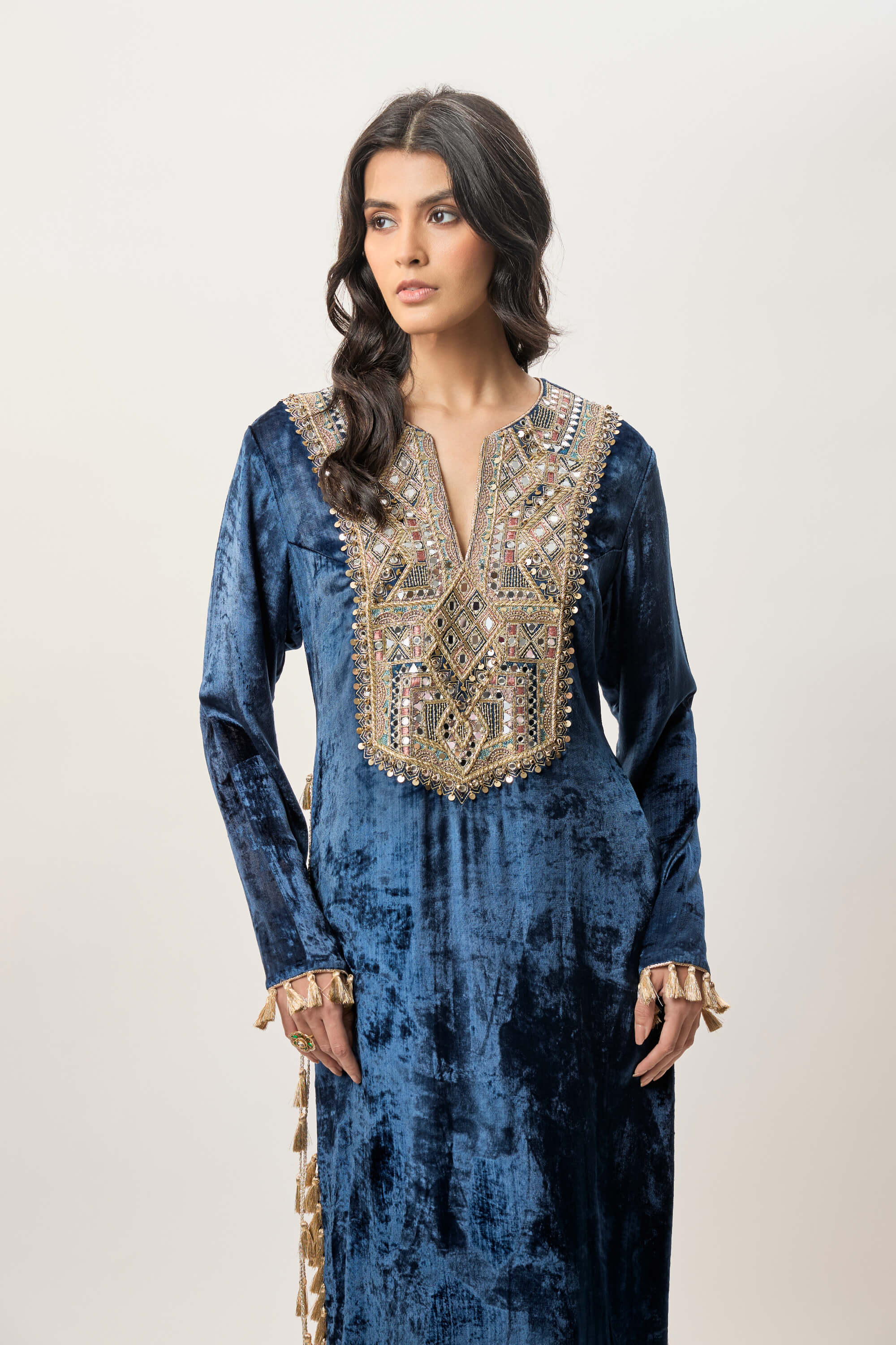 A navy blue velvet beyza kaftan designed with a straight silhouette. The embroidered yoke adds rich festive detailing. Full-length sleeves enhance its elegant structure. Finished with tassel accents along the side slit.