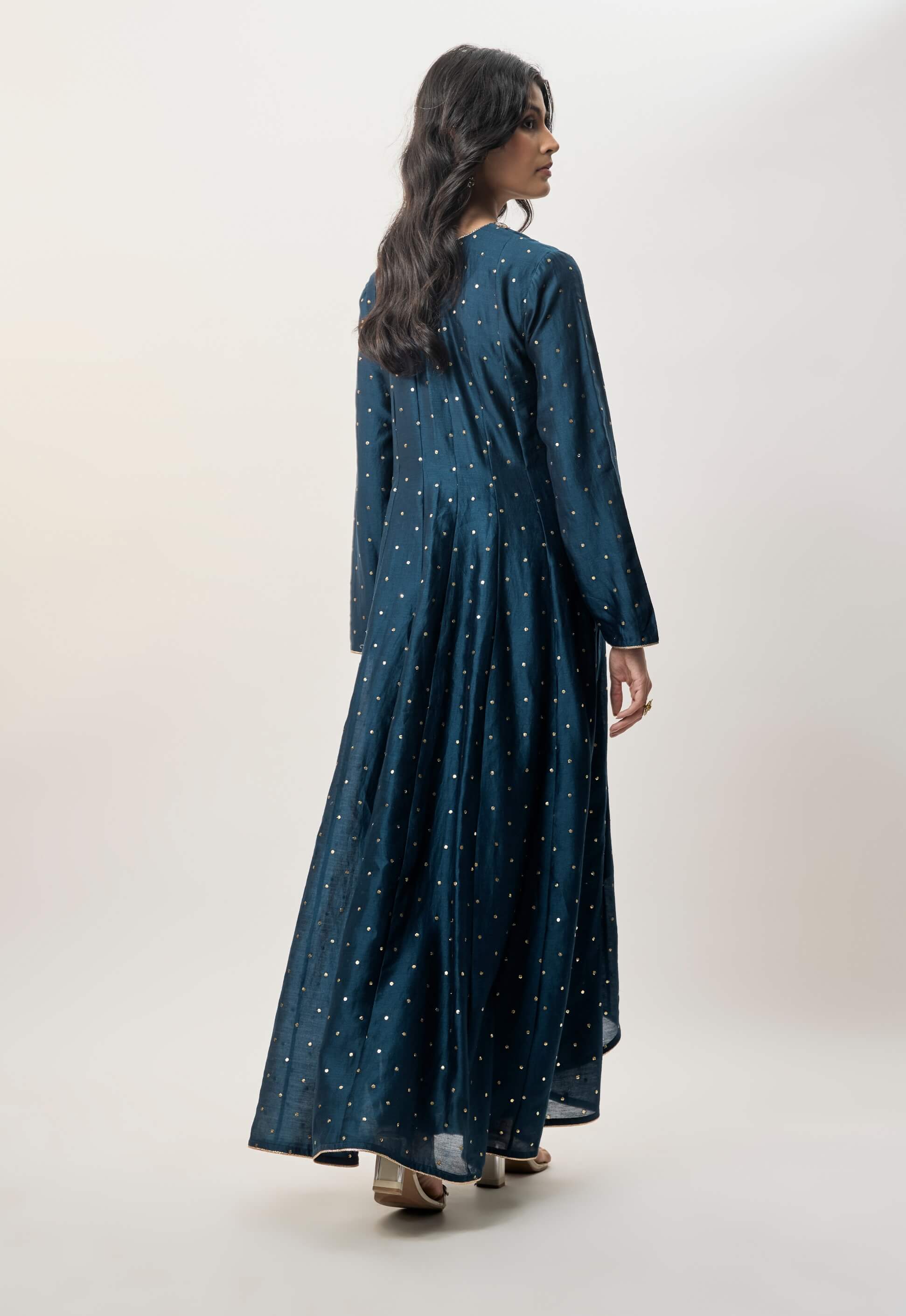 A navy blue silkmul anarkali featuring a high–low hemline. The mirror-embroidered yoke adds colour and sparkle. Subtle mukaish dots enhance texture. Paired with a fitted churidar and sheer mukaish net dupatta.