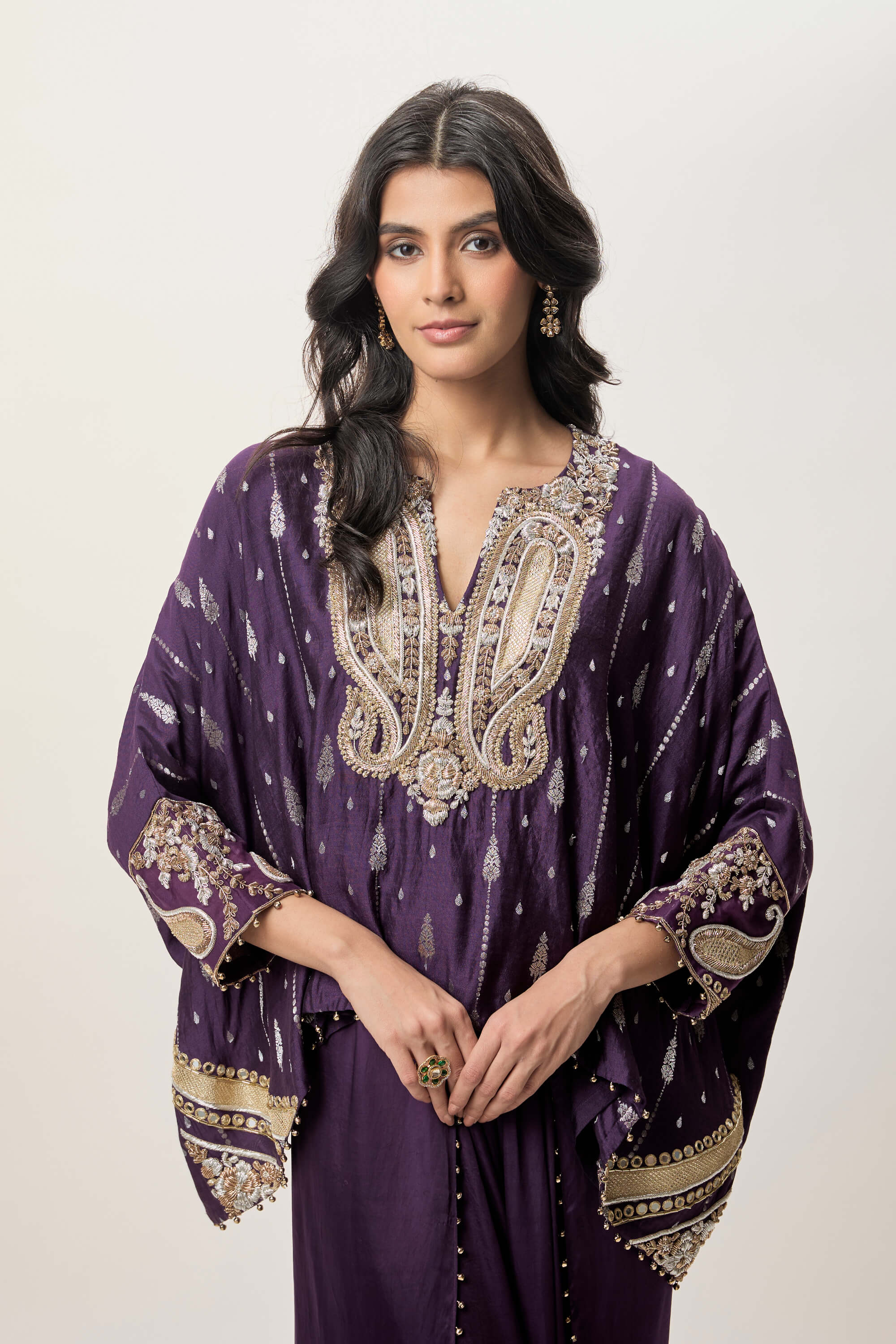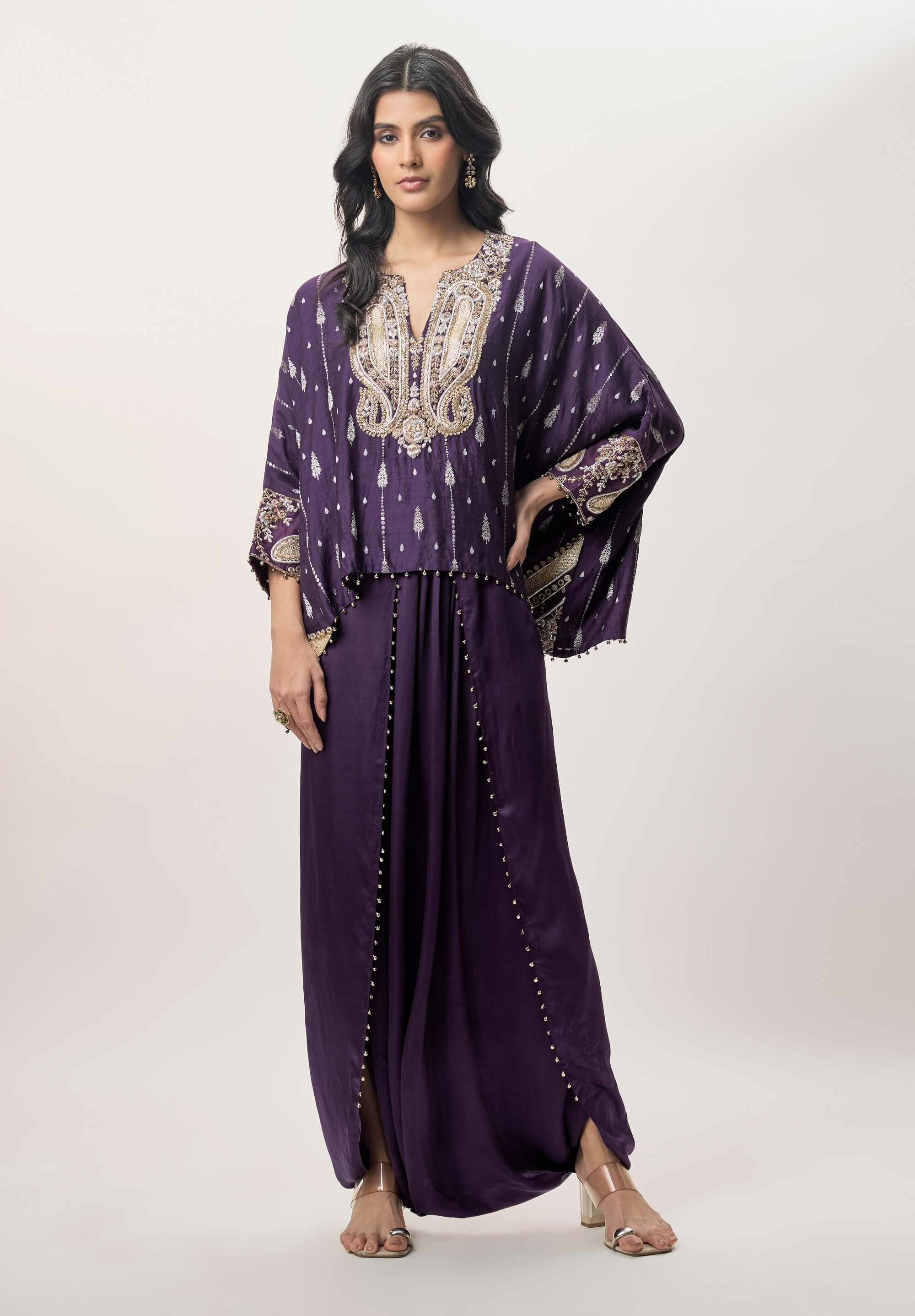 An embroidered chiniya silk top highlighted with refined gold and silver detailing. The neckline and cuffs shimmer with intricate craftsmanship. Paired with a fluid modal satin dhoti skirt featuring bead-edged finishing. A contemporary ensemble with a graceful front slit.