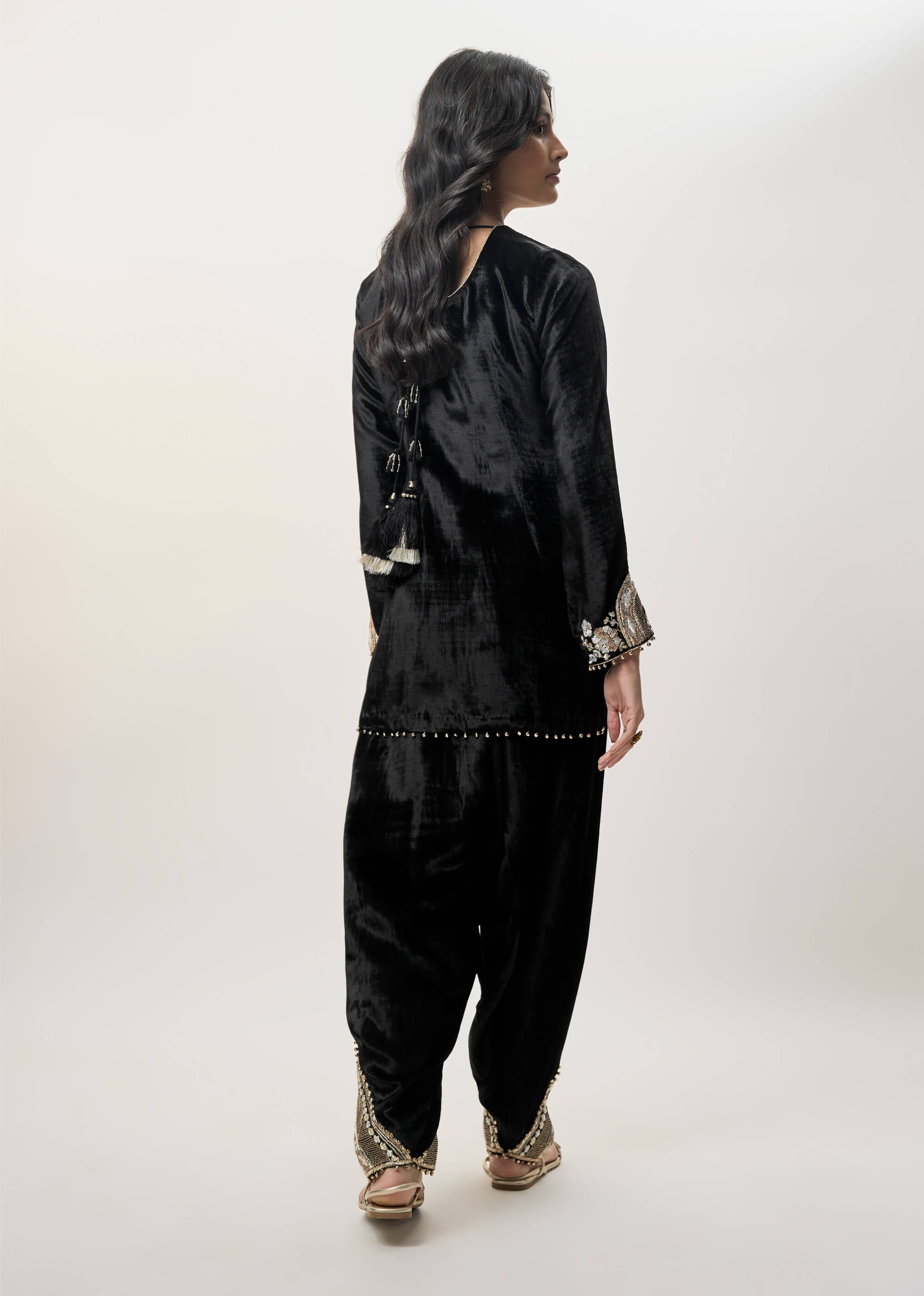 A classic black velvet kurta accented with gold and silver embroidery at the yoke and cuffs. The embroidered farshi salwar adds traditional volume. Rich textures create a regal silhouette. Completed with a silkmul dupatta scattered with mukaish dots.