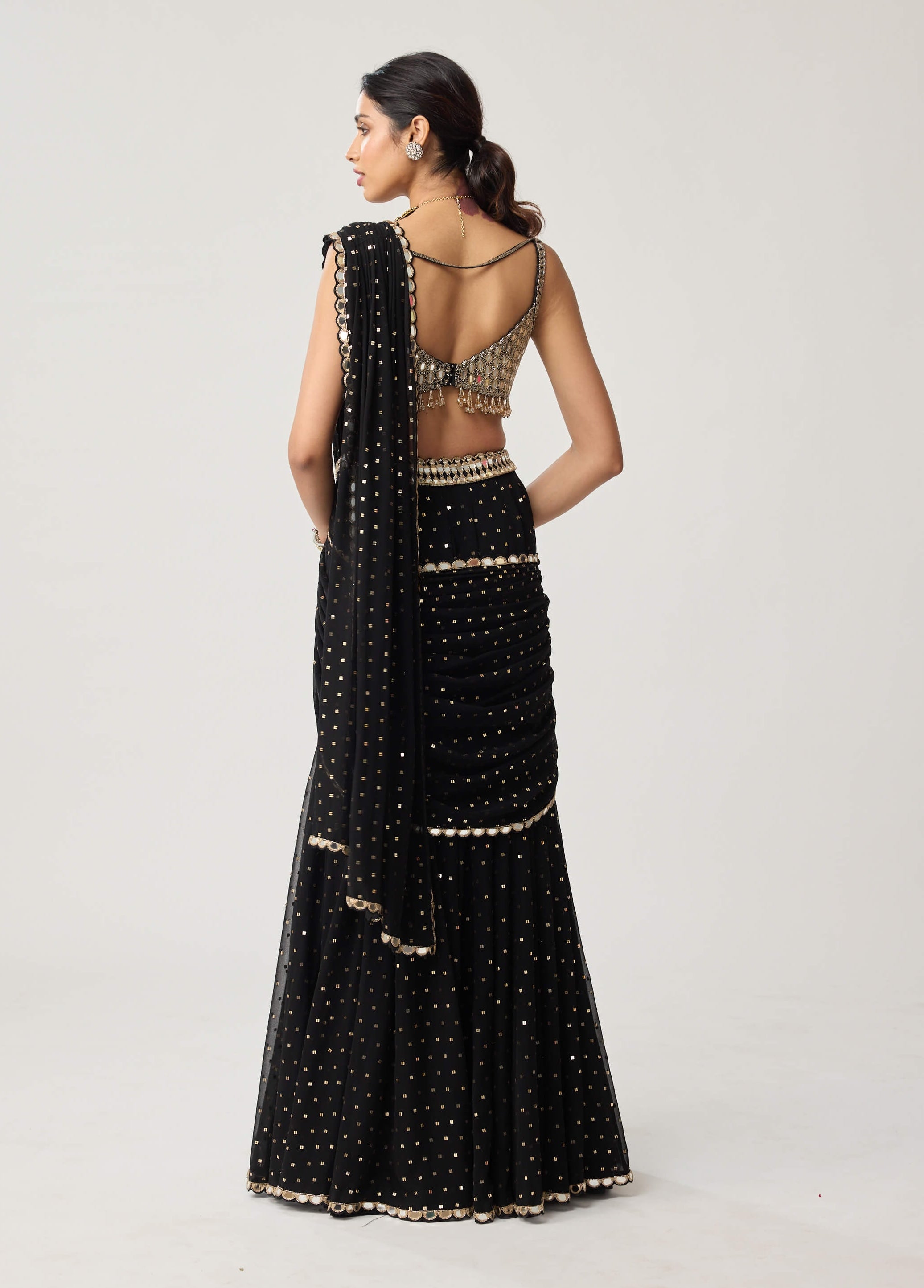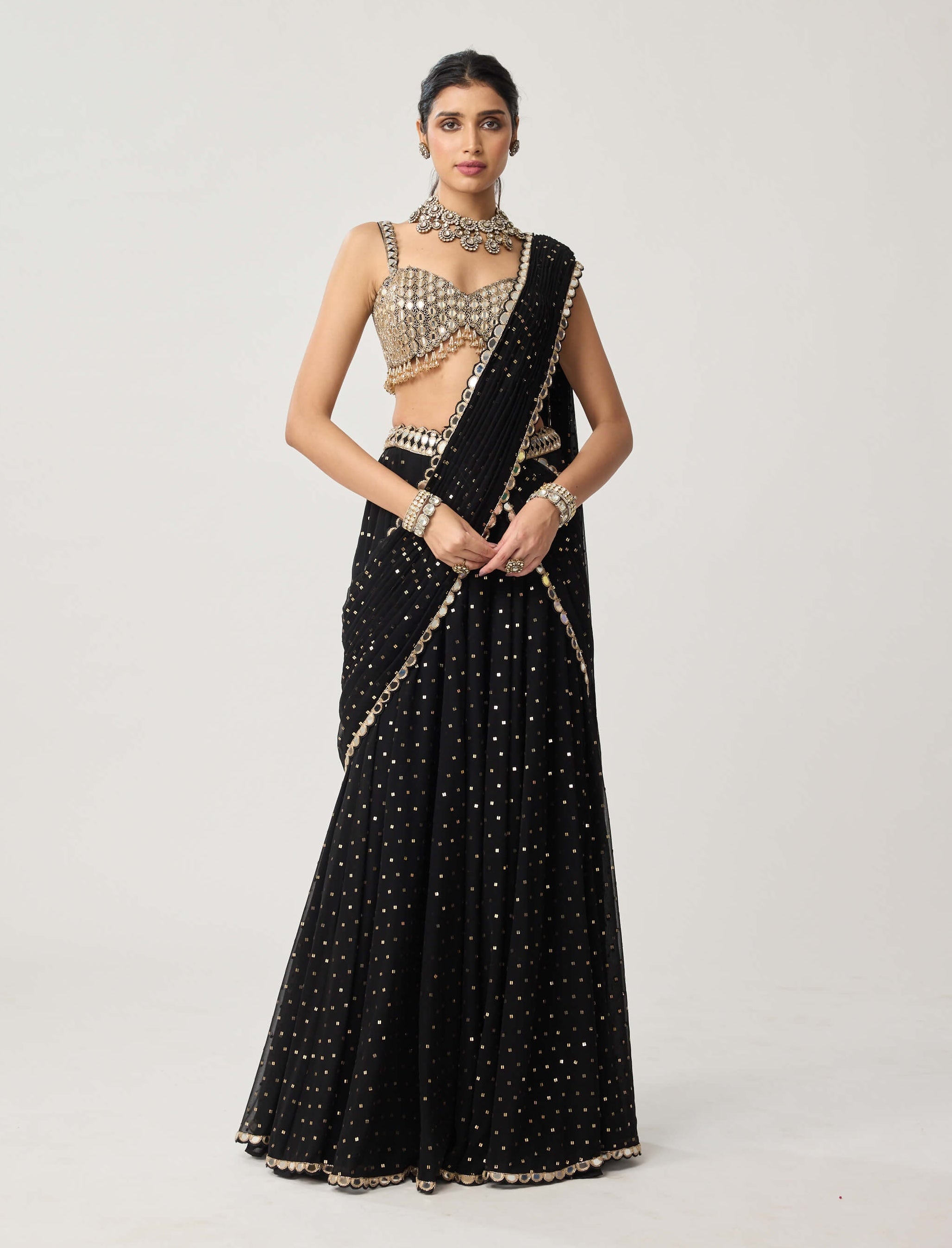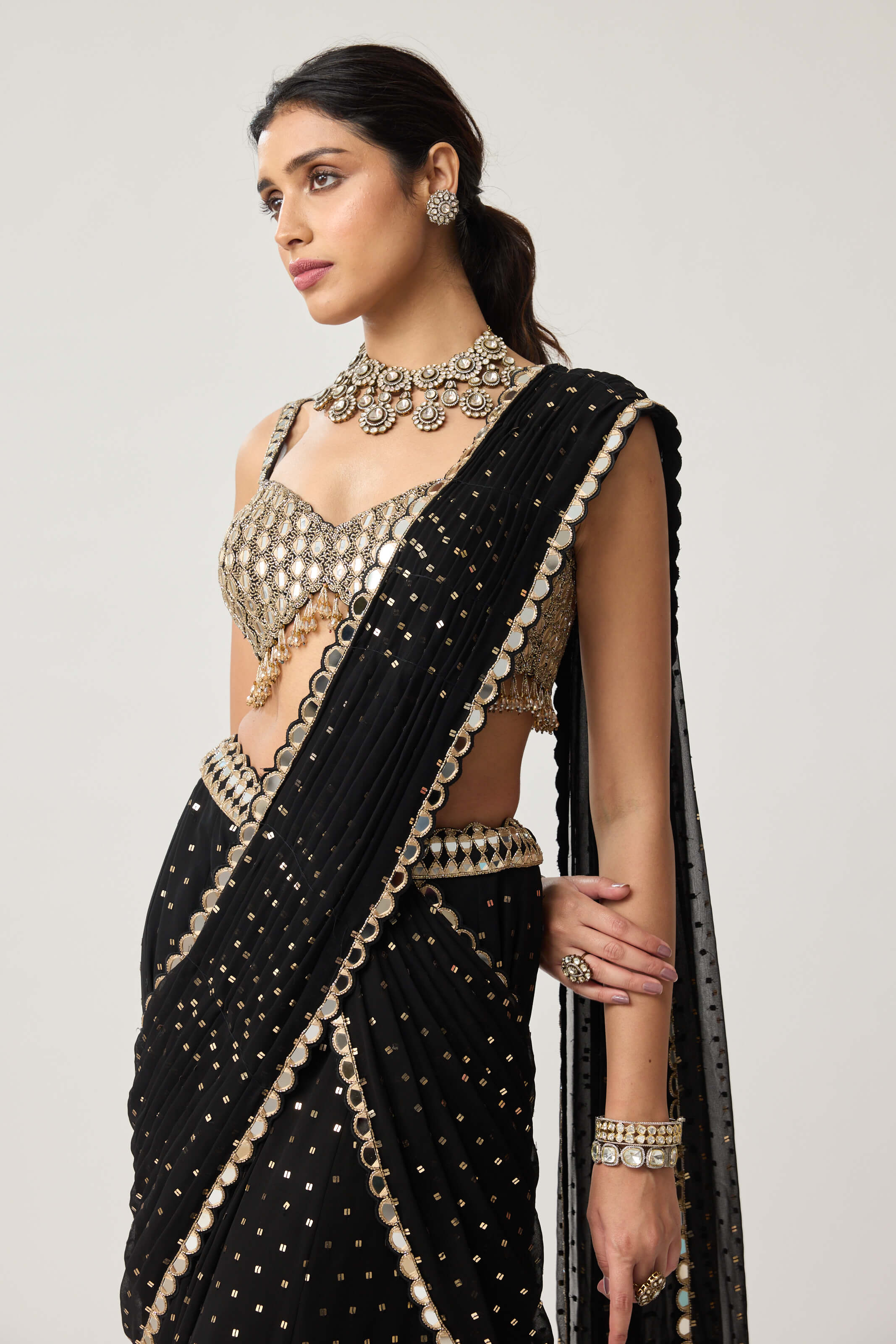 Strikingly modern, this black georgette pants-style sari redefines festive dressing. Paired with a sleeveless mirror-embroidered blouse, it channels fusion glamour with an edge. Perfect for cocktail nights, destination parties, or festive soirées where tradition meets rebellion.