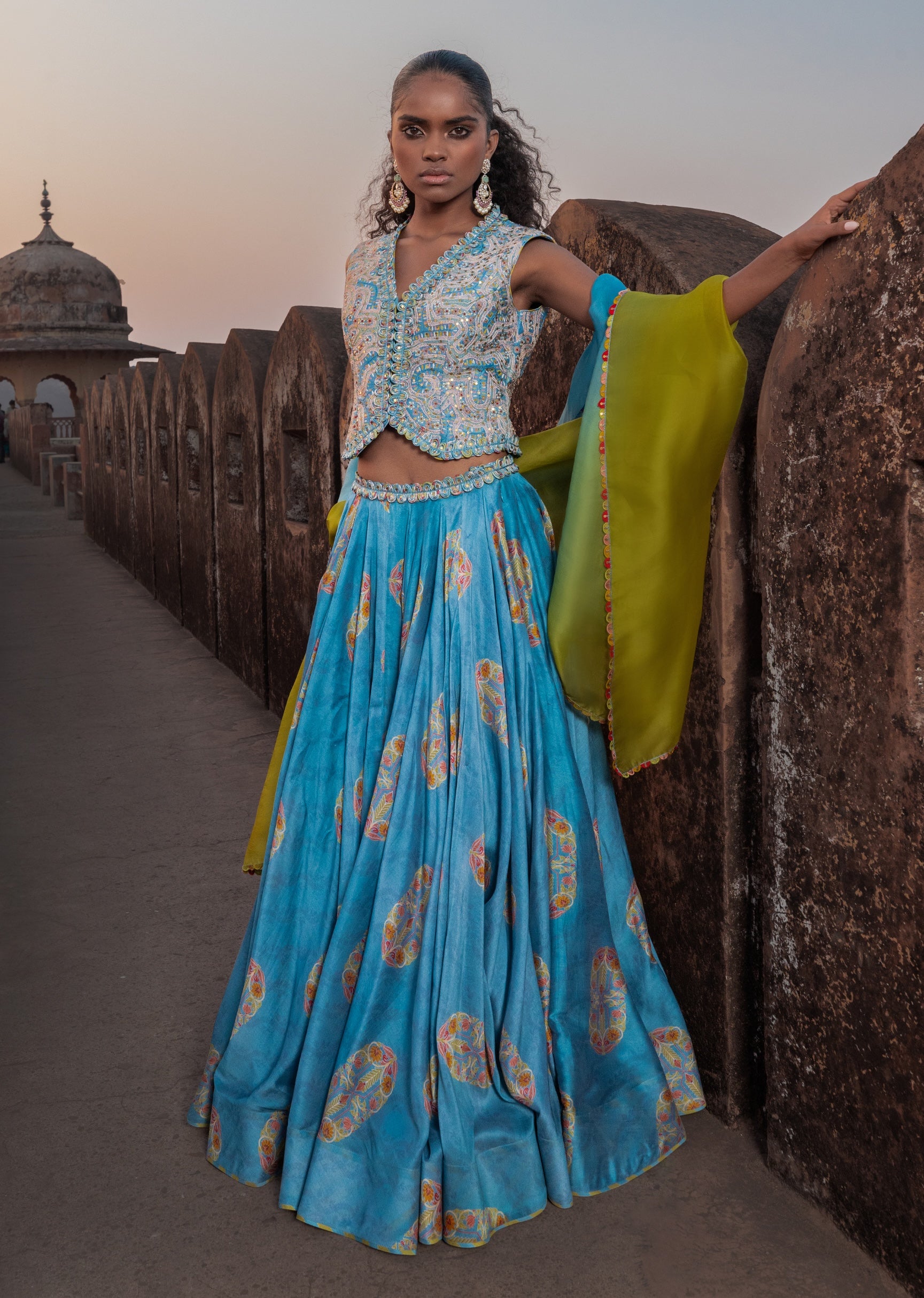 A refined waistcoat lehenga set in mist blue and dry henna tones. Structured layering adds a contemporary edge to tradition. Ideal for sangeet nights, festive gatherings, and wedding celebrations.