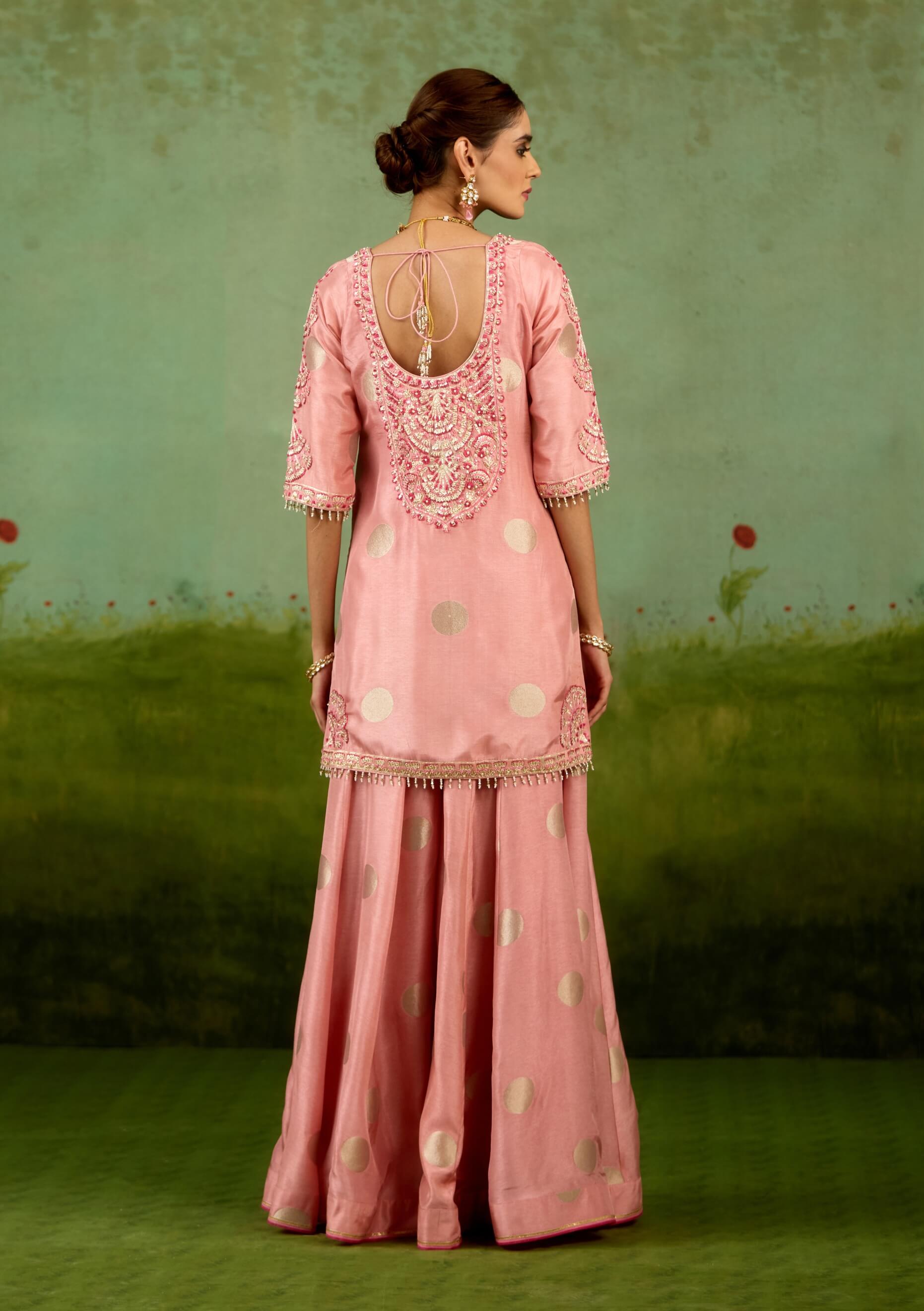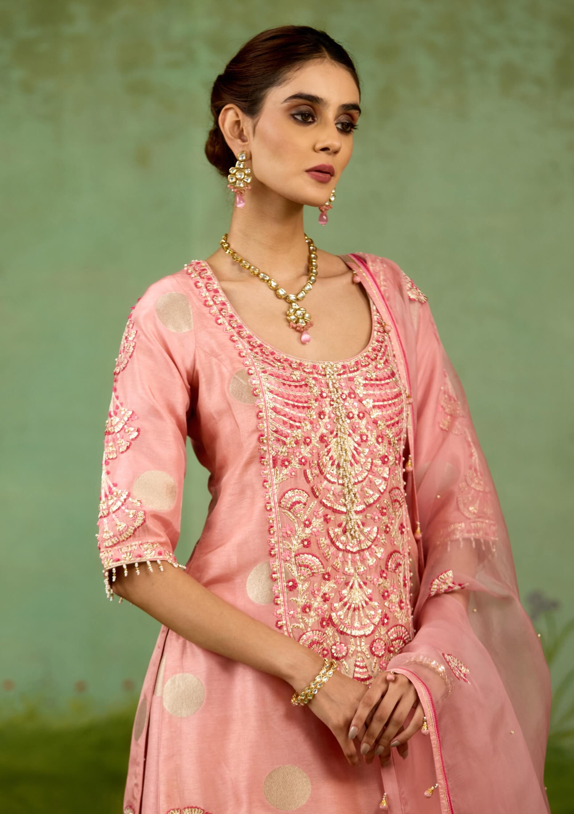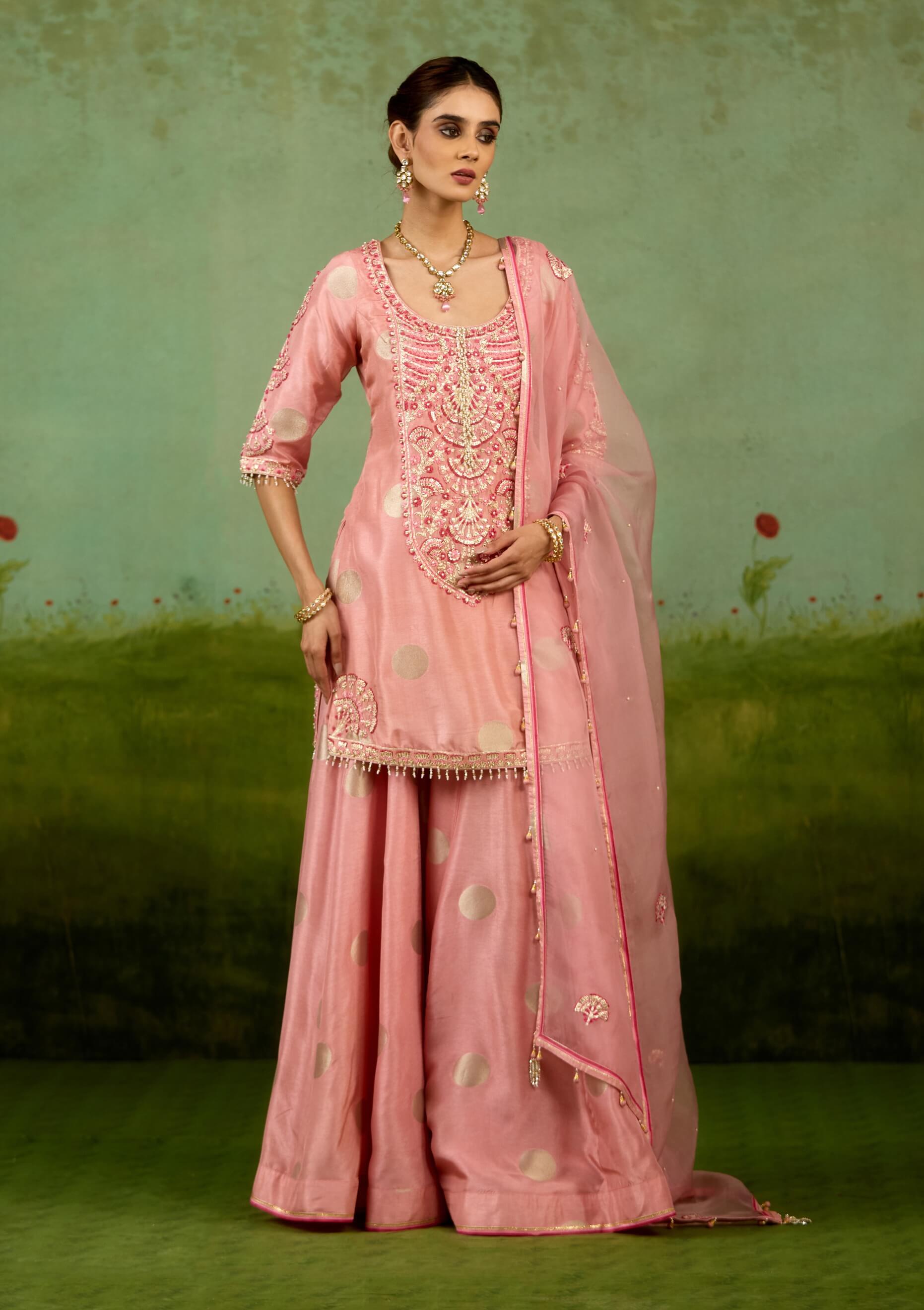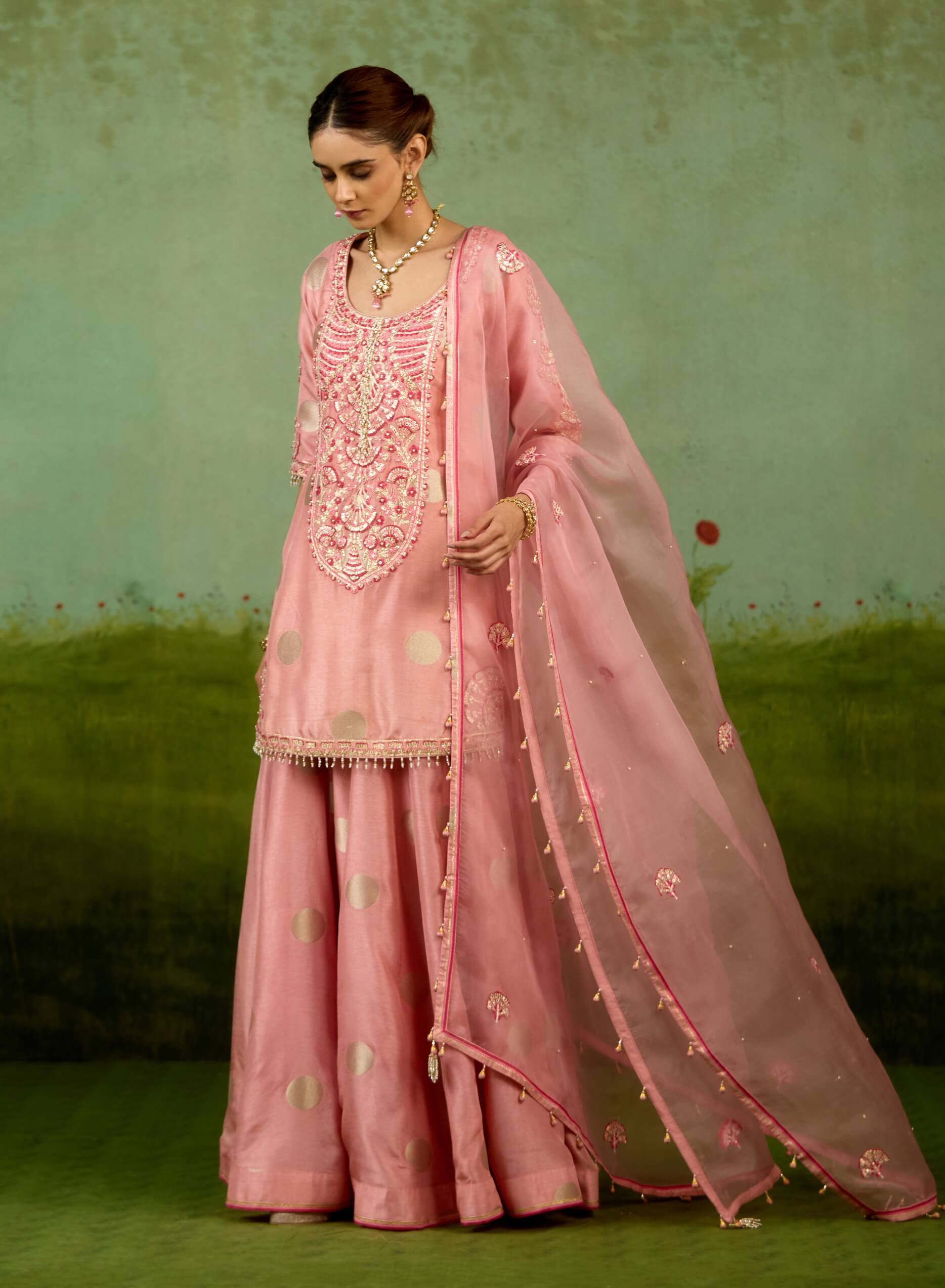 A bloom of coral sophistication. This silk kurta sharara set dazzles with exquisite gota and thread embroidery, adding depth and allure to the vibrant hue. The organza dupatta lends a soft, romantic finish. Ideal for mehendi ceremonies, festive gatherings, or pre-wedding soirées.
