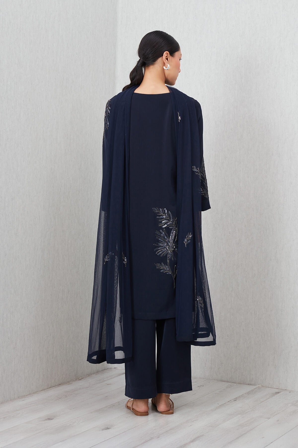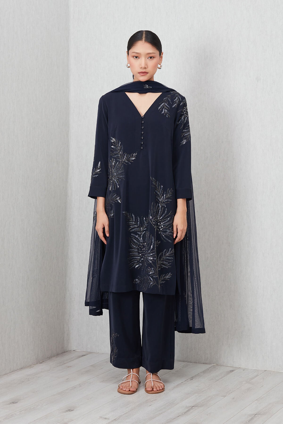 Ethereal calm meets autumnal charm in the tara tunic set in china crinkle. Deep navy with all-over tonal embroidery and scattered sequins catches the light like stars through leaves. Its relaxed a-line silhouette with a soft v-neckline and fabric buttons exudes understated elegance. Wear it for festive dinners, evening gallery strolls, or refined gatherings where comfort meets sophistication.