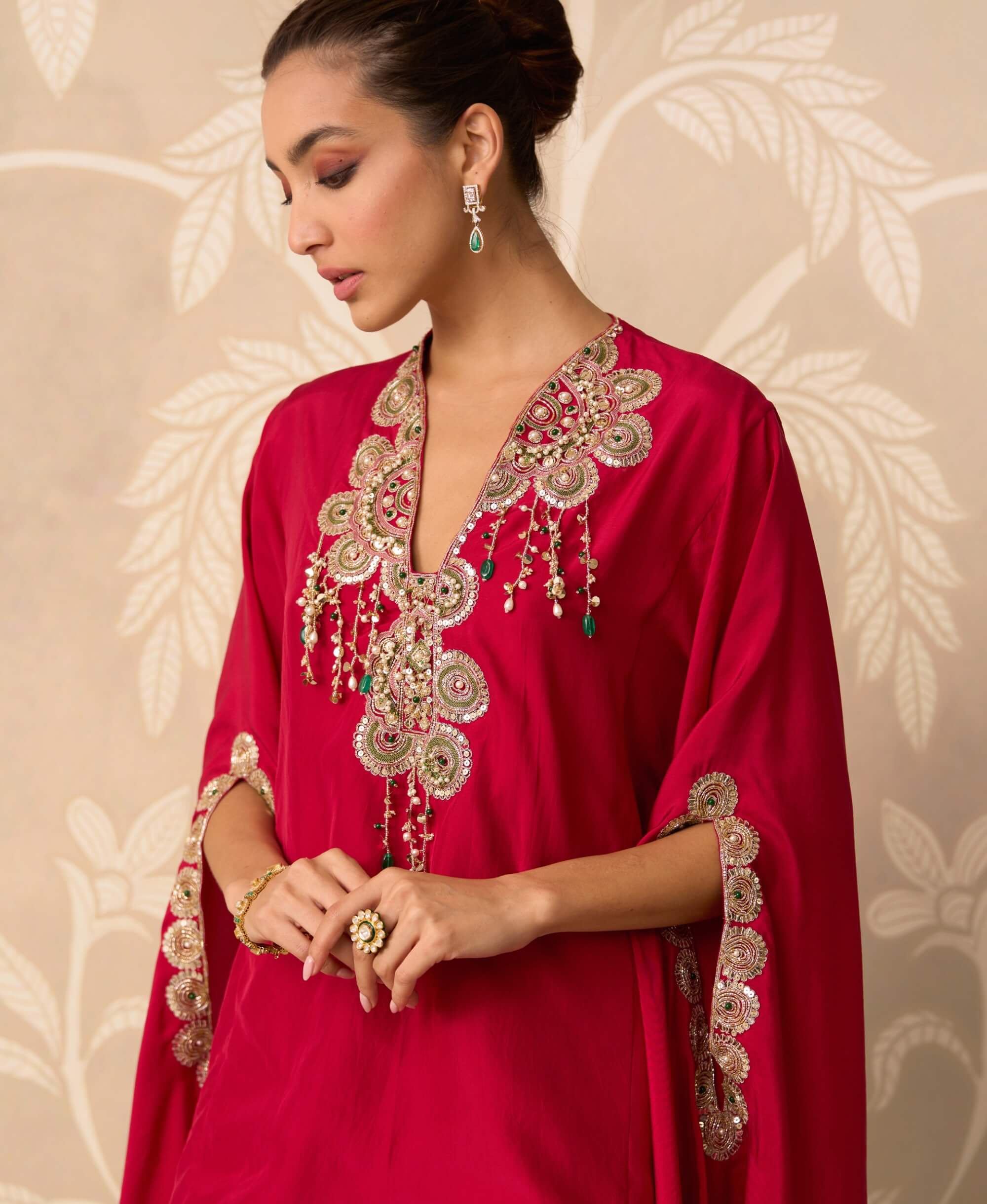Bold and striking, this silk embroidered cape paired with a draped silk salwar makes a statement for festive nights.