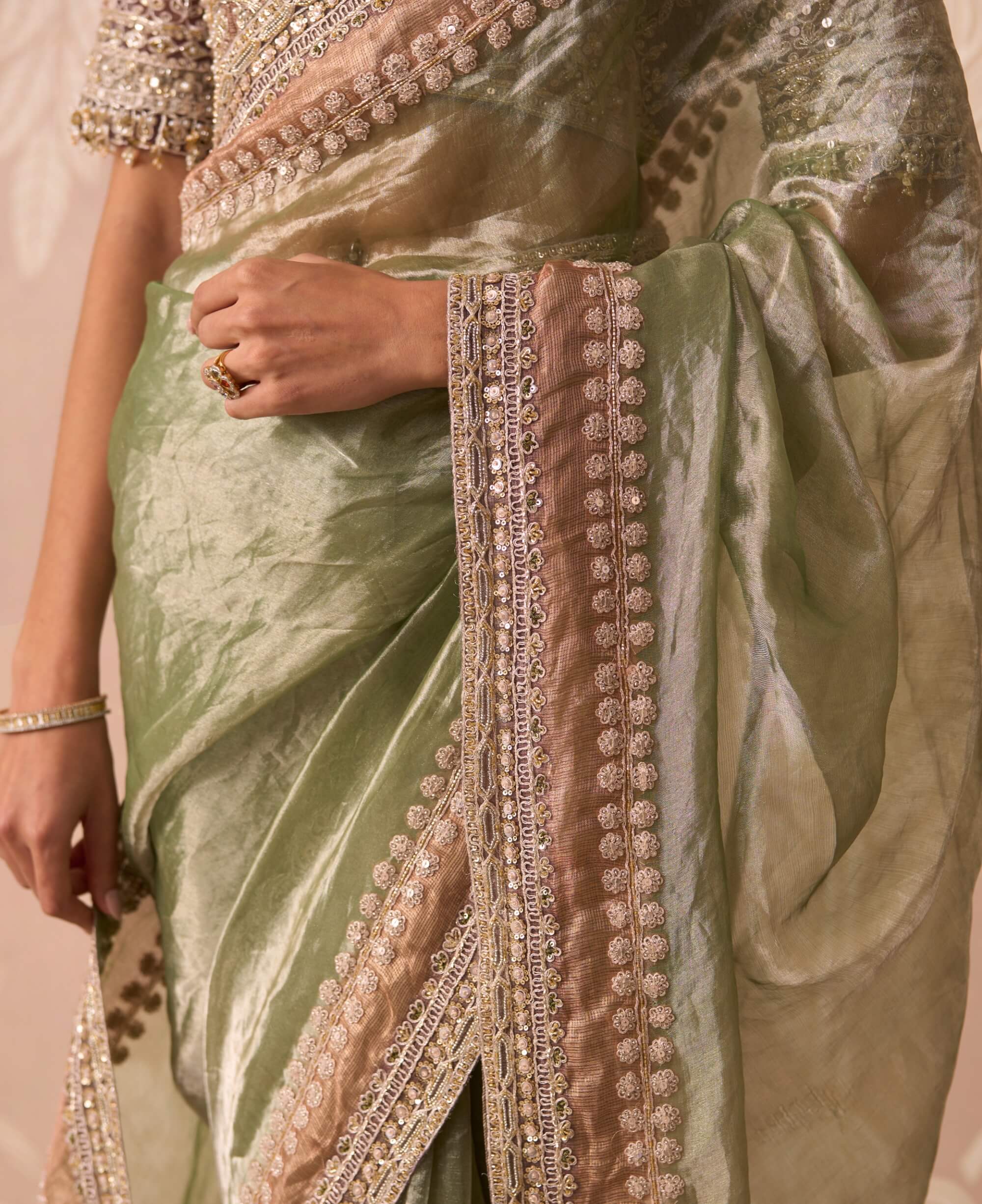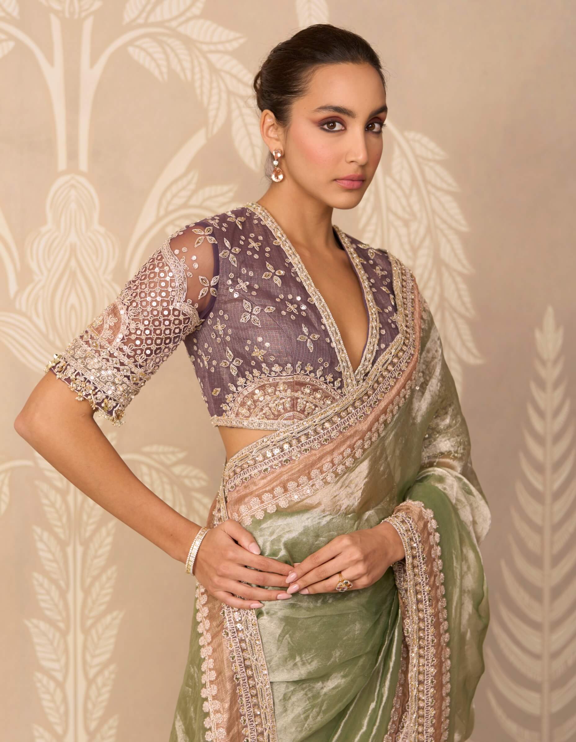 Delicate and refined, this net and kota tissue embroidered blouse with a tissue flat sari and crepe petticoat is perfect for wedding rituals and elegant festive gatherings.