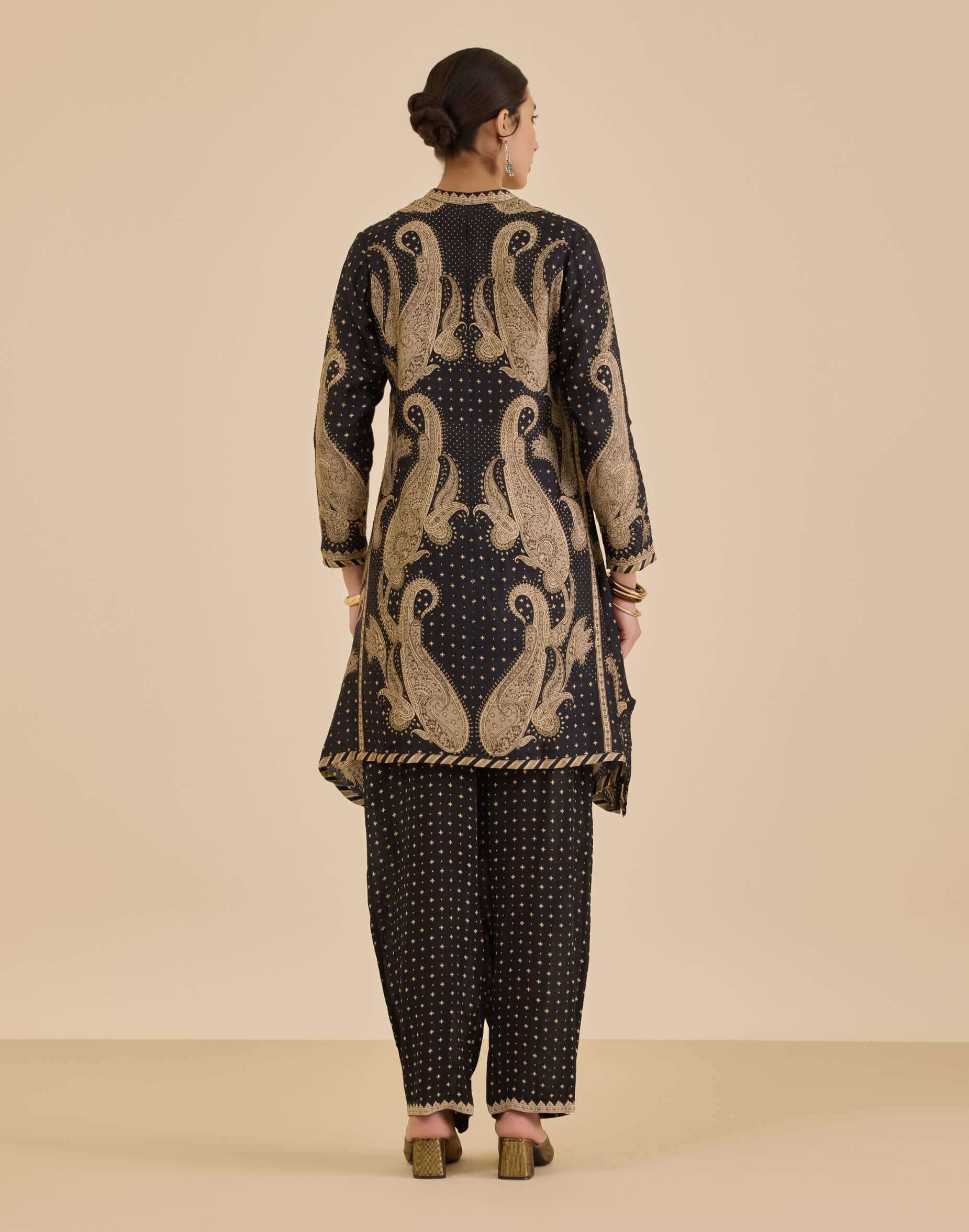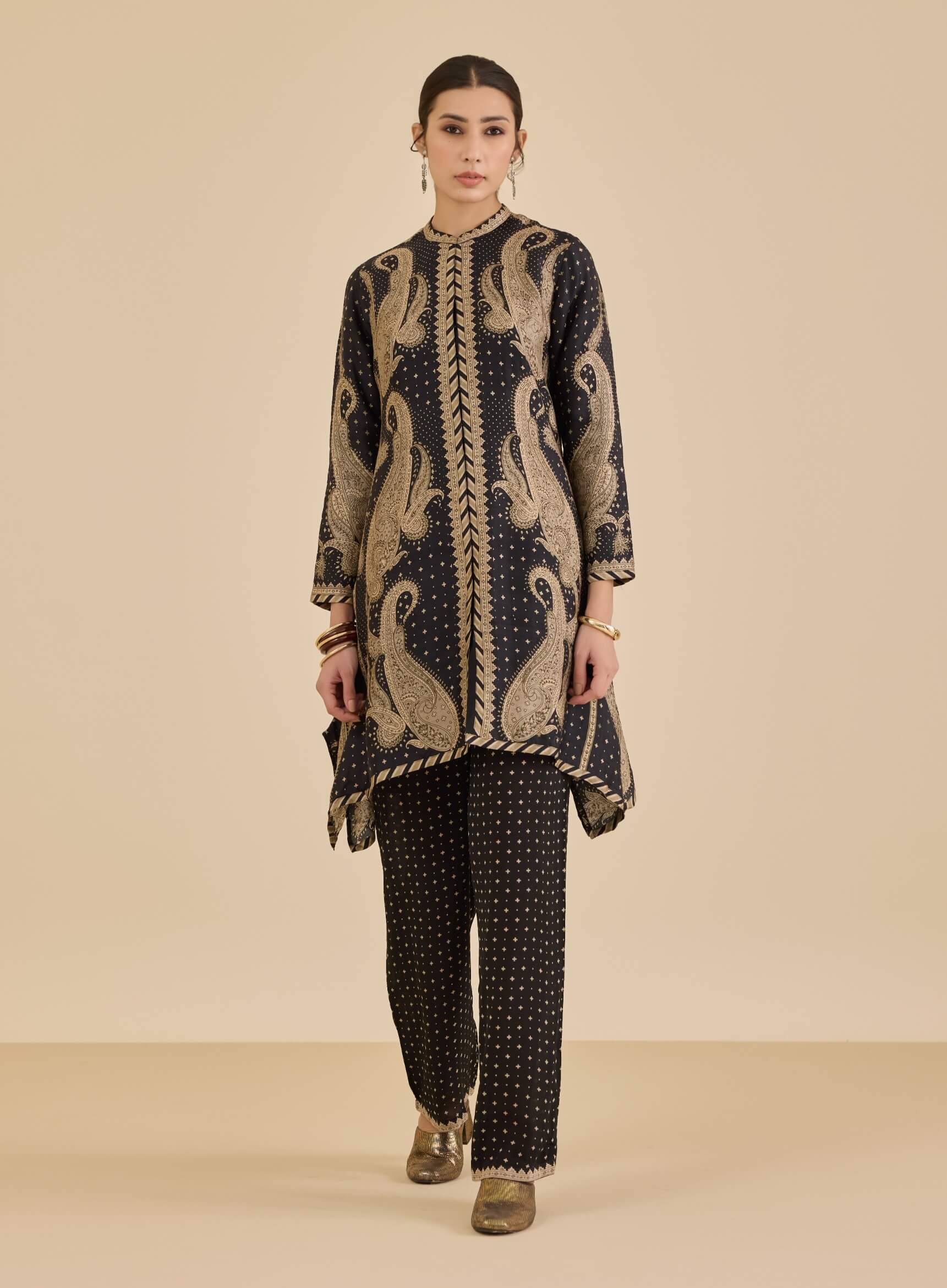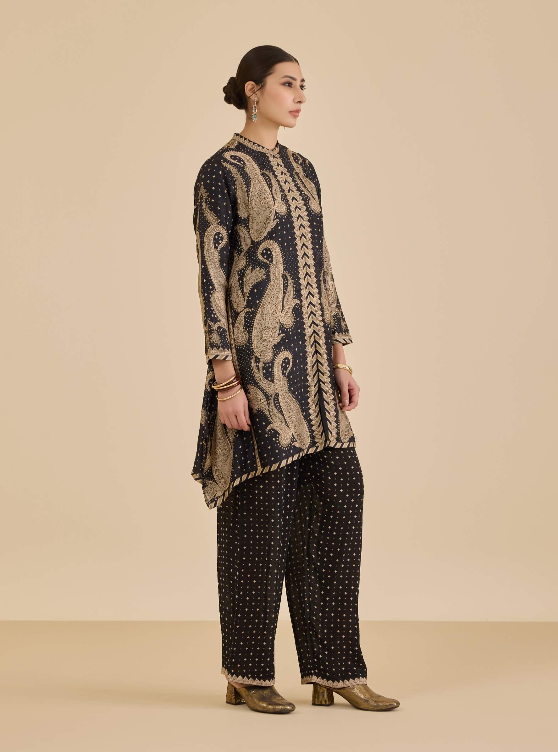 Channel understated glamour with the black and beige dancing paisley kurta. The asymmetric hem and paisley motifs create a fluid, bohemian rhythm, while the tailored pants anchor the look with structure. A perfect pick for festive evenings or artful soirées.