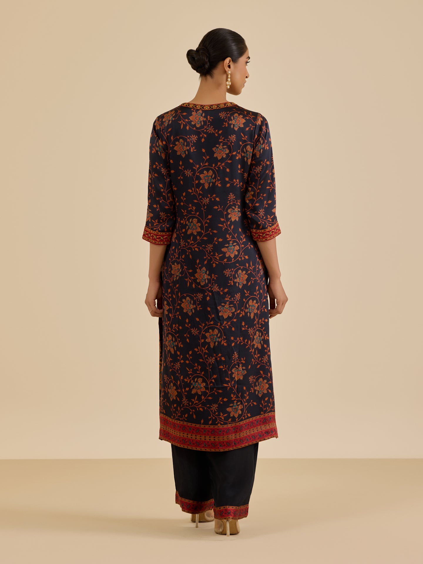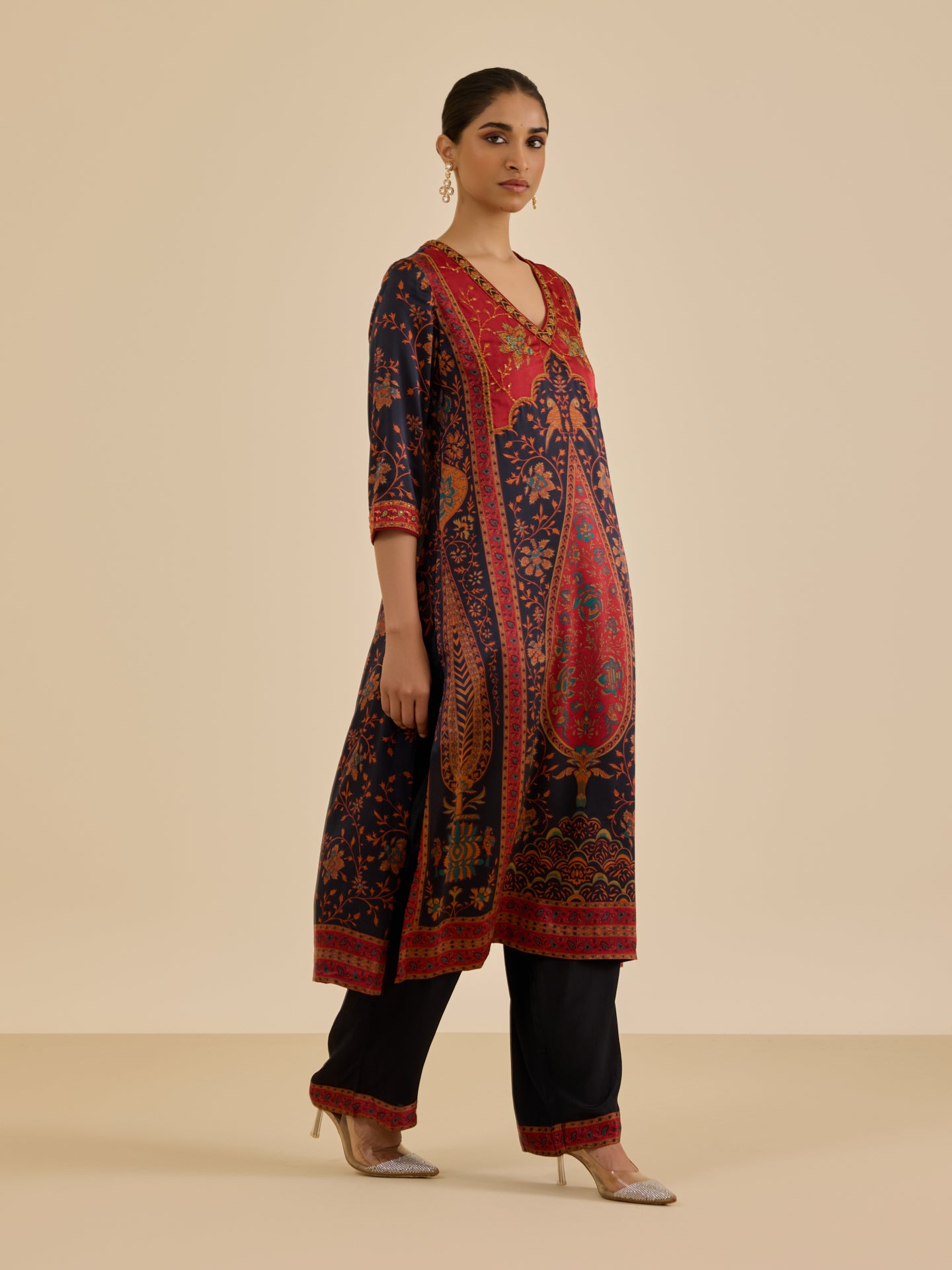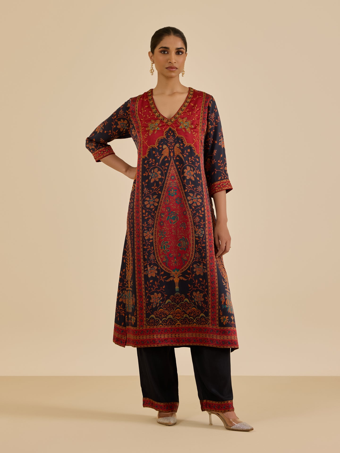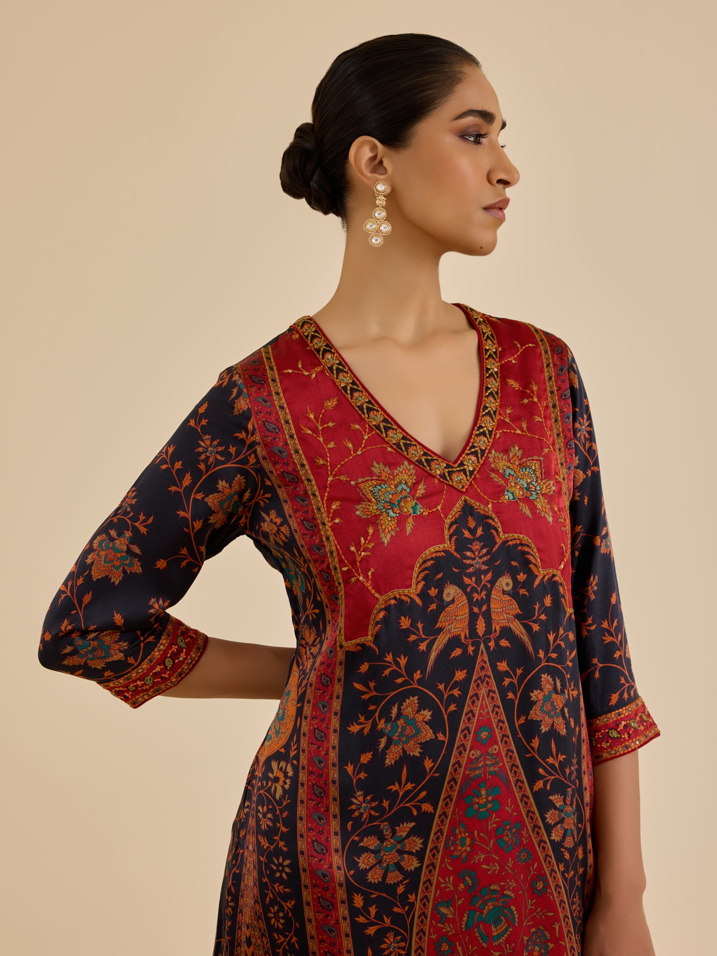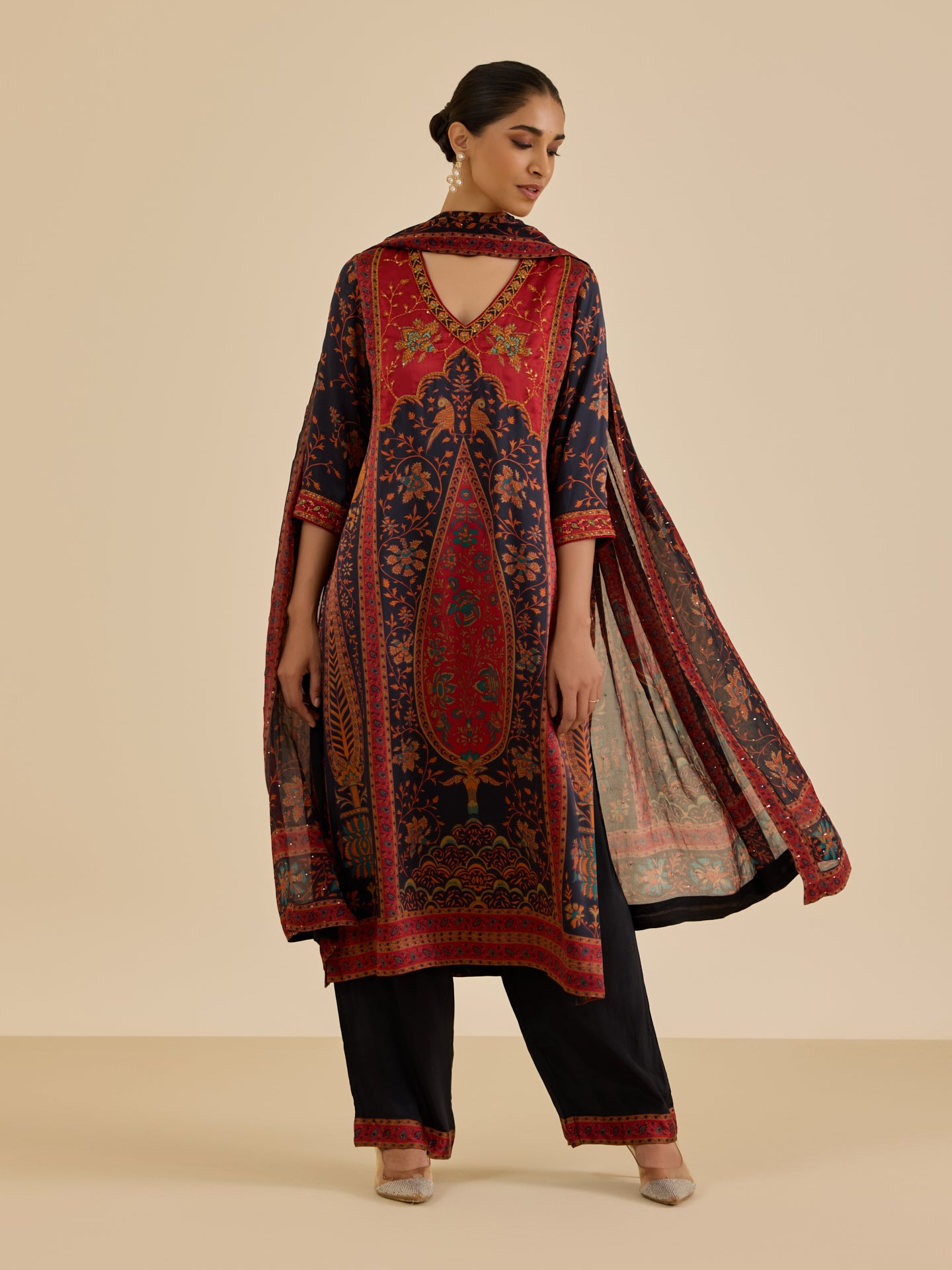 Redefine timeless charm with the apsara kurta set in black and burgundy. The straight silhouette balances simplicity and luxury, enhanced by smart pants and a coordinated dupatta. An elegant pick for festive evenings and family celebrations.