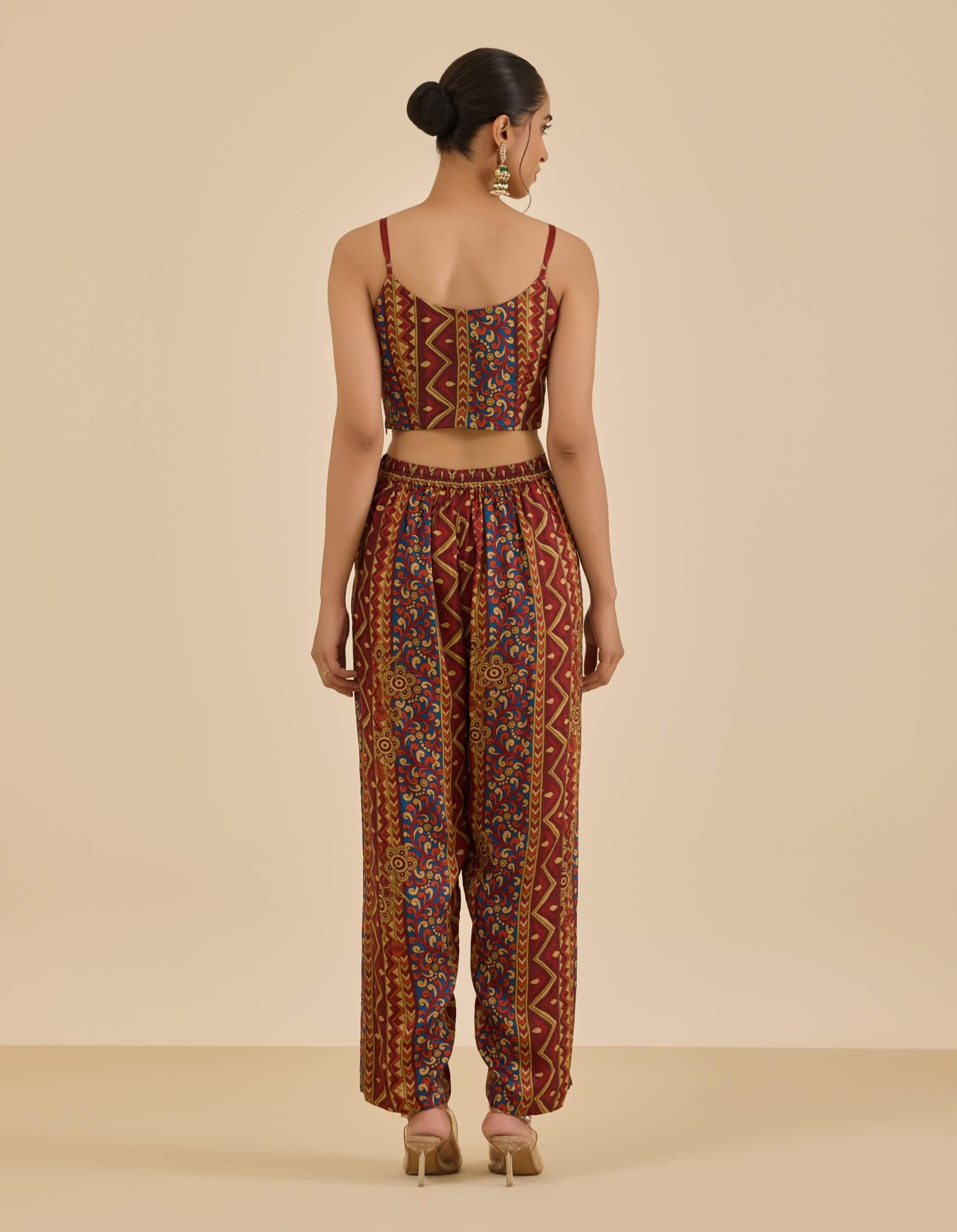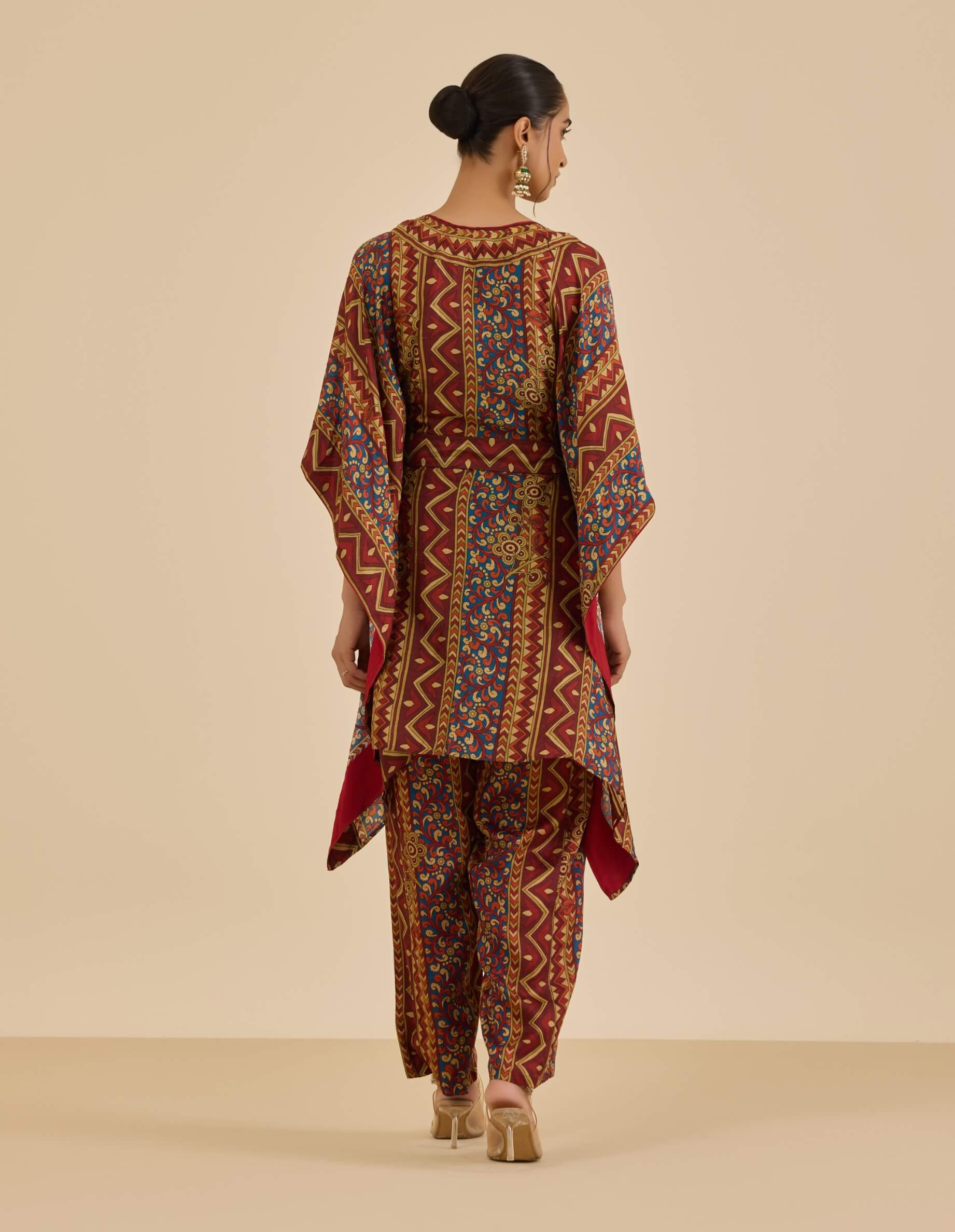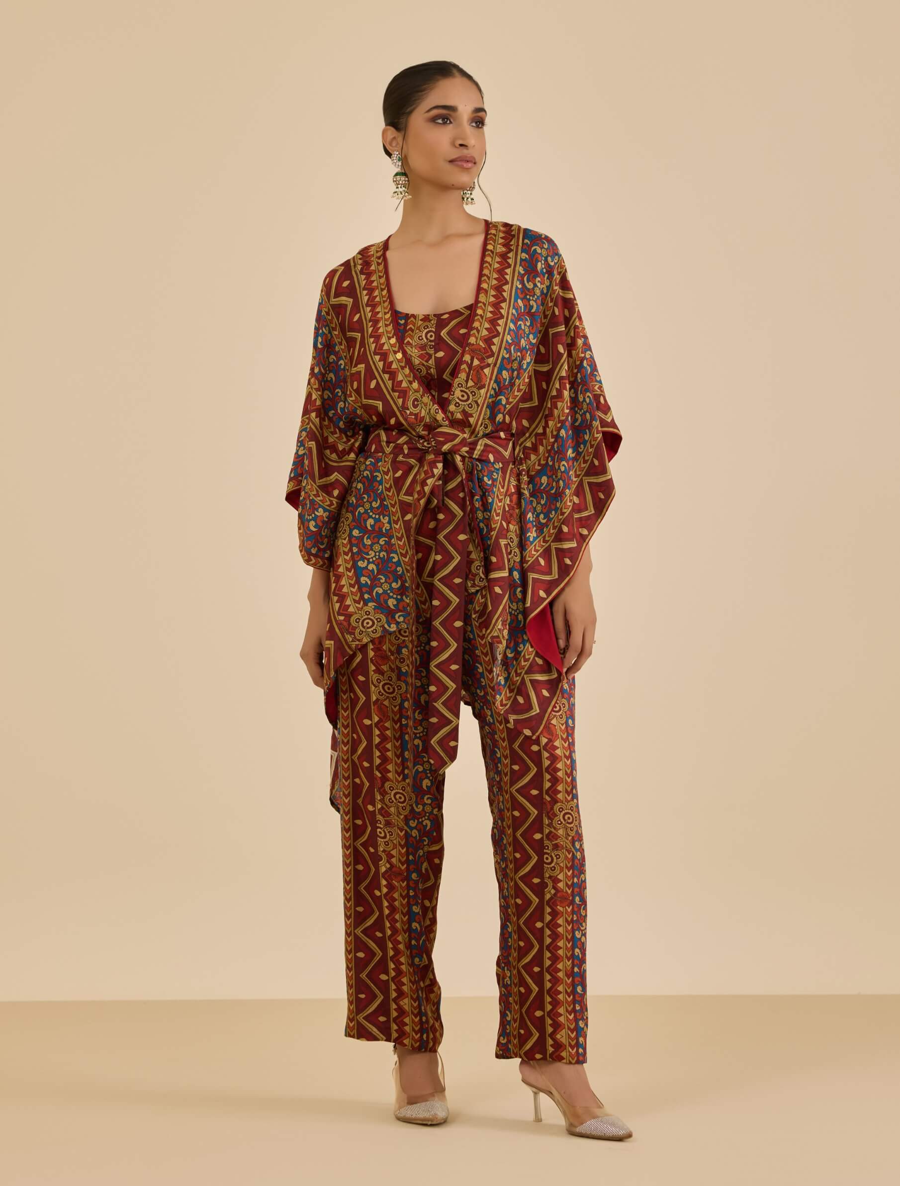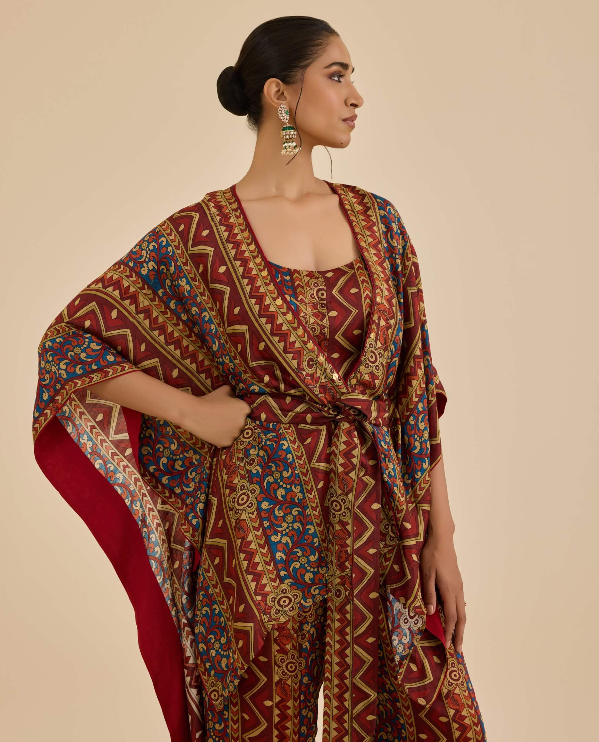 Make a bold entrance with the burgundy and multi temple cape set. The dramatic cape, strappy crop top, and tailored pants create a contemporary silhouette steeped in tradition. Ideal for cocktail nights or statement festive dressing.