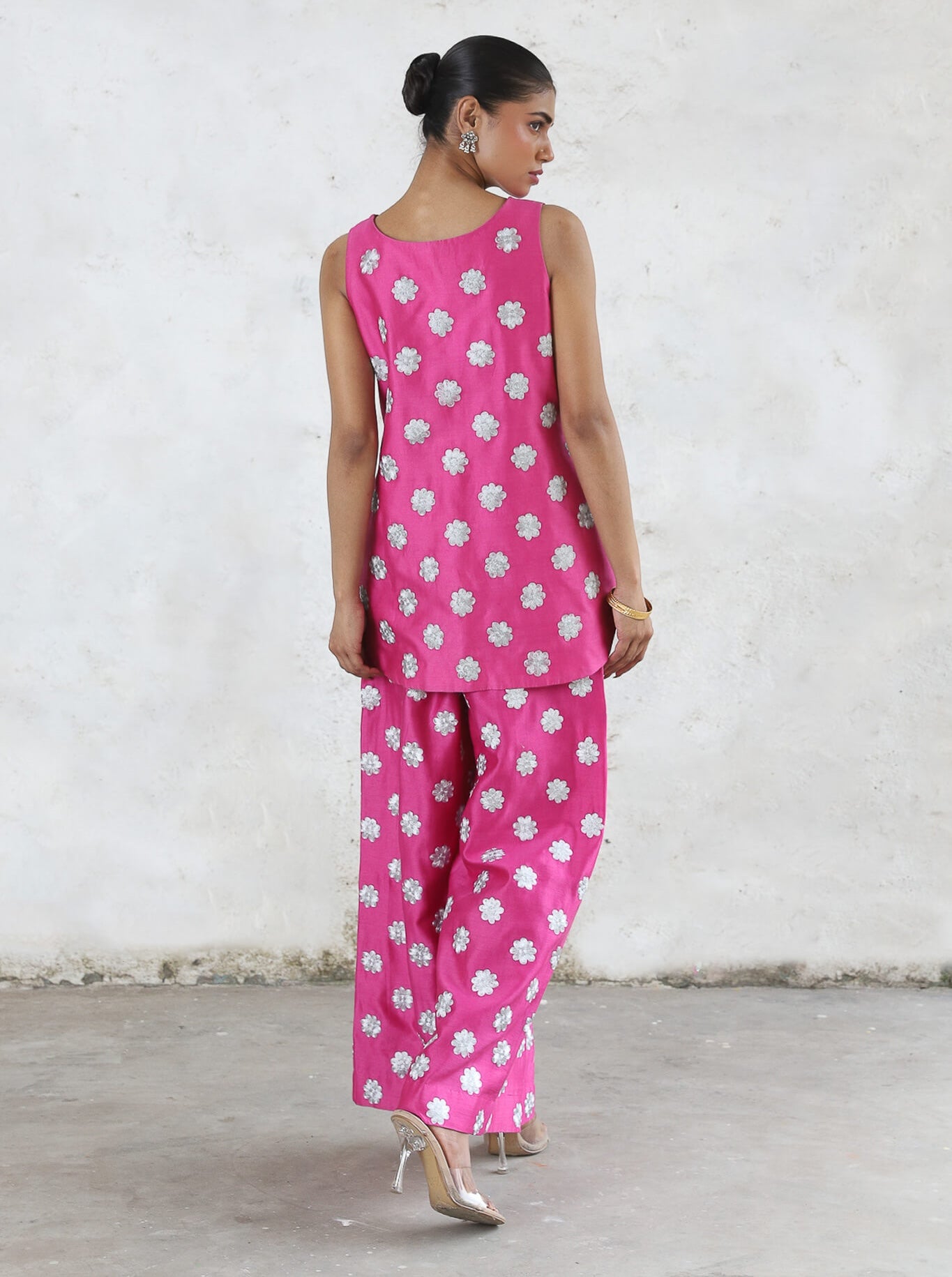 A delicate interplay of light and craftsmanship, this pink benarasi cotton silk co-ord set is hand-embroidered with silver zari floral motifs. Ideal for day weddings, pre-festive get-togethers, or elegant garden parties.