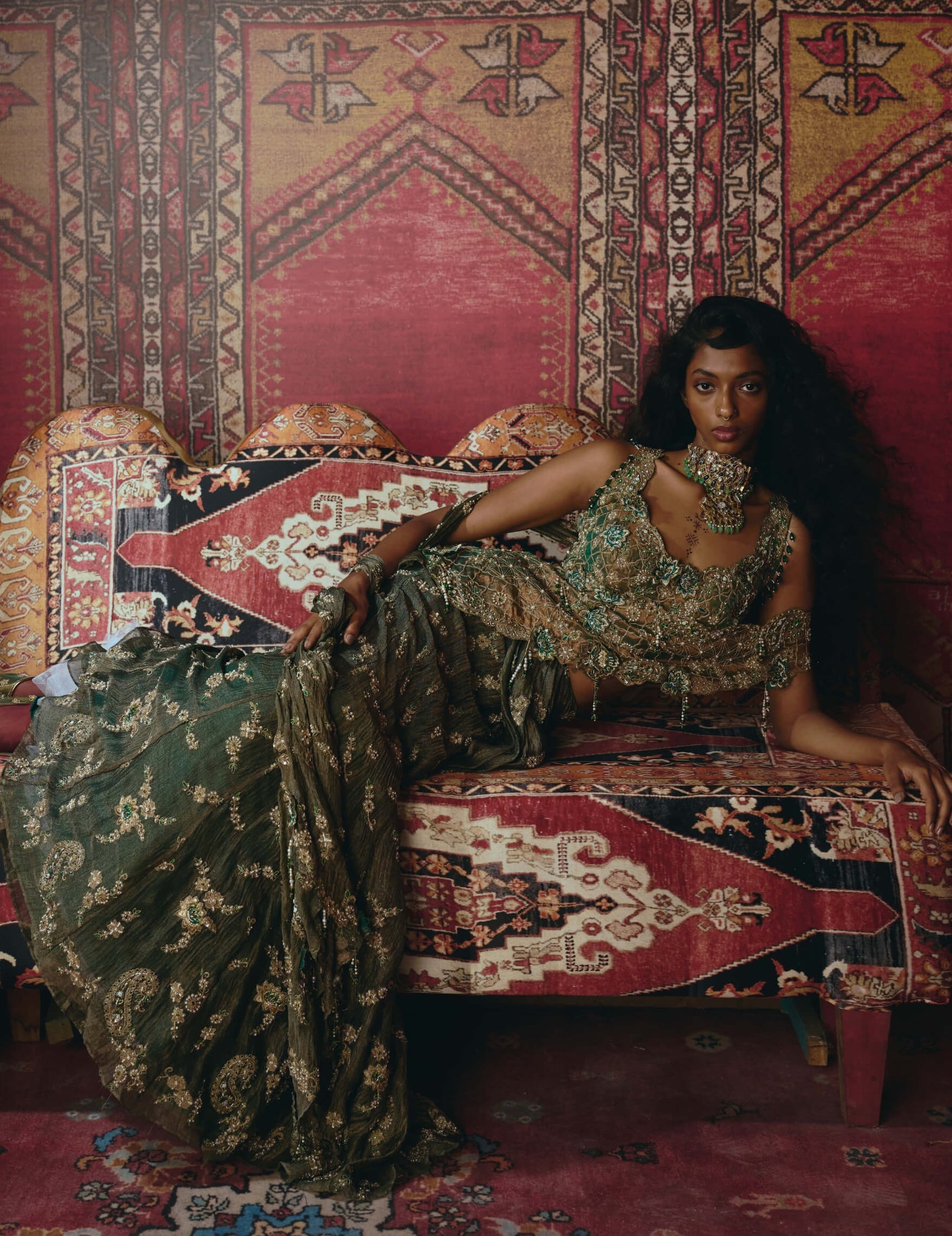 Emerald green crushed tissue draped sari designed with rich embroidery and graceful structure. The ensemble features a kalidar embroidered skirt paired with a fully embroidered wrapped drape that cascades elegantly toward the back. Intricate craftsmanship adds dimension and fluidity, completed with a sleeveless pure tissue blouse finished with textured floral embroidery and latkans.