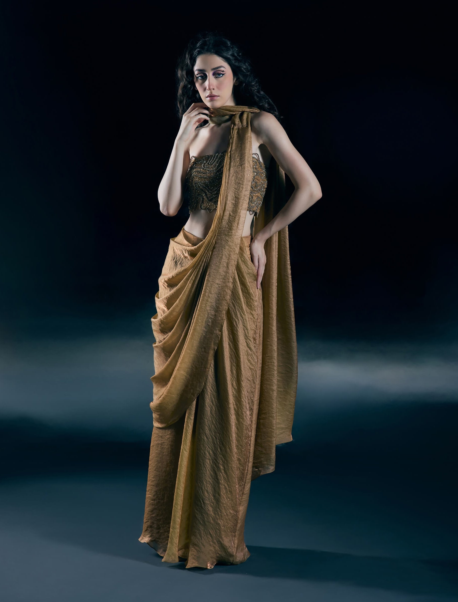 Rendered in sheer metallic organza, this modern pre-draped sari pairs an intricately corded embroidered blouse with a detachable pallu and fluid back cowls for youthful, radiant movement.