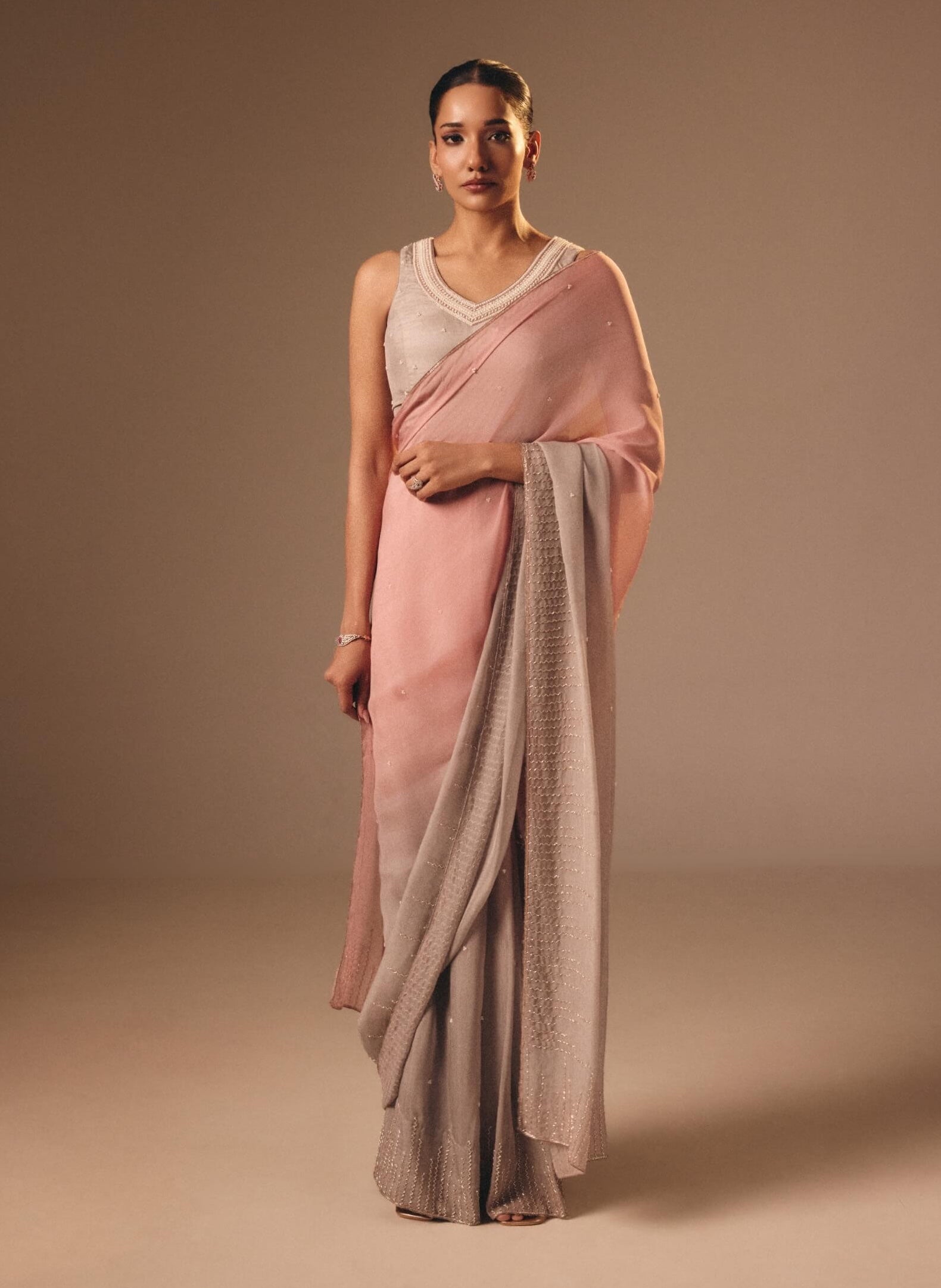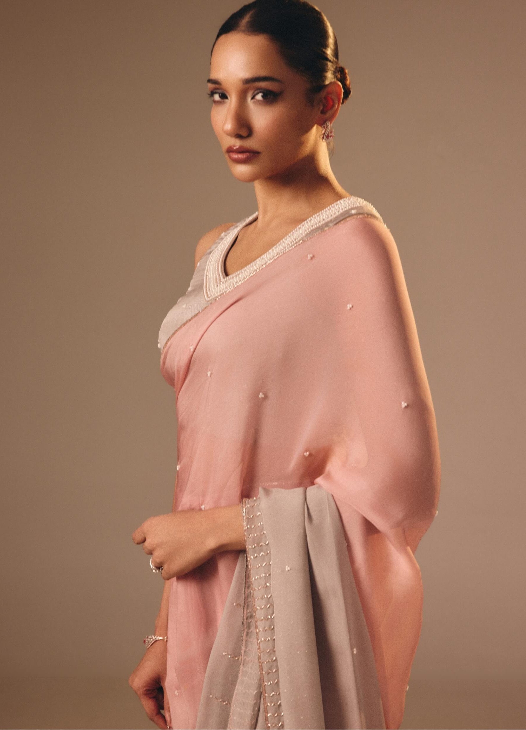 Fluid and fashion-forward, this pink and gray shaded draped sari in satin organza is adorned with pearl chitta and zigzag cutdana embroidery along the pallu. The embroidered blouse completes the statement look.