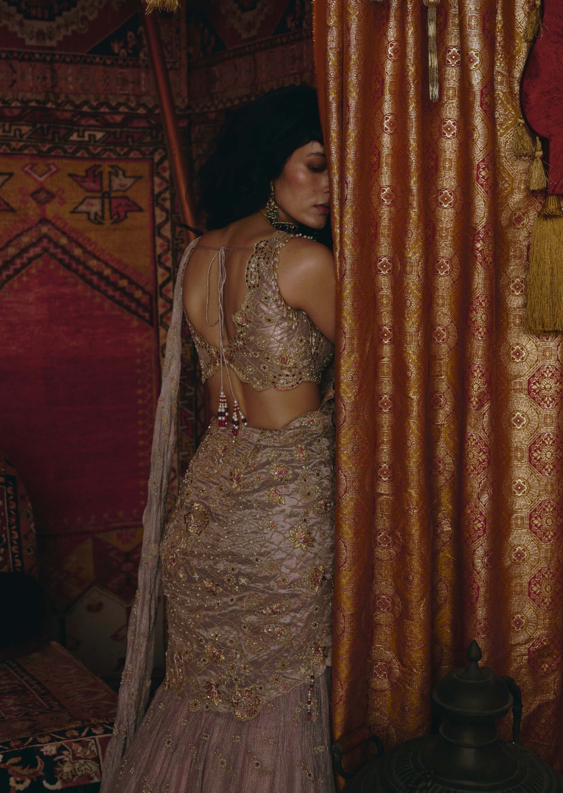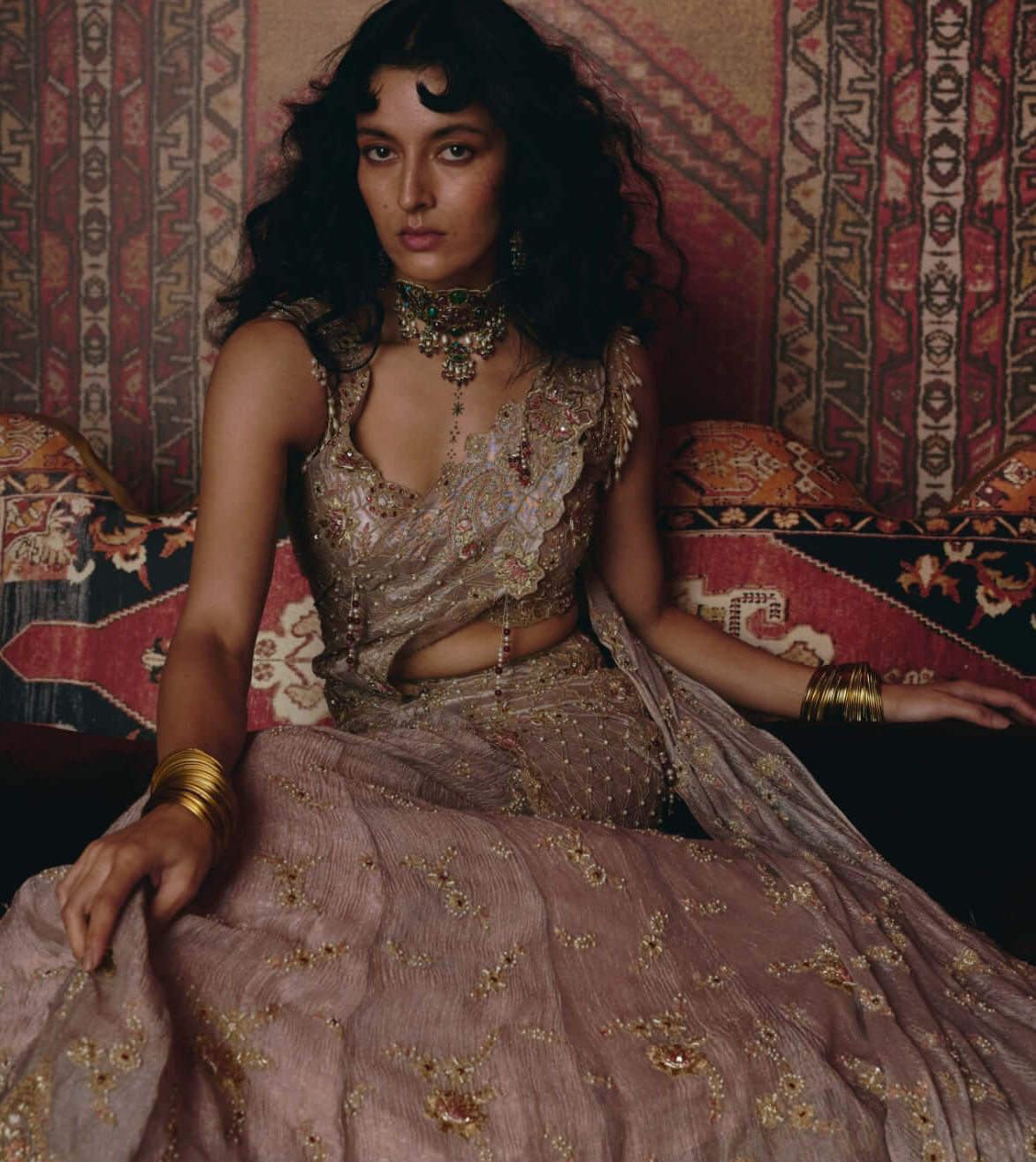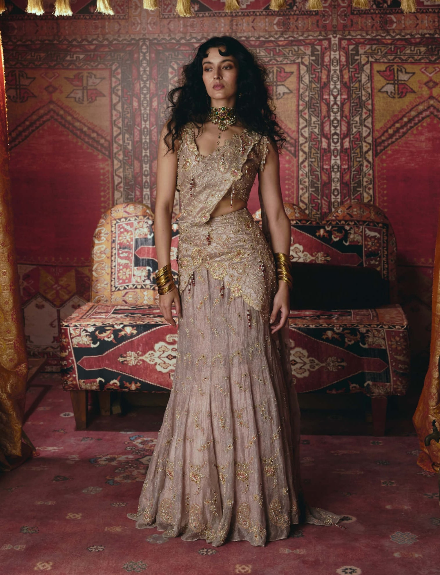 This rose-gold draped saree crafted in crushed tissue exudes soft shimmer and fluid elegance. The richly embroidered design features a kalidar skirt paired with a fully embroidered wrapped drape cascading toward the back. The layered construction adds graceful movement and depth, complemented by a sleeveless pure tissue blouse adorned with floral textures and playful latkans.