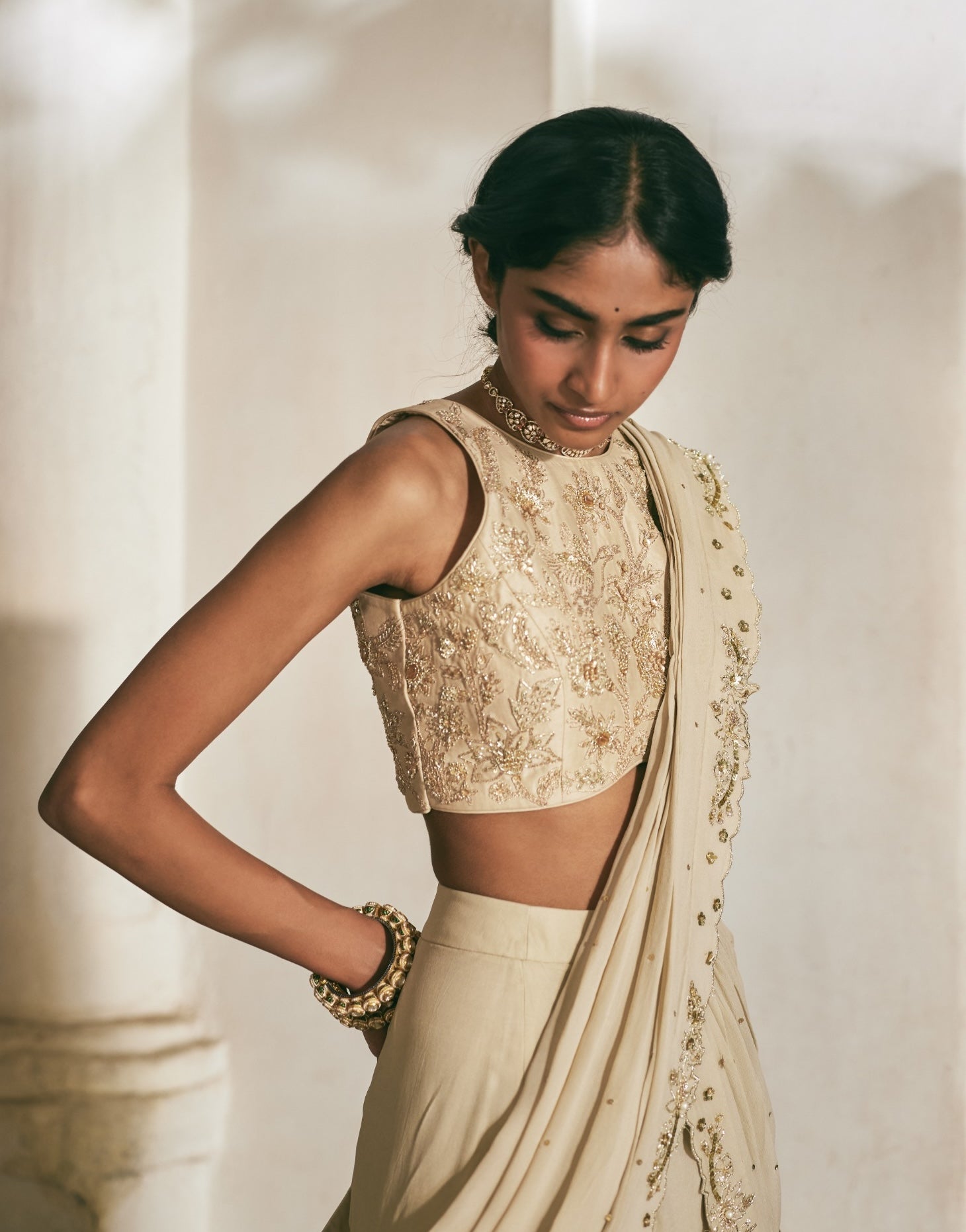 Designed with a modern tiered silhouette, this solid ivory georgette pre-draped sari is elevated with an embroidered pallu and a richly detailed blouse for artisanal depth.