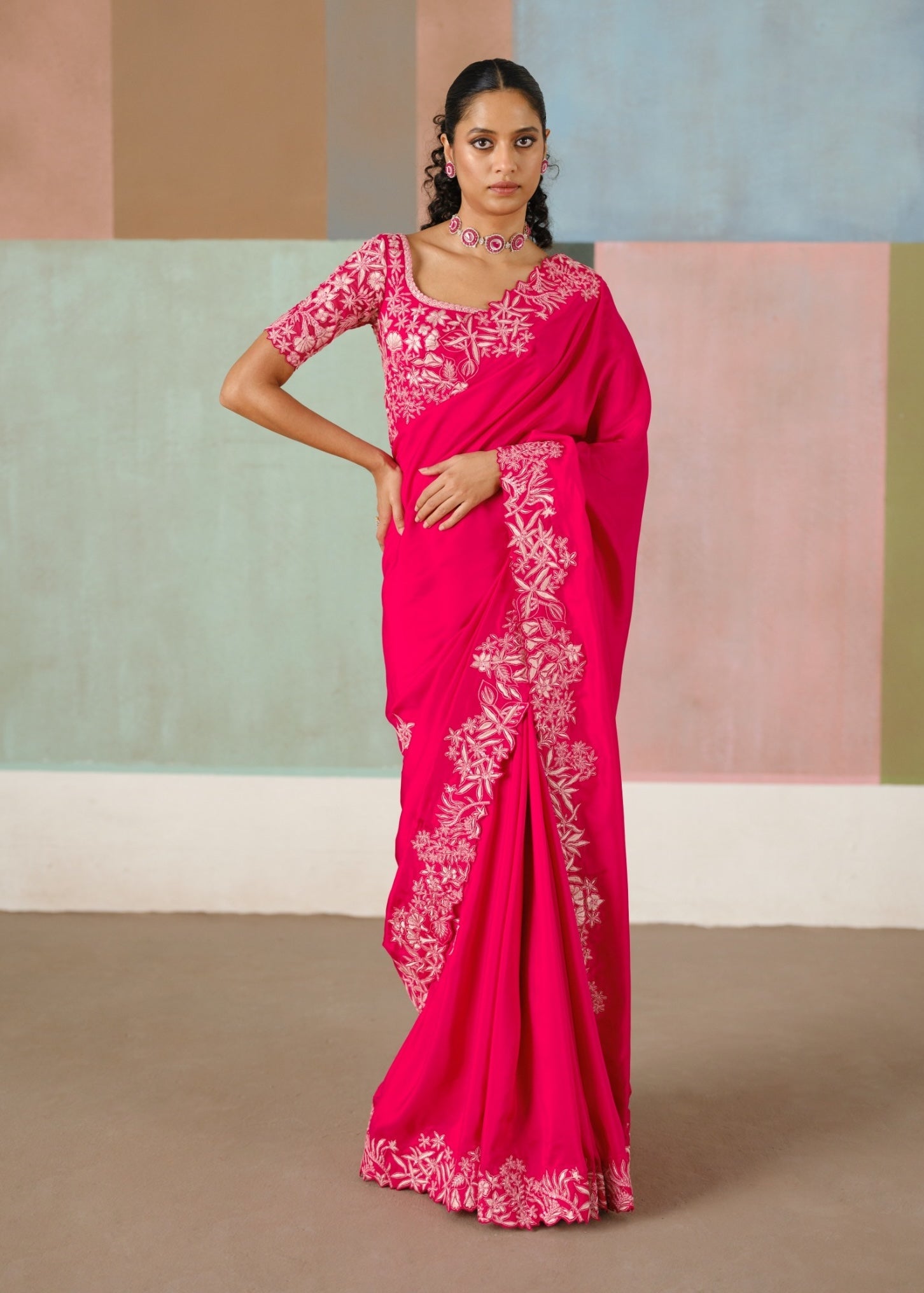 An opulent play of texture and movement, the vida sari set fuchsia showcases intricate embroidery and thoughtful craftsmanship. The silhouette balances fluidity with structure, creating a look that feels both graceful and contemporary. Rich textures and refined detailing add depth without overwhelming the ensemble. Perfect for cocktail nights, sangeets, festive soirées, and destination wedding celebrations. Style with sculptural jewellery and confident heels for a polished, memorable finish.