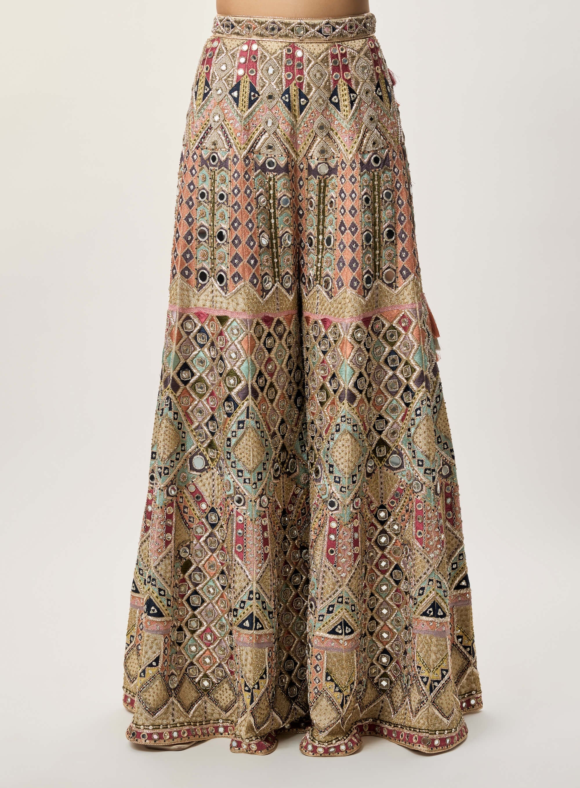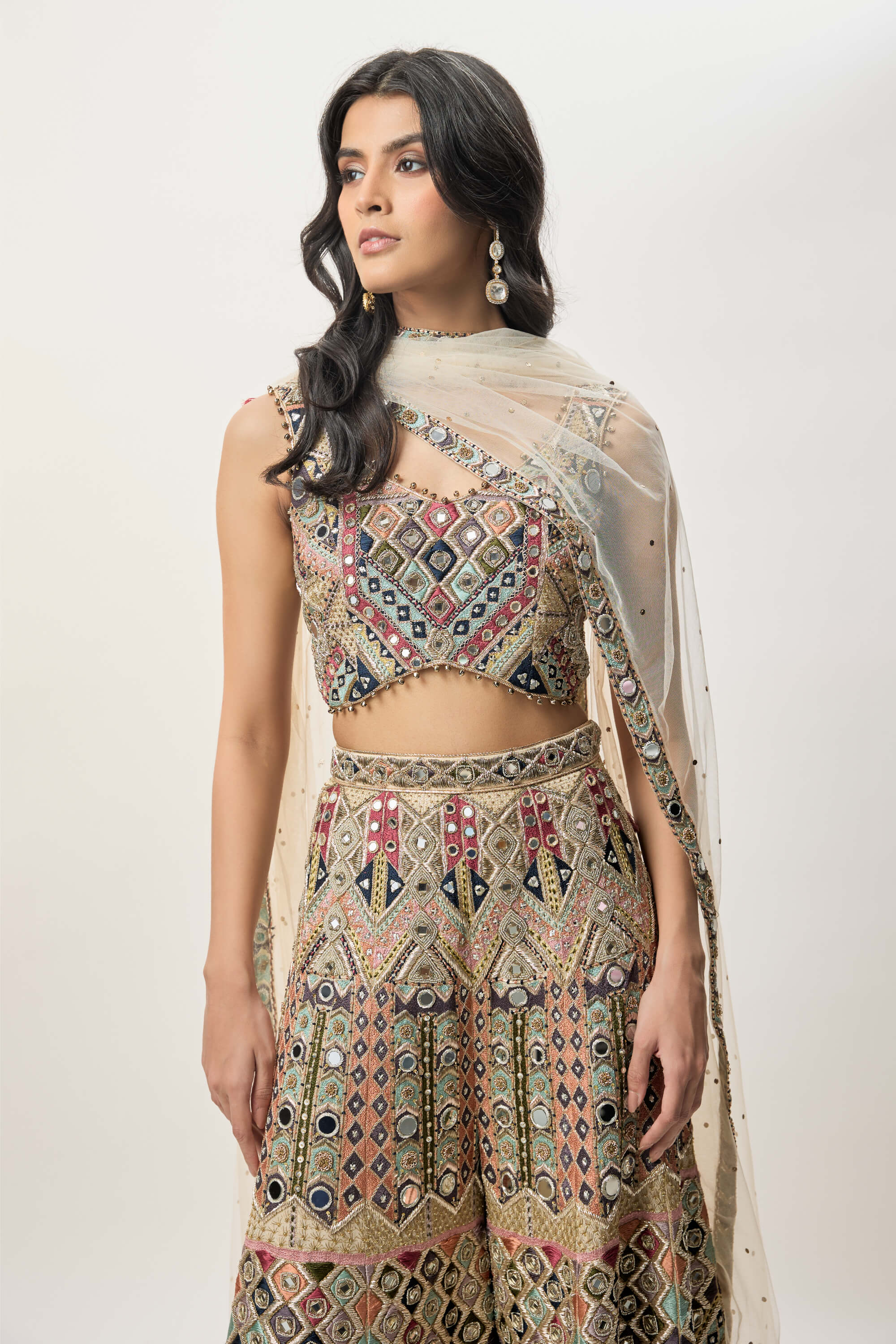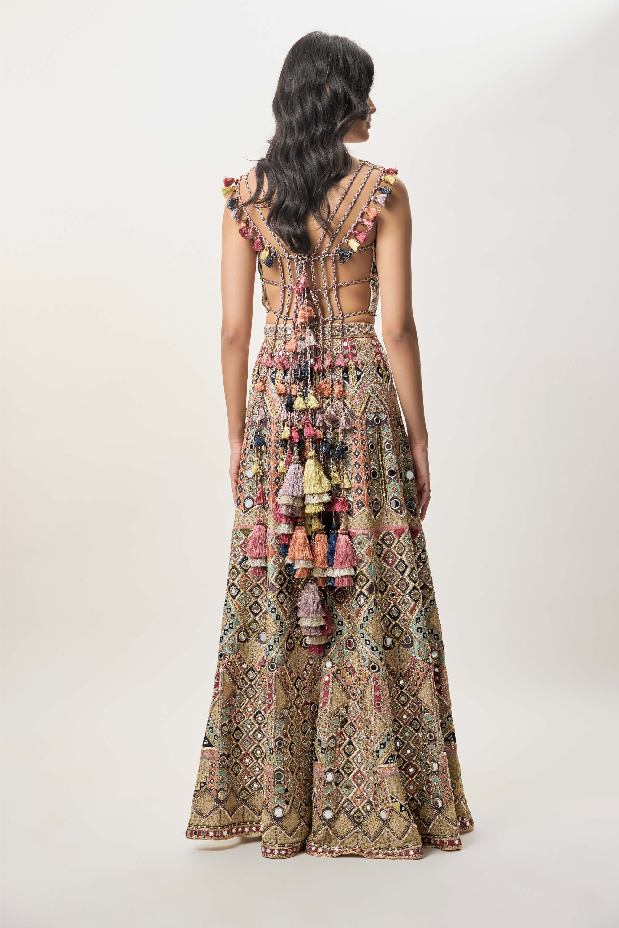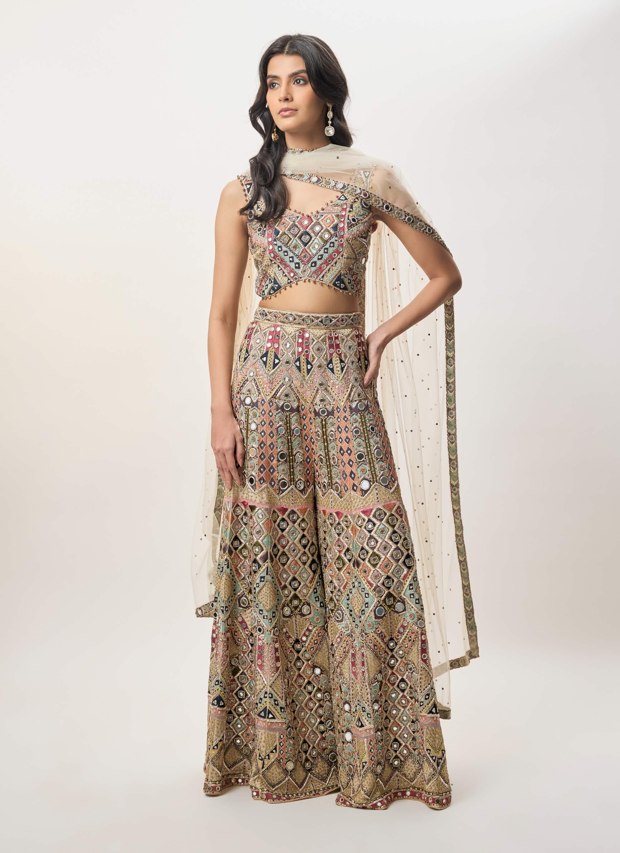 A champagne georgette choli detailed with mirror and thread embroidery. Tassel tie-ups at the back add a playful finish. Paired with an embroidered sharara for graceful movement. Completed with a sheer mukaish net dupatta for light elegance.