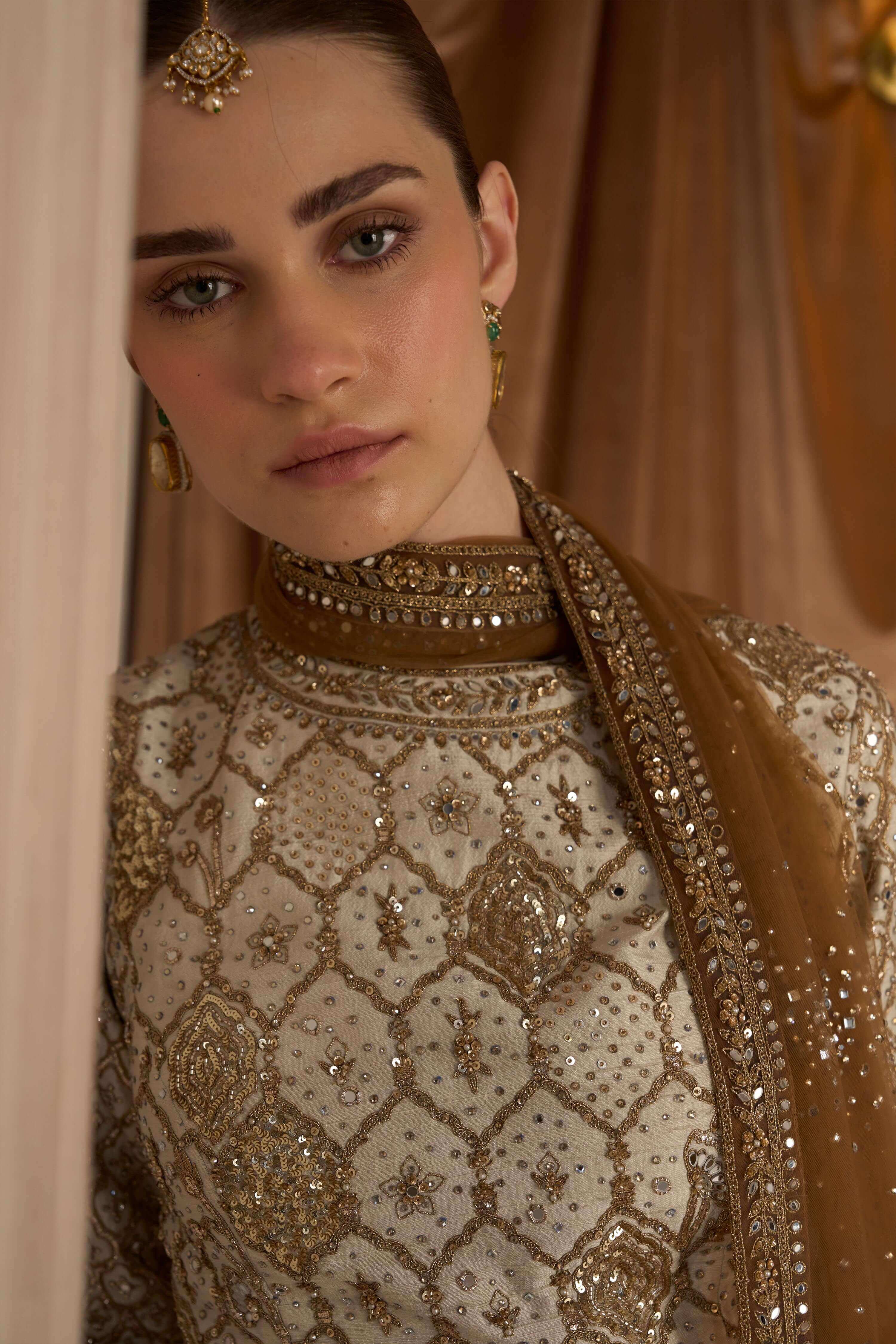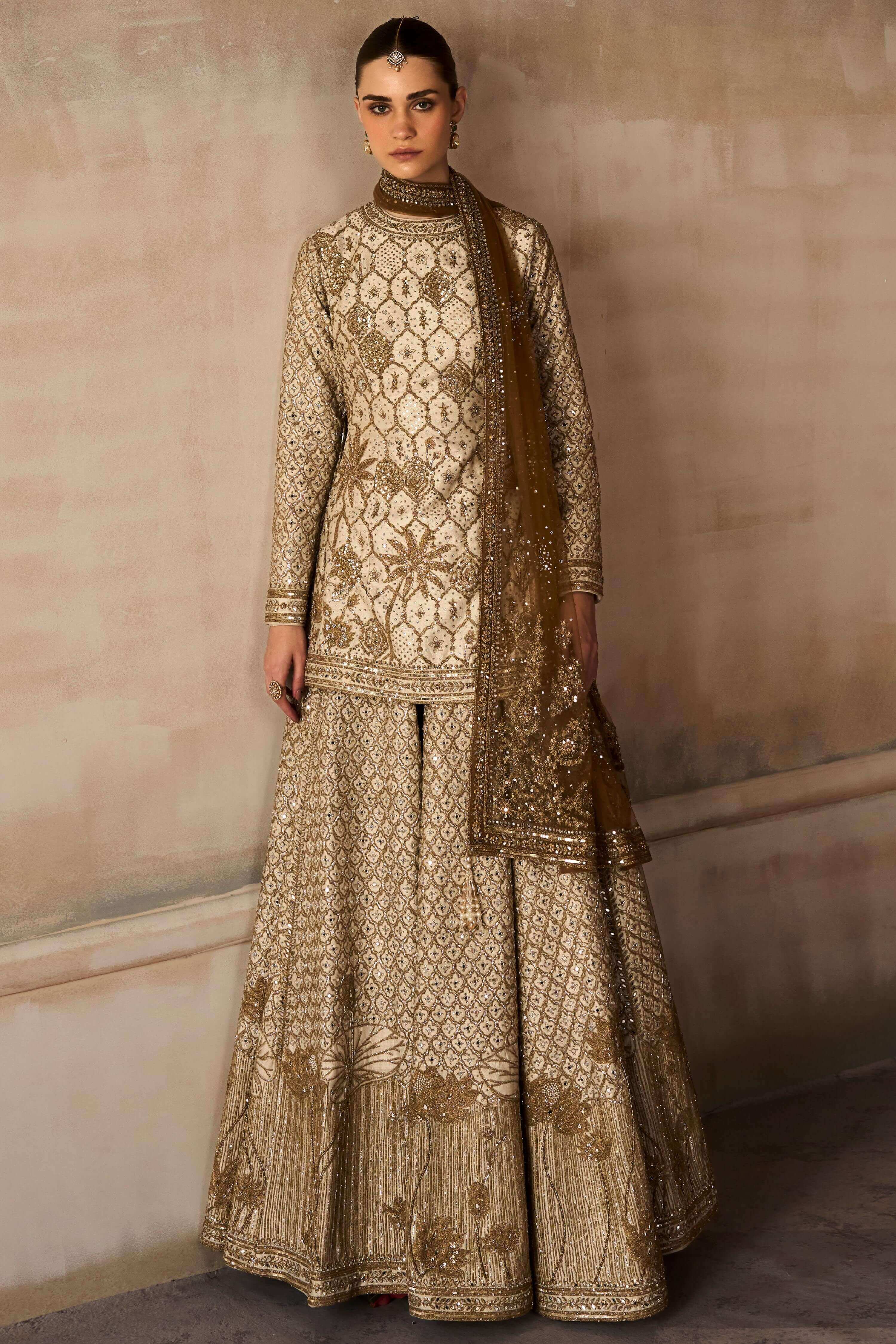 A graceful interpretation of heritage couture, this aged ekru Rambagh silk sharara is detailed with antique gold kirandori, vintage zardozi and crystal accents. The intricate craftsmanship enhances the rich silk base with timeless elegance. Perfect for engagement ceremonies, mehendi functions and refined wedding festivities.