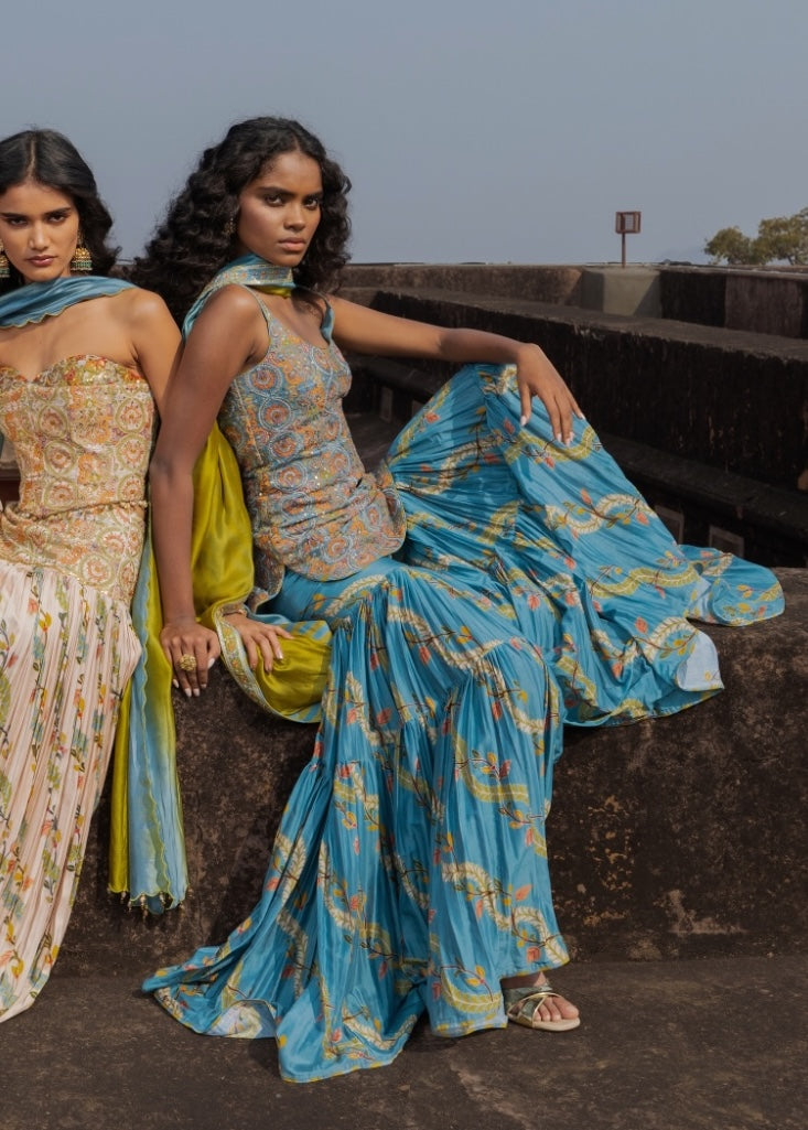 A classic noor gharara set rendered in mist blue and dry henna hues. Flowing layers and ornate detailing lend timeless sophistication. Ideal for wedding rituals, festive gatherings, and traditional soirées.