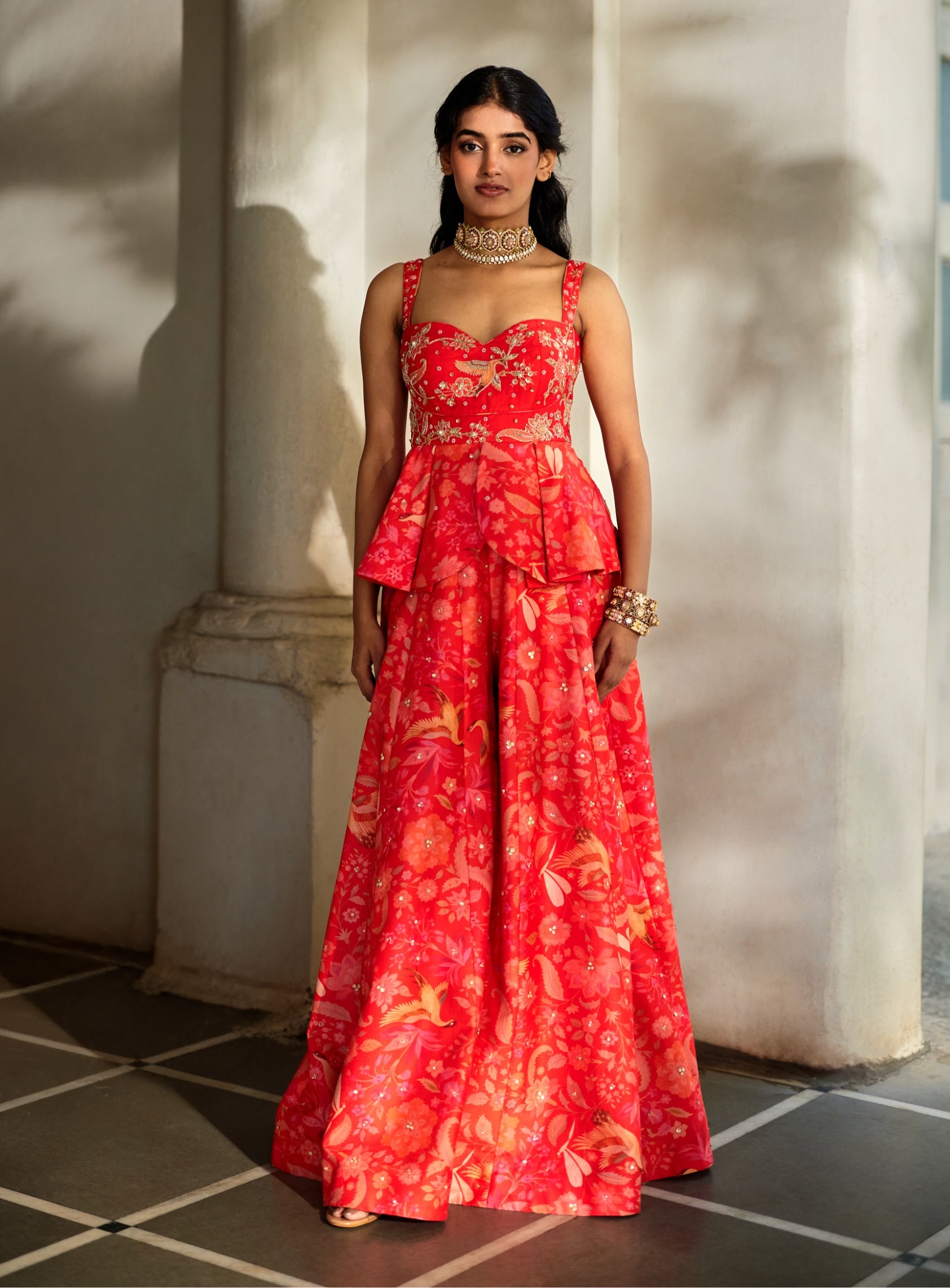 A peplum and palazzo set designed for charm and fluidity. The peplum top features a sweetheart neckline with hand embroidery on the yoke, complemented by a structured box-pleated silhouette. It pairs effortlessly with same-print palazzos accented with minimal embroidery highlights.