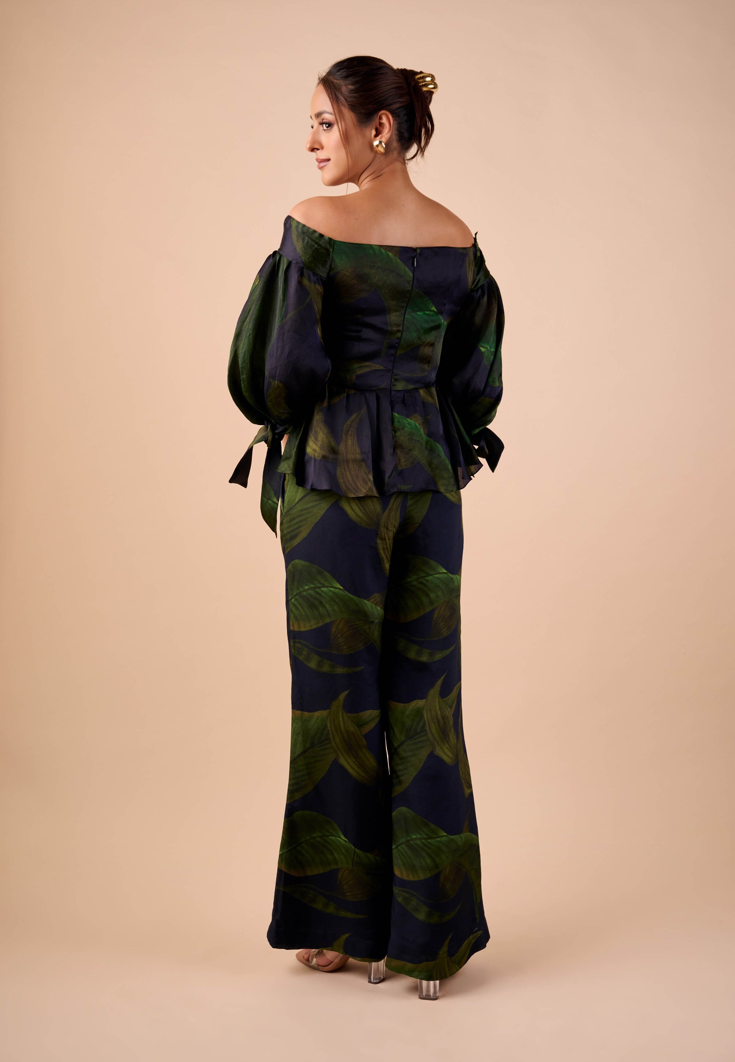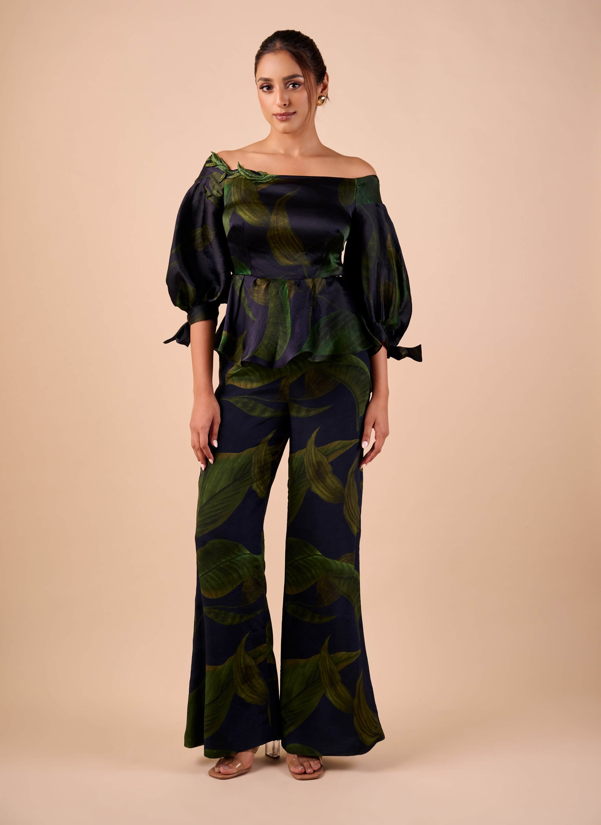 Graceful and artfully detailed, this set pairs an off-shoulder organza peplum top with fluid Habotai silk pants — both featuring an exclusive hand-drawn leaf print that captures nature’s elegance with a contemporary twist. The top enchants with voluminous sleeves, delicate tie accents, and intricate leaf embroidery along the neckline, offering a romantic yet refined silhouette. Complemented by the silk pants’ luxurious drape and soft sheen, the ensemble is perfect for day weddings, elegant soirées, or elevated garden events. A harmonious blend of femininity and craftsmanship, this look makes a poised and modern impression.