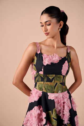 Classic femininity meets floral grandeur in this cotton midi dress, with a striking hydrangea print and pleated fit-and-flare shape. Delicate 3D petals add dimension—ideal for garden parties, engagement brunches, or daytime festivities.