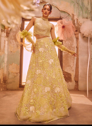 Elevate your bridal look with an exquisite eight-panel handcrafted floral skirt set, designed to enchant and captivate. The bridal skirt features intricate floral embroidery with delicate pearl highlights, adding a touch of timeless elegance to your ensemble. Paired perfectly with a draped fringe top crafted from airy tulle base fabric and adorned with cascading fringes, this set exudes romance and sophistication.