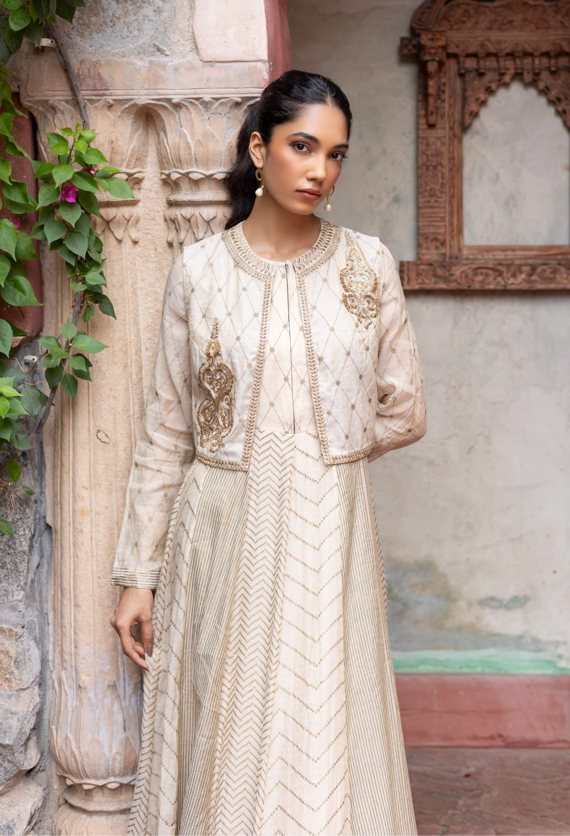 An ethereal blend of texture and print, this ivory paisley embroidered crop jacket paired with a maheshwari printed anarkali defines quiet luxury. Ideal for festive luncheons or day weddings, it exudes understated sophistication. A luminous celebration of heritage detailing in modern form.