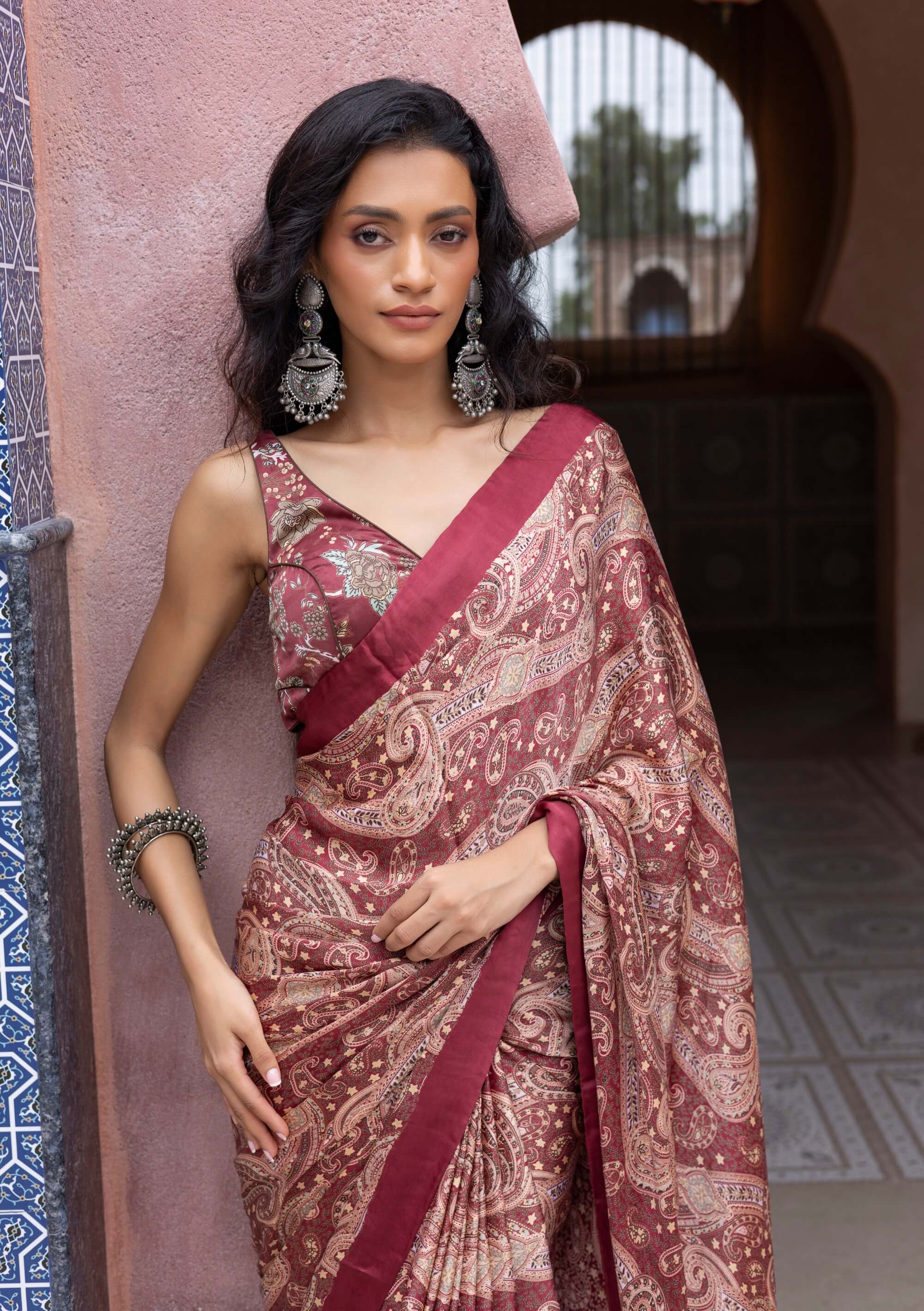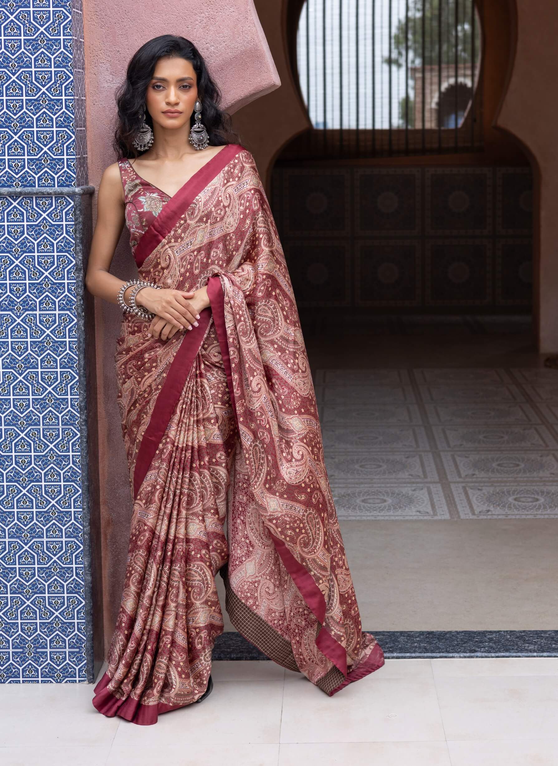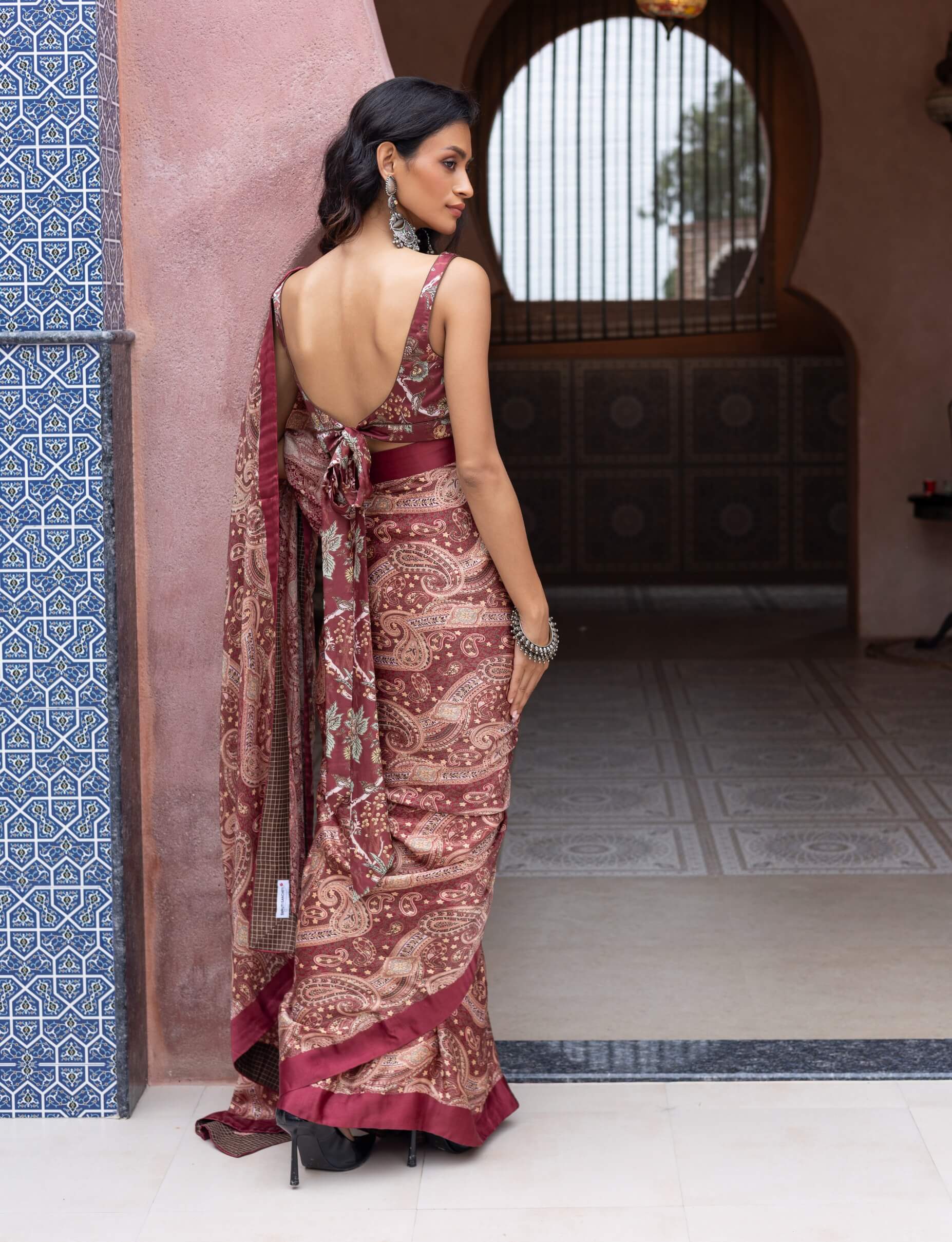 Drape yourself in elegance with this maroon satin sari featuring paisley prints and a chintz satin tie-back blouse. The tonal harmony and tie-back detail bring a modern edge to a classic form. Perfect for receptions, family gatherings, or intimate evening events.