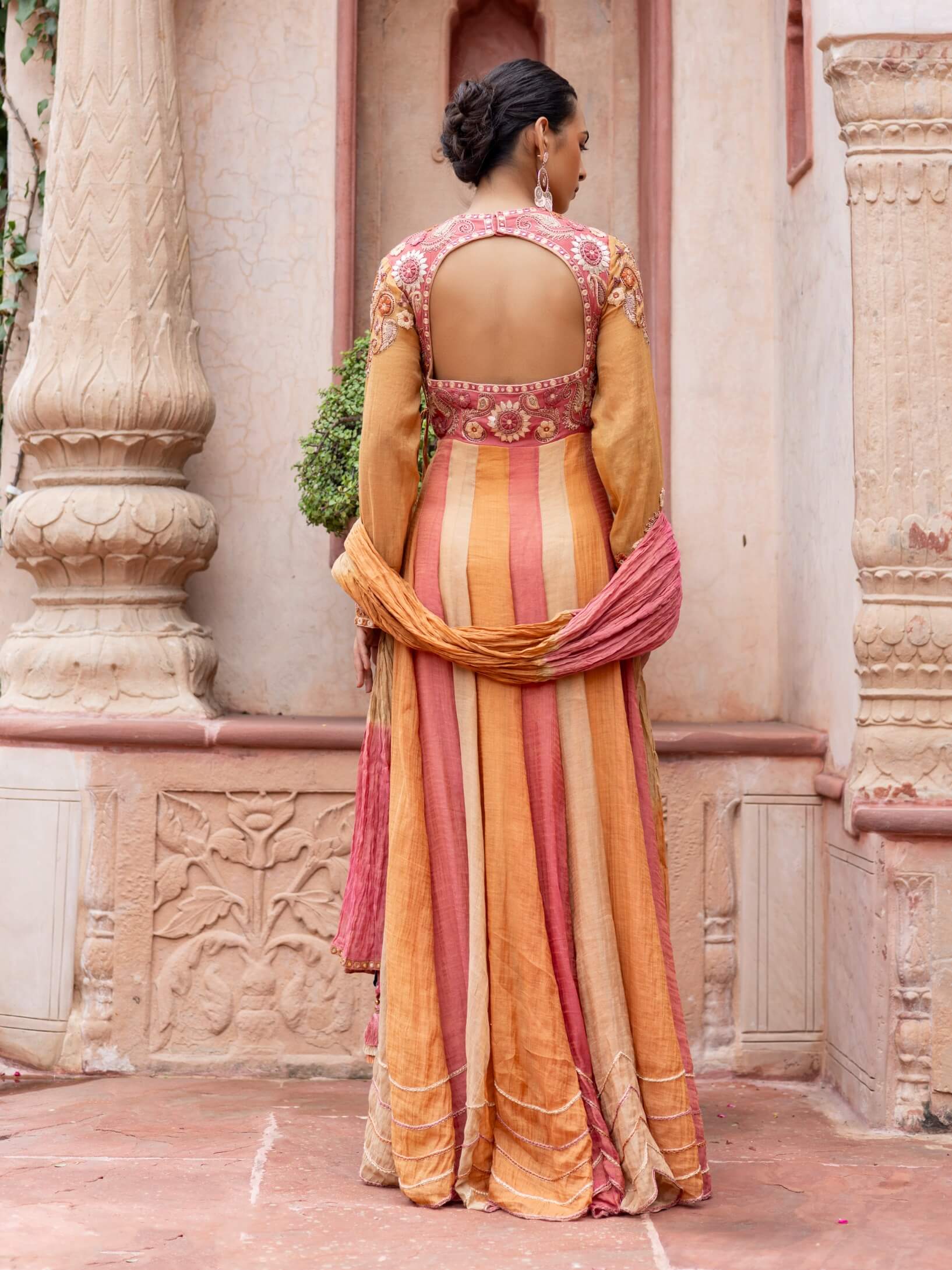 Bursting with color and craft, this multicolored maheshwari embroidered anarkali with an ombre dupatta celebrates vibrancy in every stitch. Perfect for festive soirées or wedding festivities, it flows with energy and sophistication. A statement piece that bridges tradition and artistic flair.
